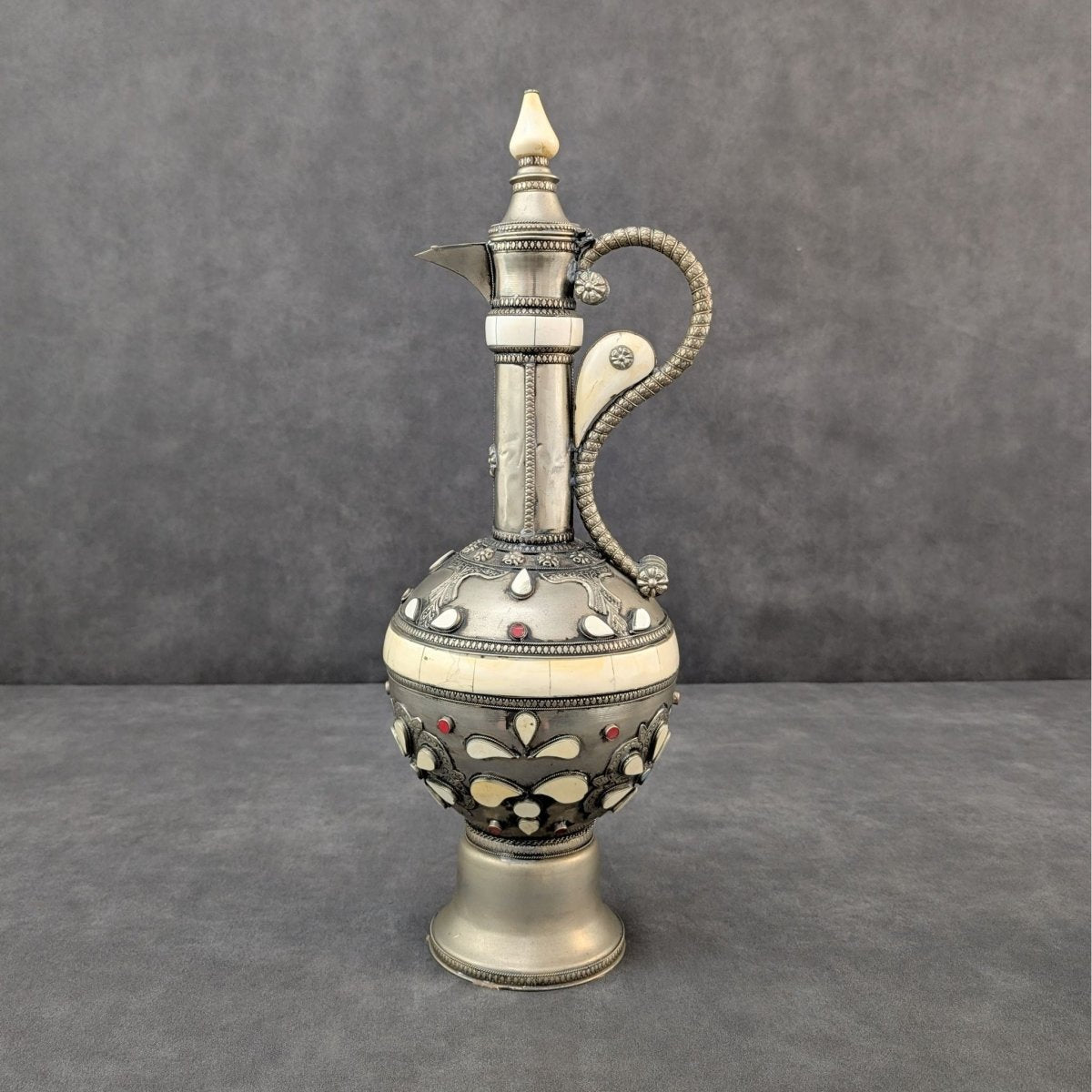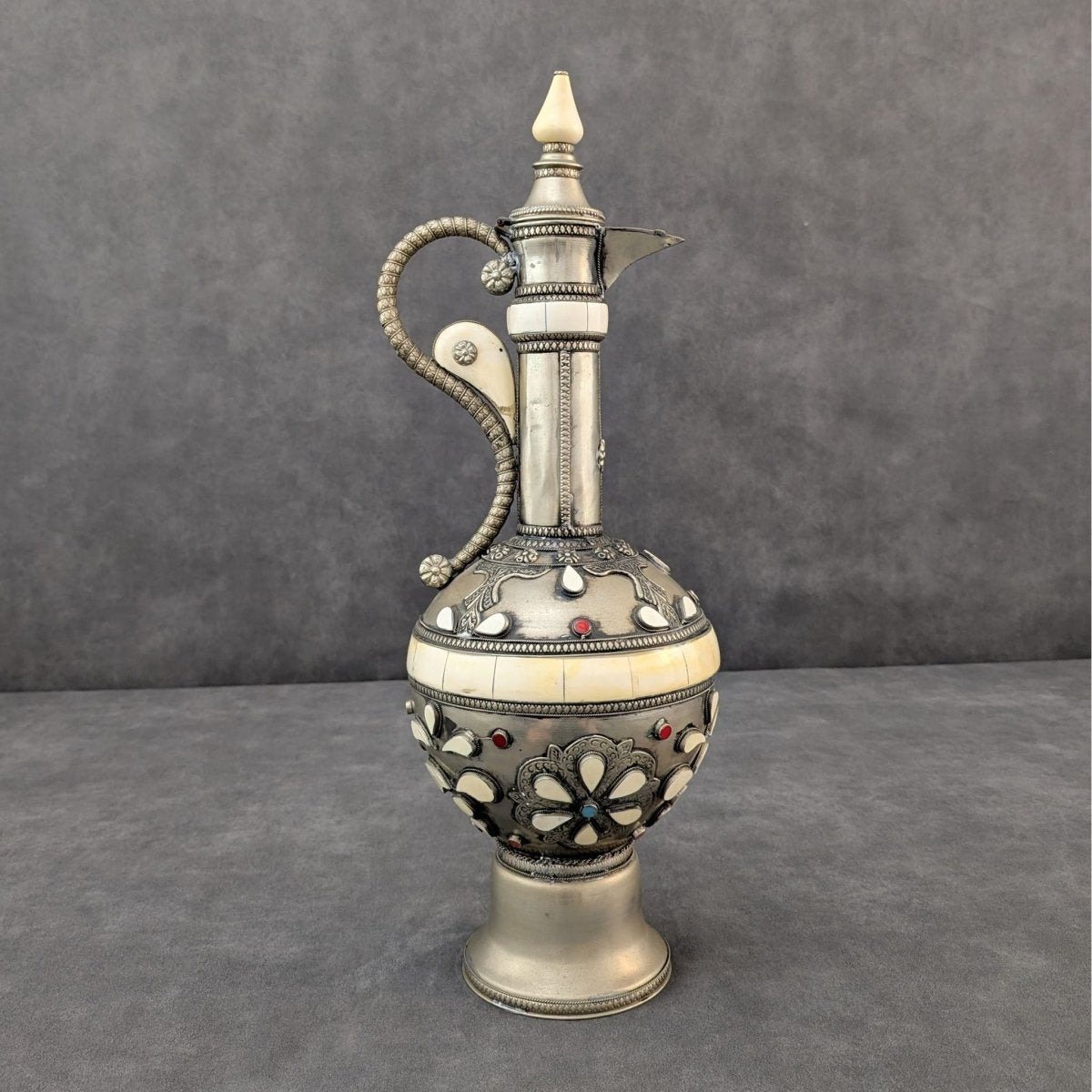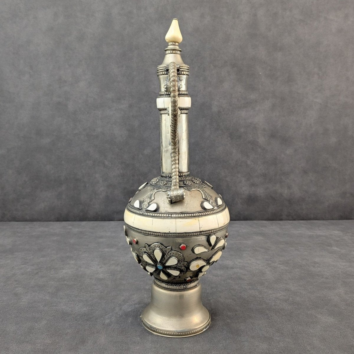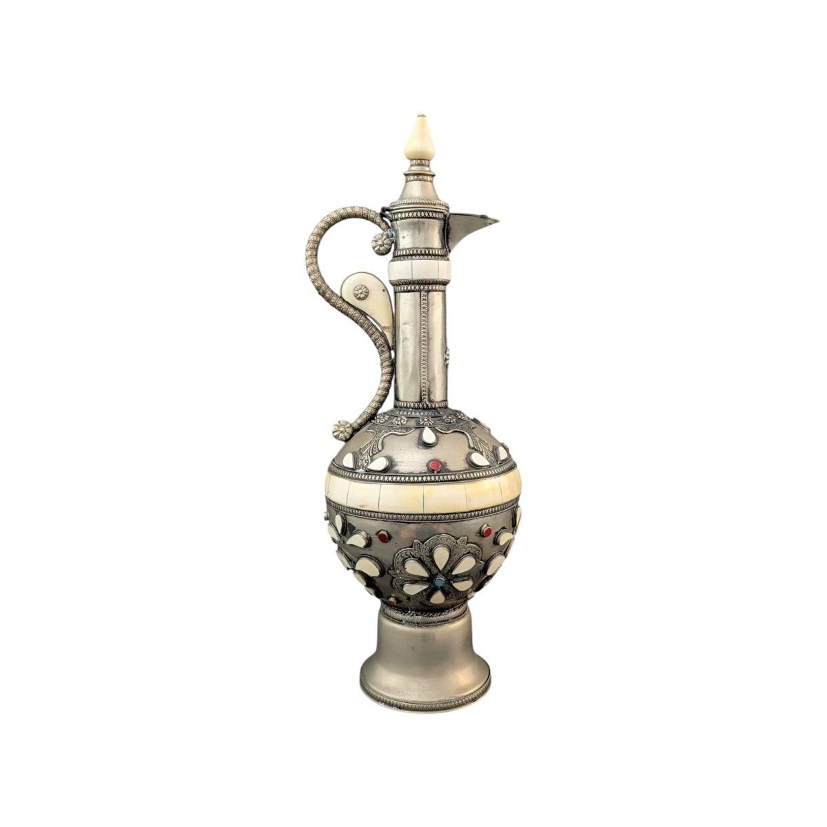 A vessel shaped for ceremony, carrying the quiet theatre of metalwork that was made to stand out in a room. Crafted in the mid twentieth century, this tall ewer was produced in India using nickel silver alloy with decorative bone inlay and coloured cabochons. The metal has the soft sheen associated with traditional white metal work, detailed with raised motifs that echo older Indo Persian design. Its height gives it a sculptural presence while the inlaid patterns turn it into an ornamental object that once signalled status during formal gatherings. It carries the atmosphere of ceremonial craft and the expressive embellishment that defined decorative Indian metalware of the period.