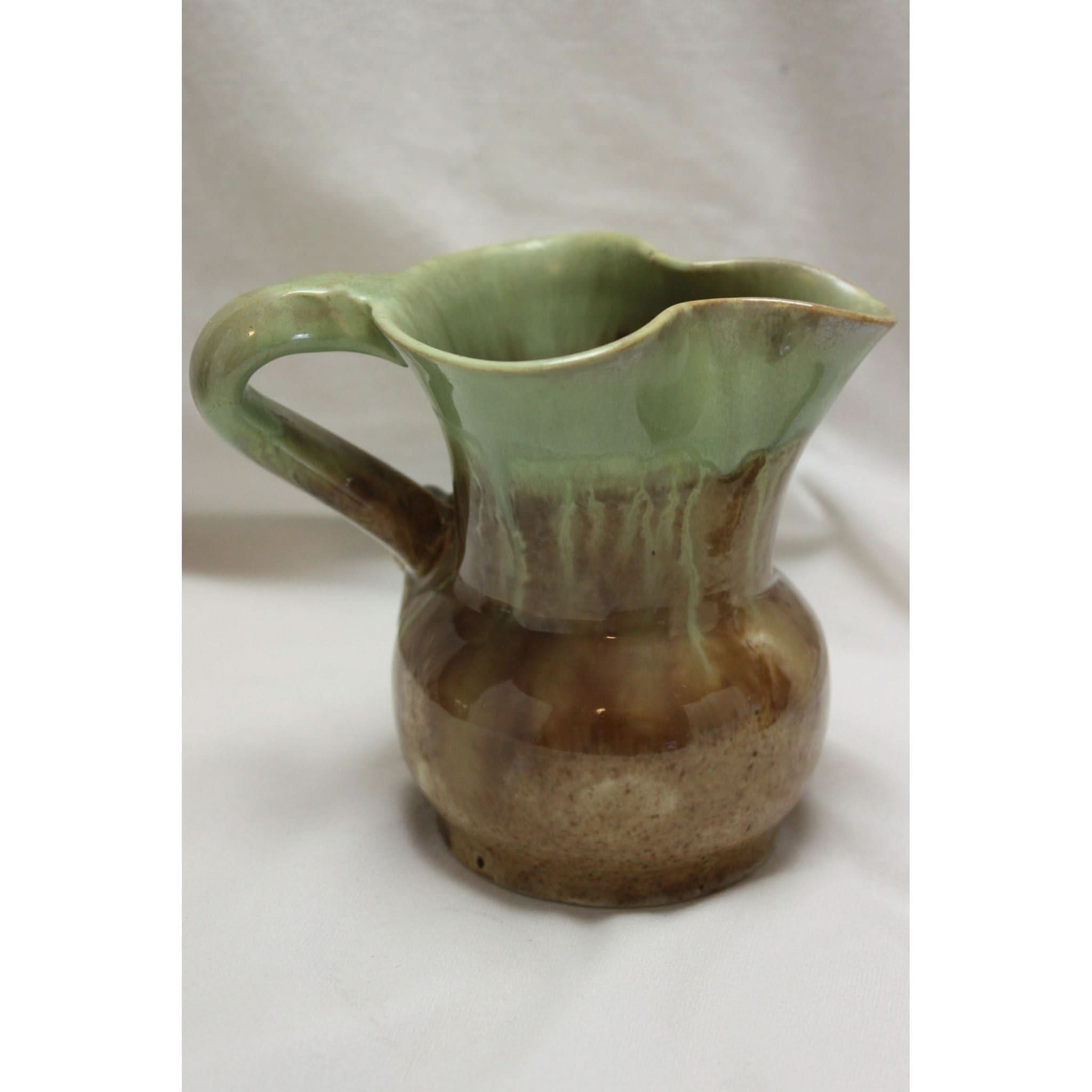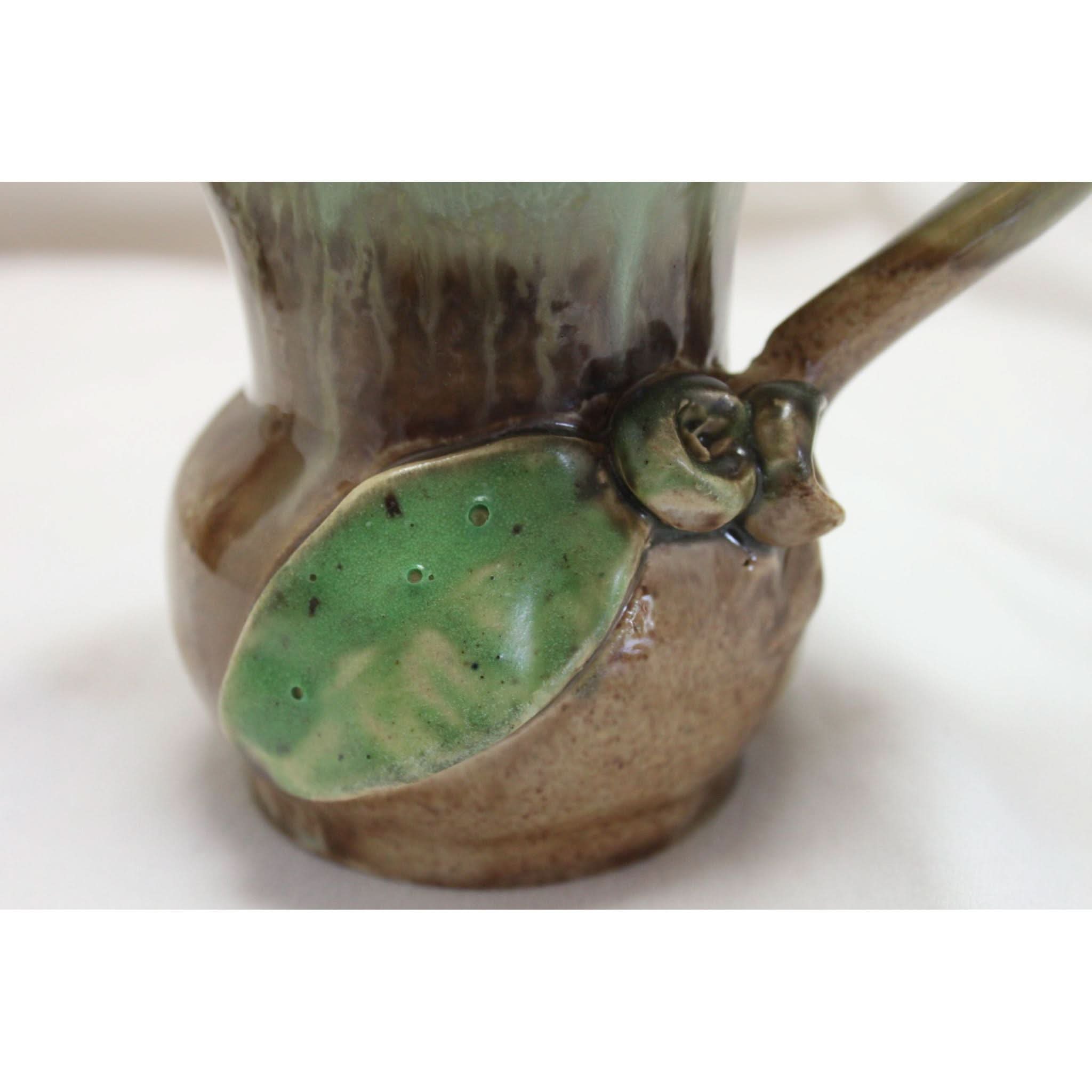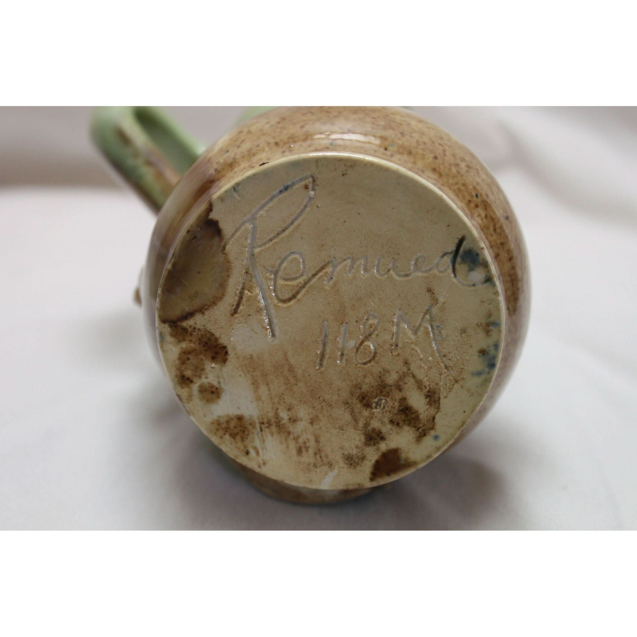 This small Remued jug is decorated with a pair of gumnuts and a single leaf. The body is glazed with a light green at the top that flows down over a speckled brown glaze. It stands 110 mm high and the base is incised "Remued 118M". The overall condition is very good, but there are 3 small glaze blisters on the gumleaf that are ex-factory. It would from 1934-36.