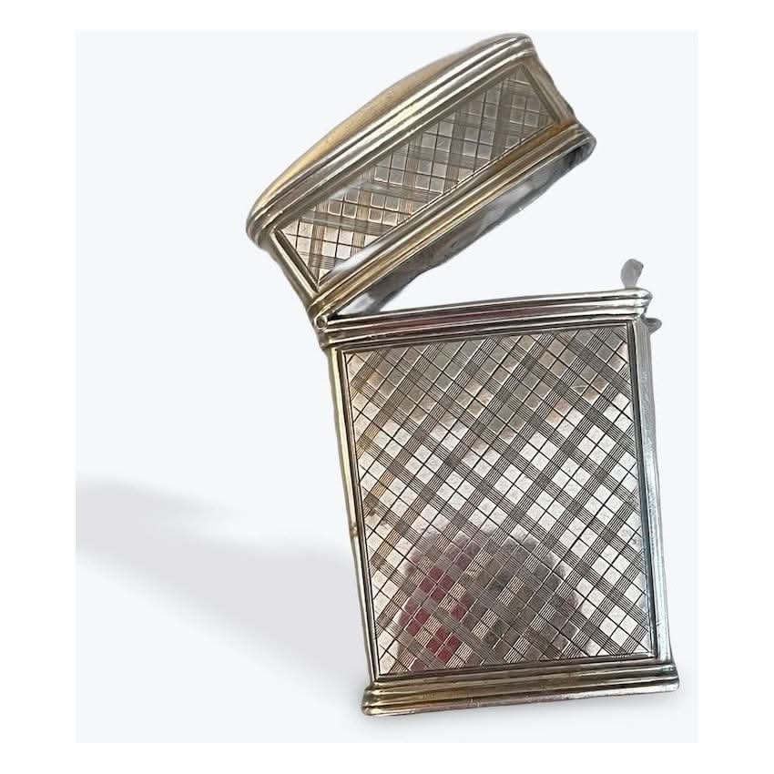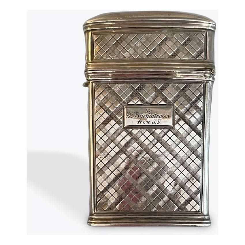 This elegant English sterling silver vesta case, made around 1838 by Taylor & Perry, highlights 19th-century craftsmanship. It has a lovely inscription and a detailed etched design, showcasing the skill of its era. Taylor & Perry's dedication to quality makes this item a wonderful collectible that represents sophistication and classic beauty, whether on display or for use. Size: 6cm h x 4cm w