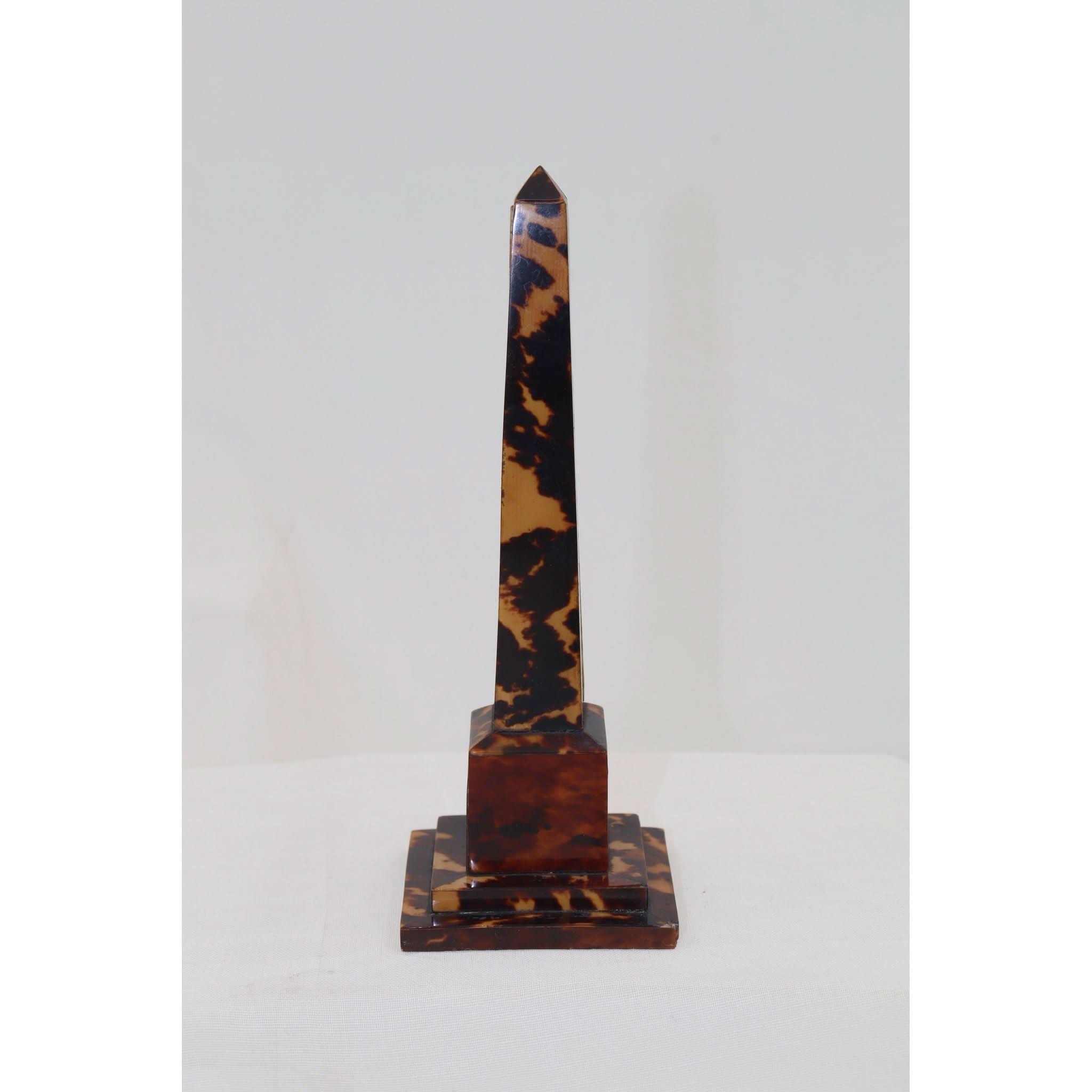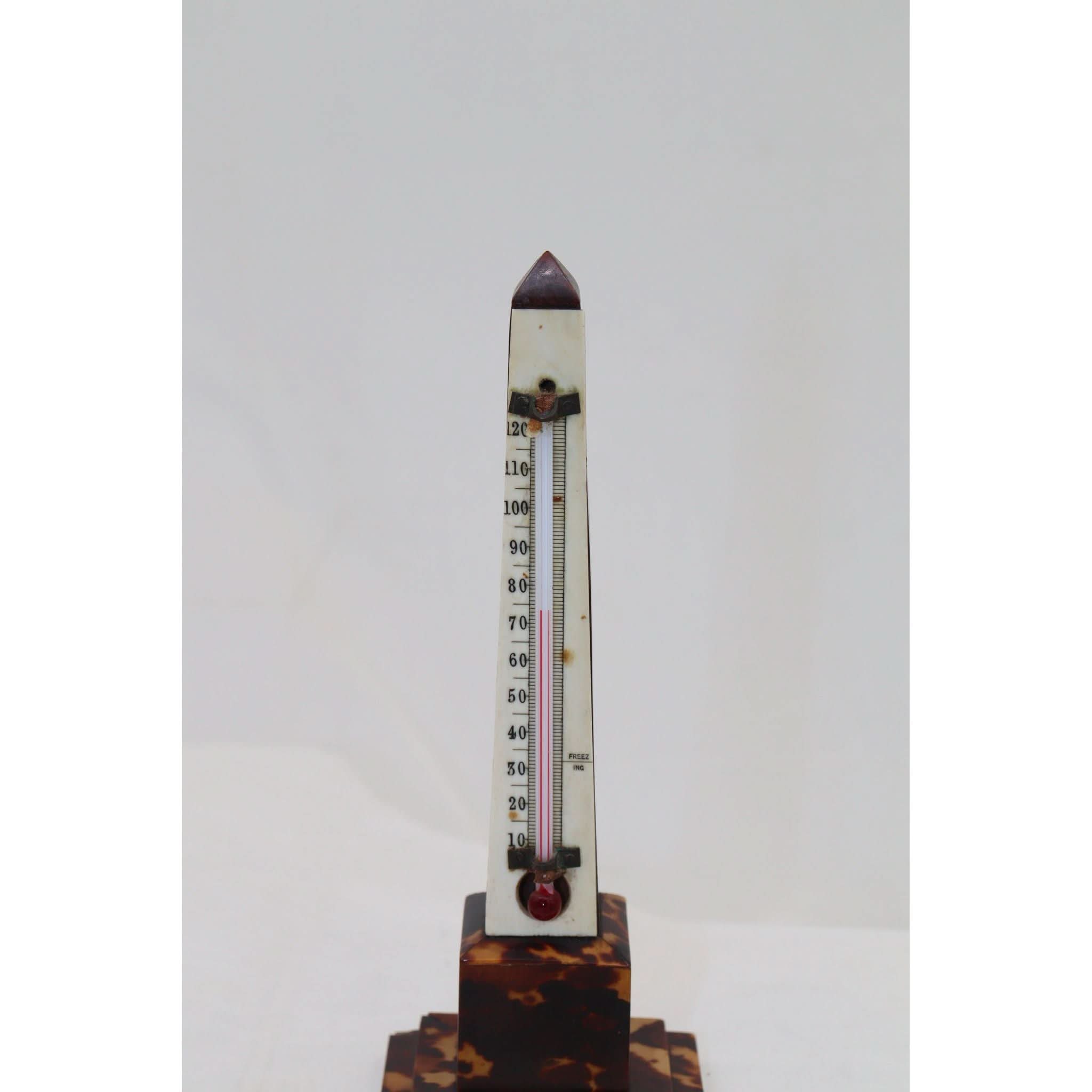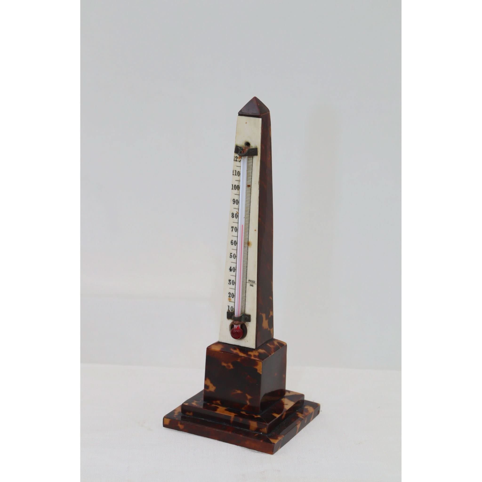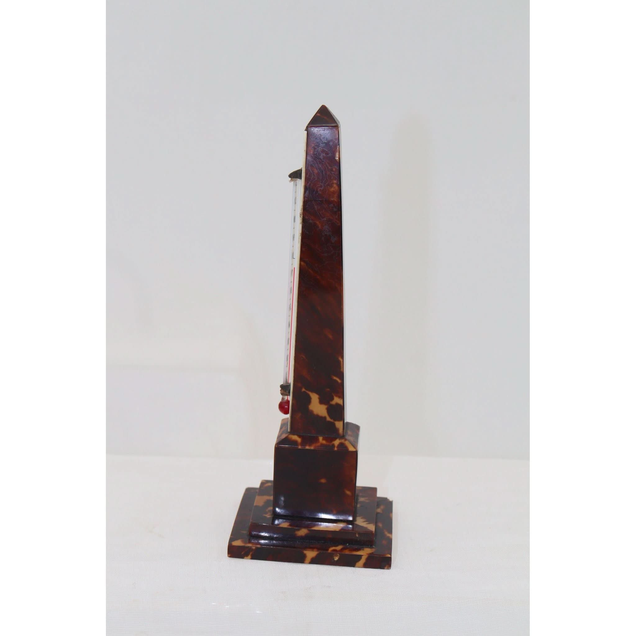 This obelisk shaped desk thermometer stands 172 mm (6.75 inches) high and the stepped plinth base measures 63 mm (2.5 inches) square. It is veneered with tortoiseshell, and the thermometer sits on a graduated bone backing. It has lost a very small area of tortoiseshell from the corner of the plinth to the rear, and the thermometer, which still reacts to temperature changes, appears to have lost the top of the tube. C1880.