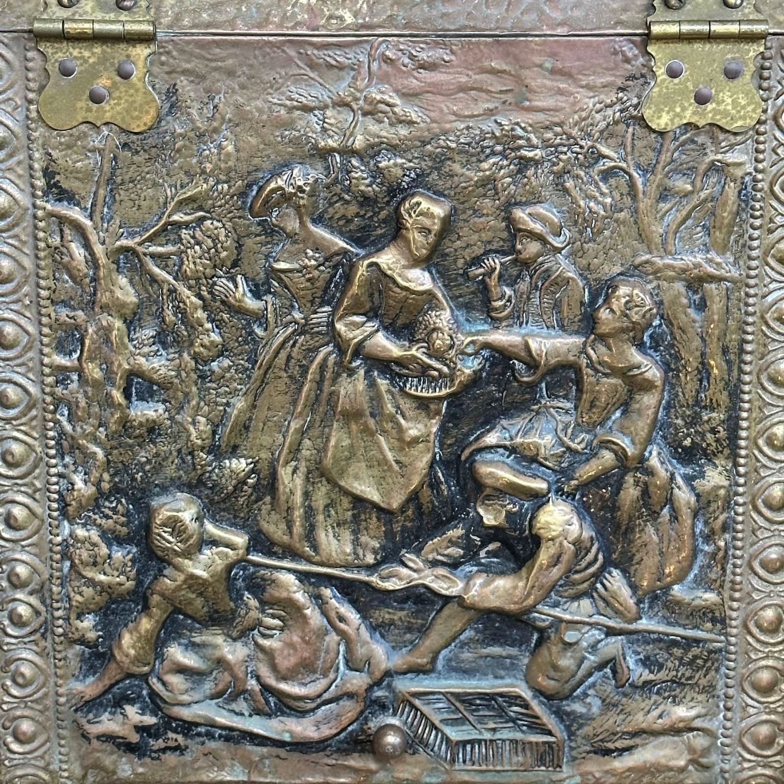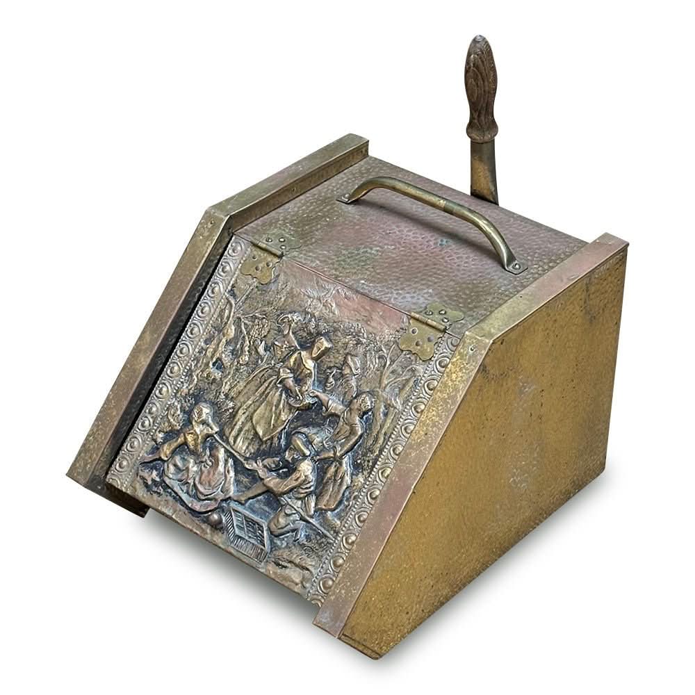 A beautifully embossed English coal scuttle with lift up lid and shovel, crafted in England c.1870.