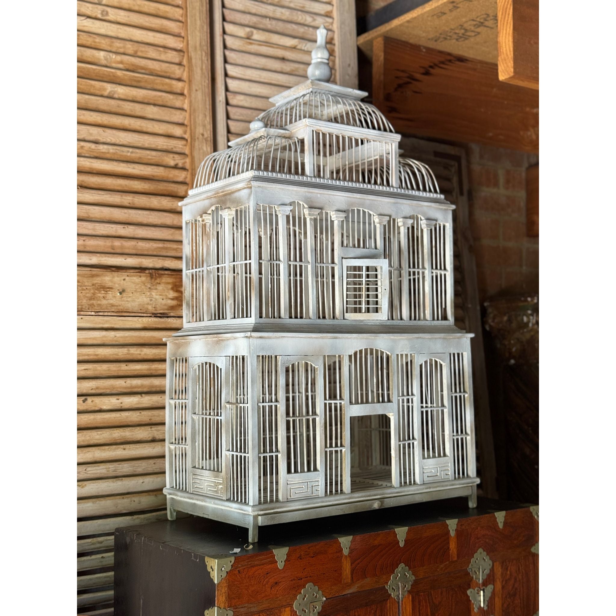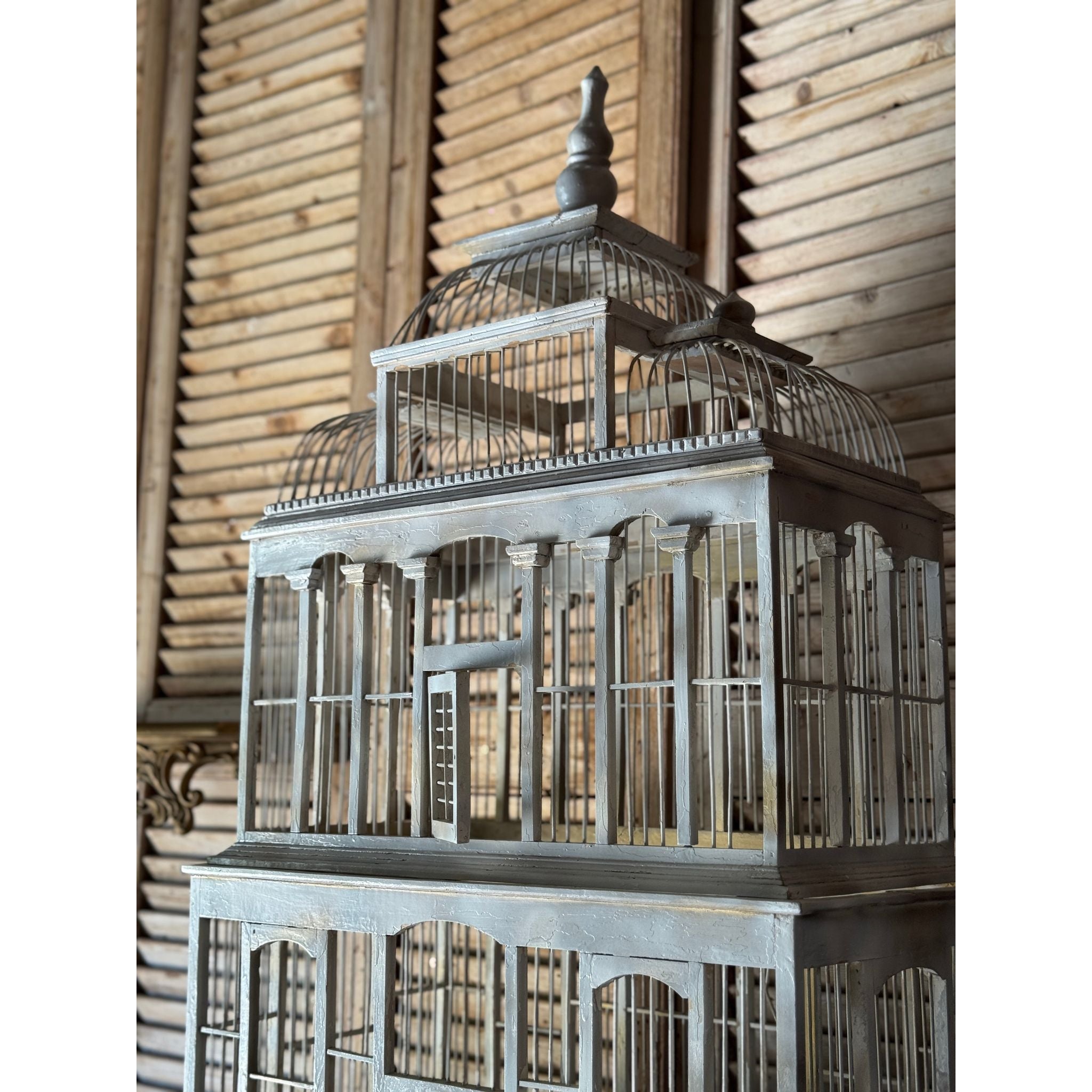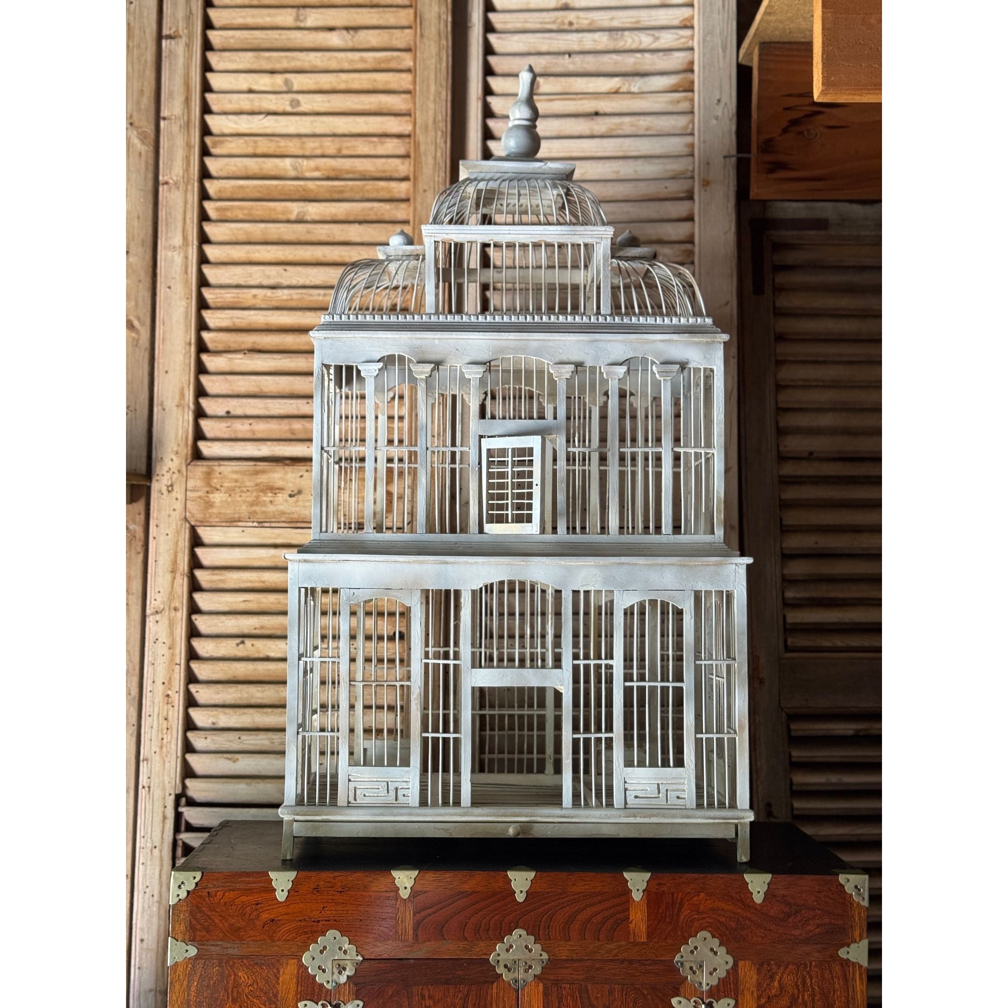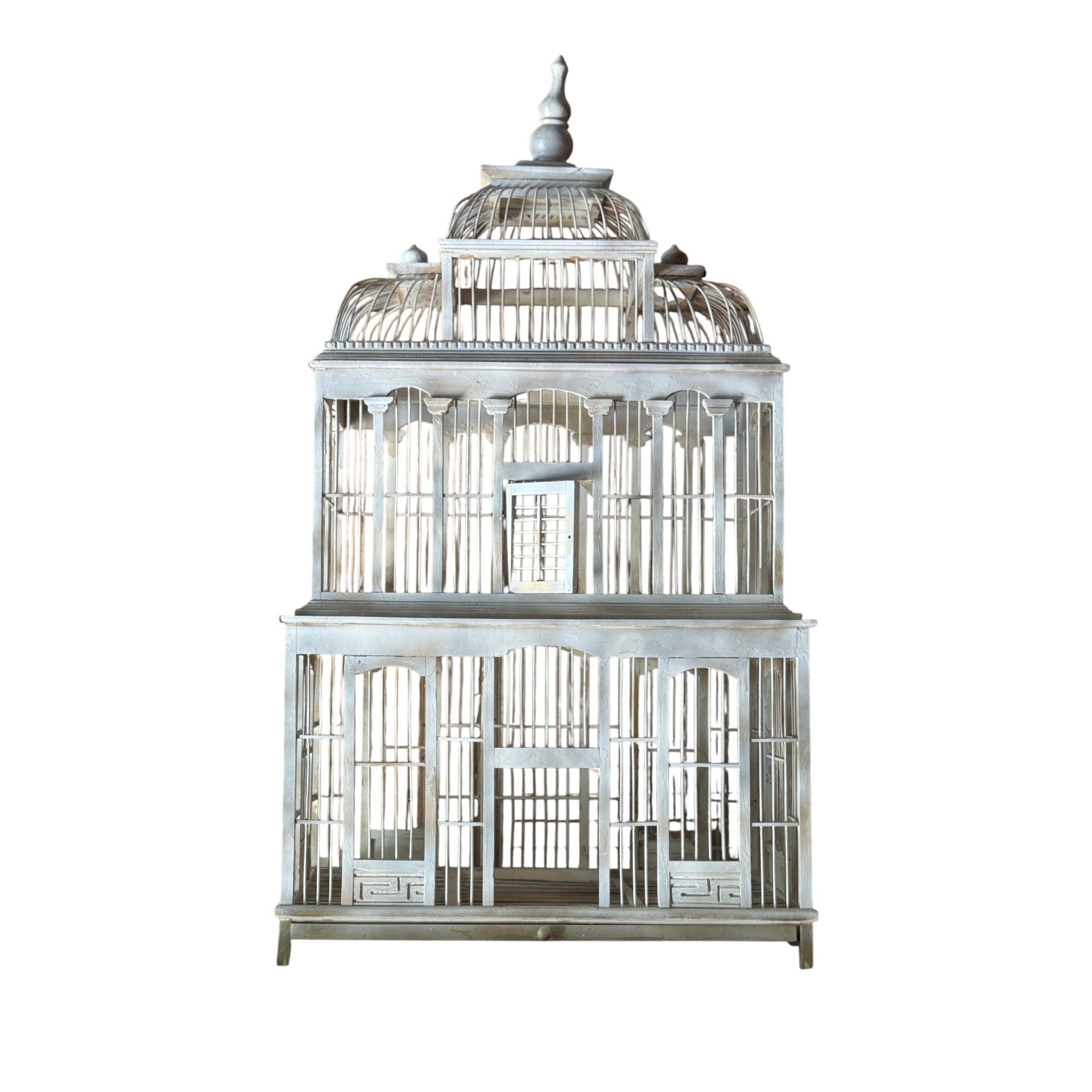 A striking vintage timber birdcage with architectural form, handcrafted with tiered domes and arched panels reminiscent of a grand pavilion or conservatory. The soft grey-painted finish adds a timeless patina, giving it a decorative and sculptural presence.