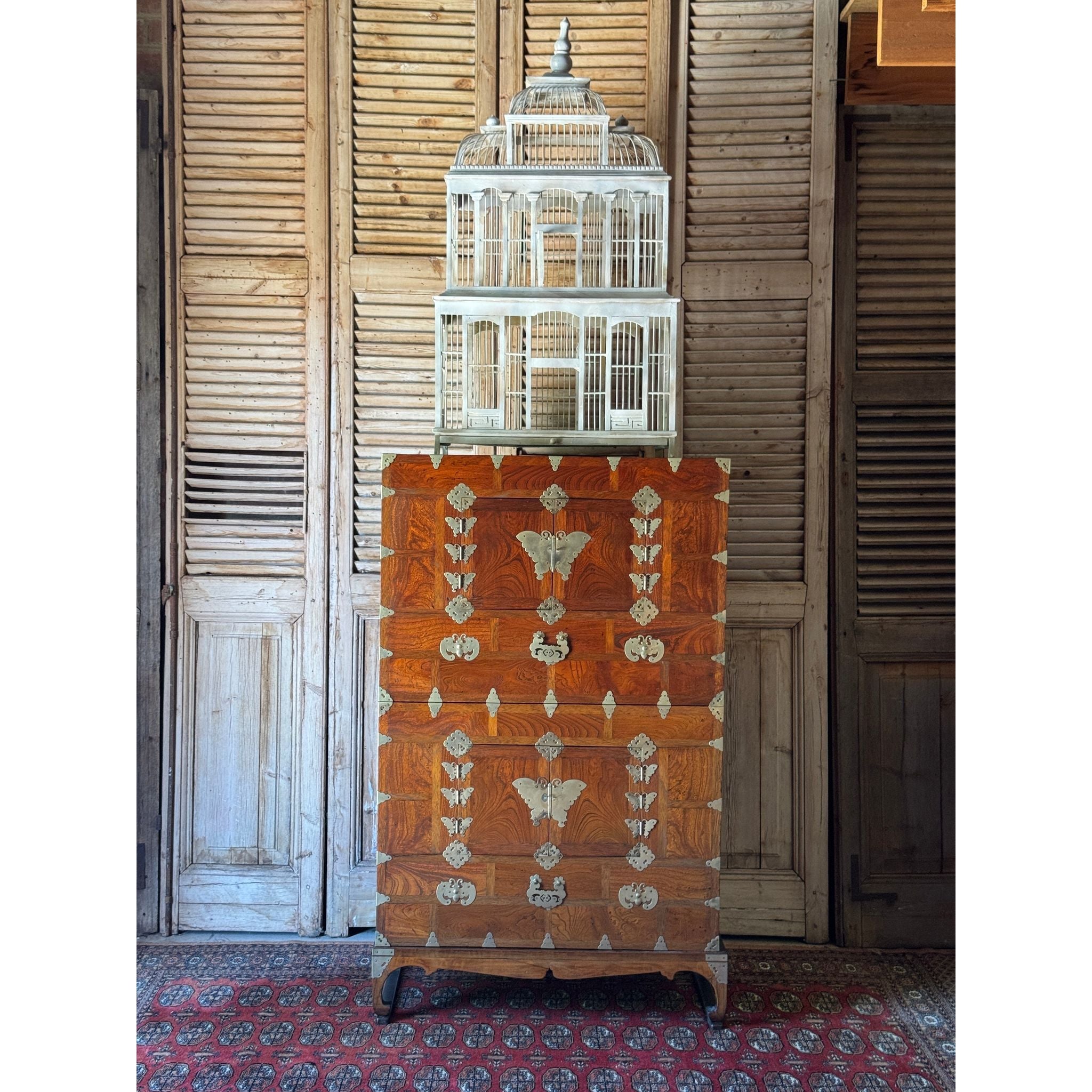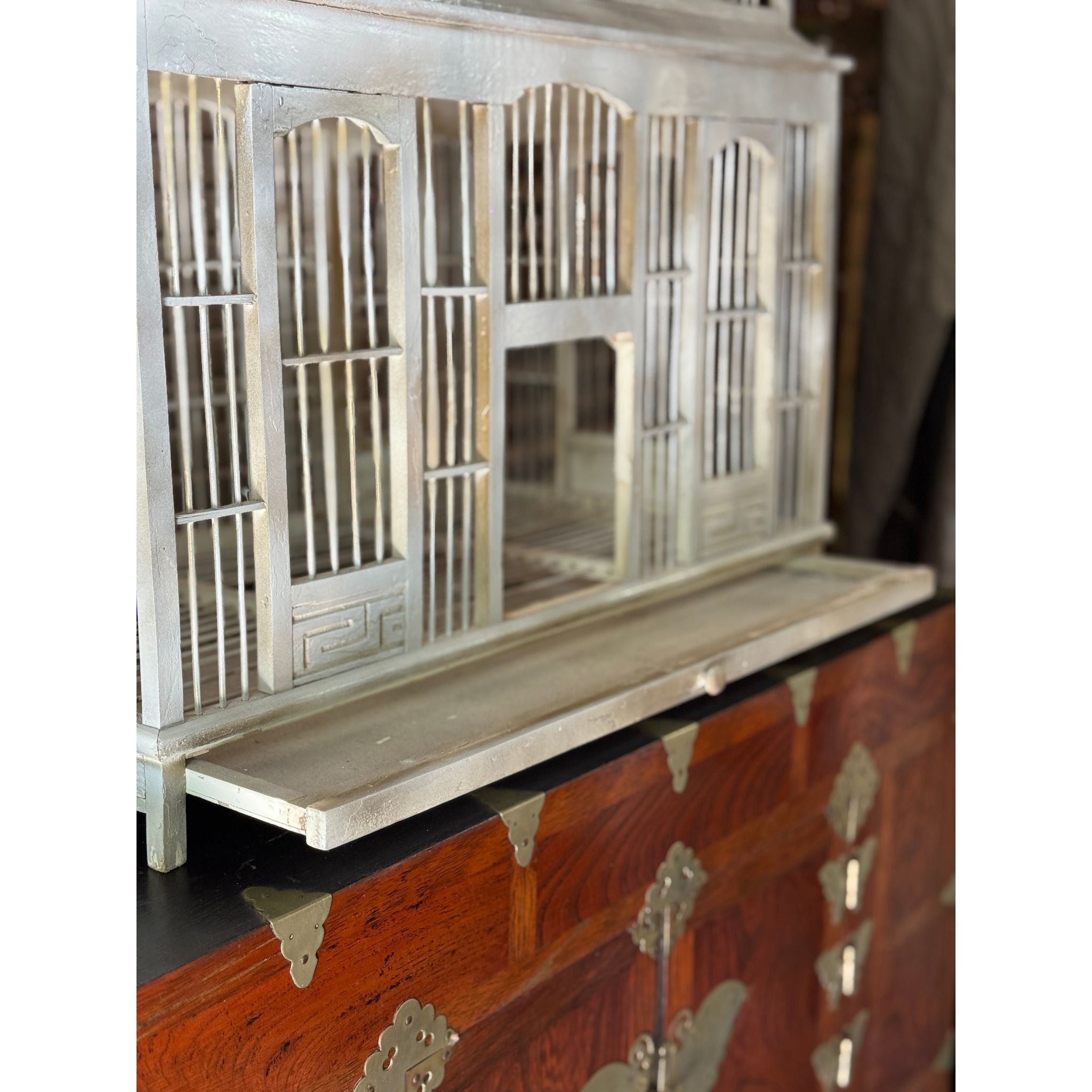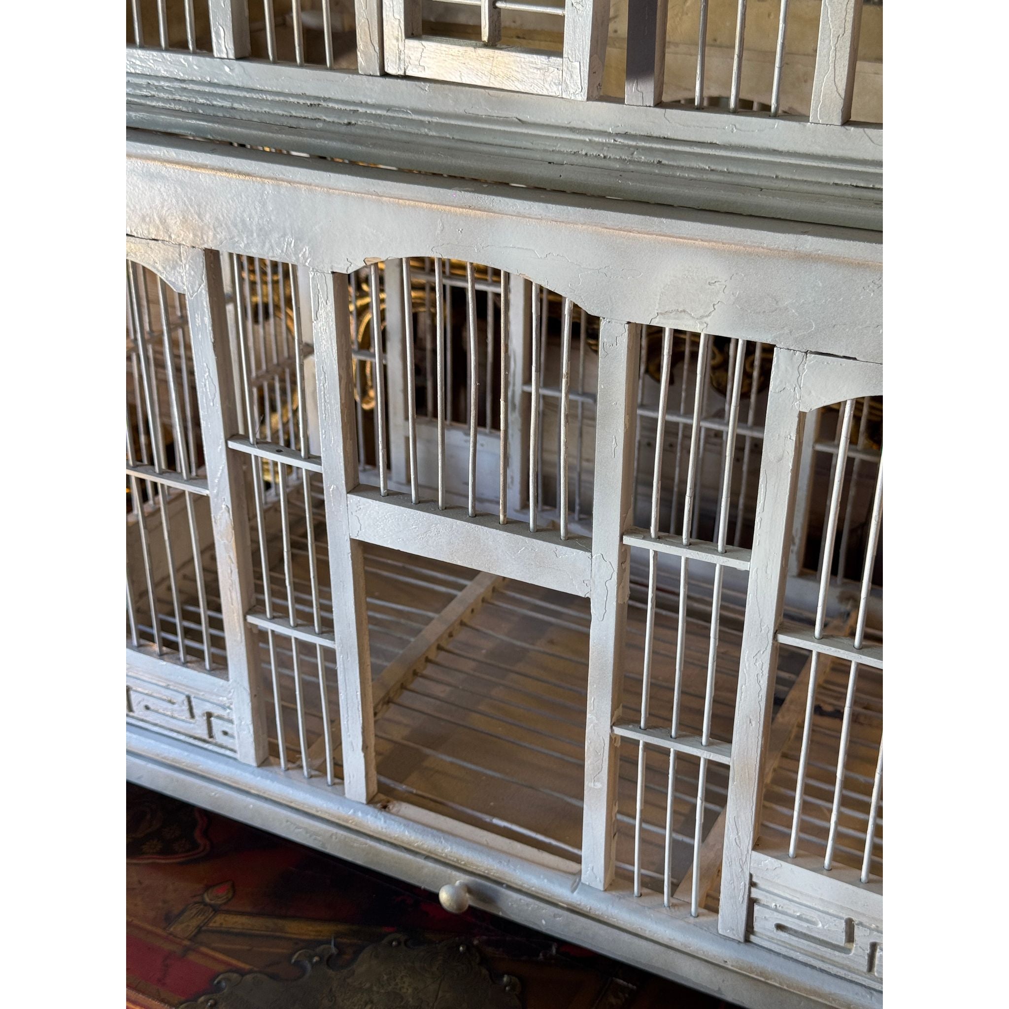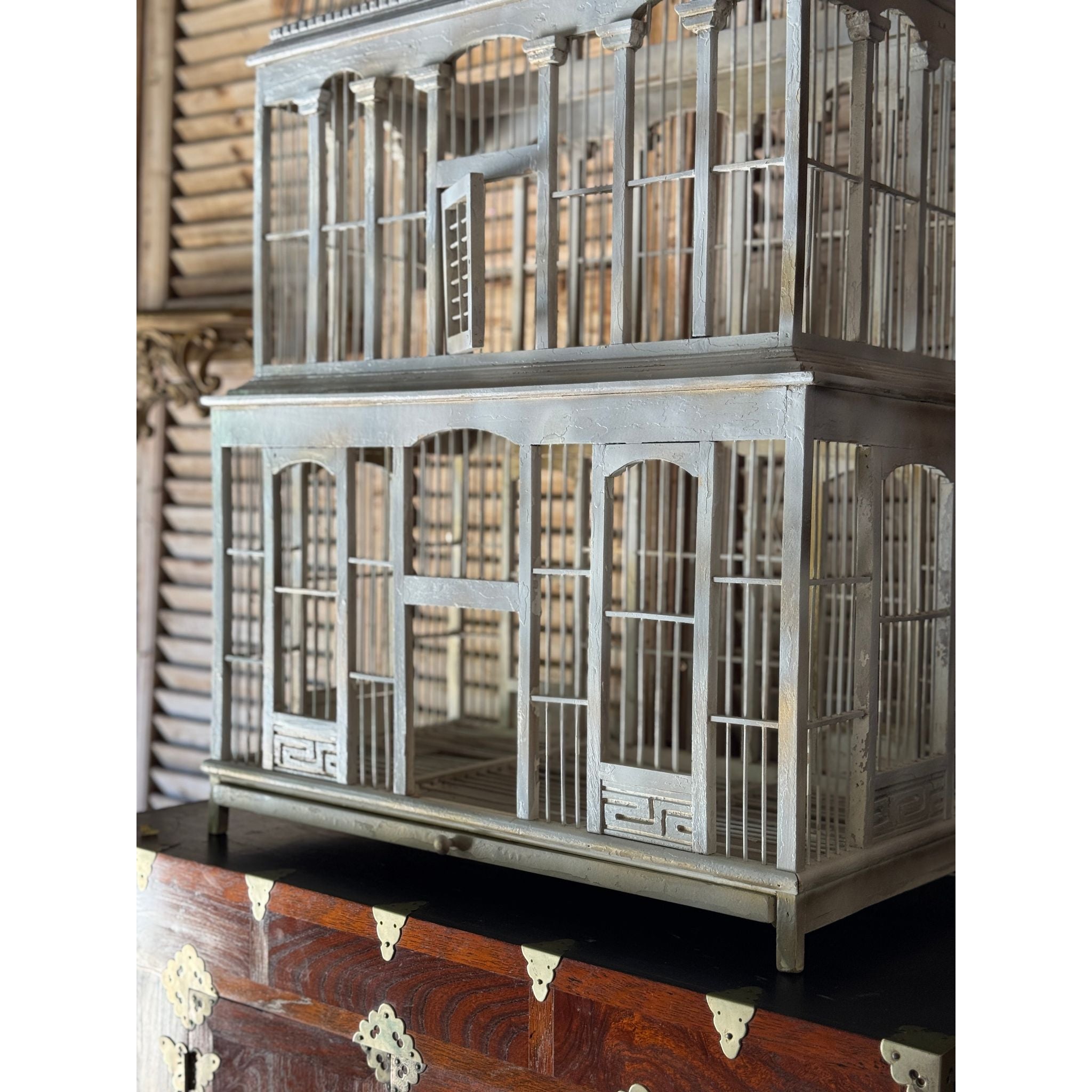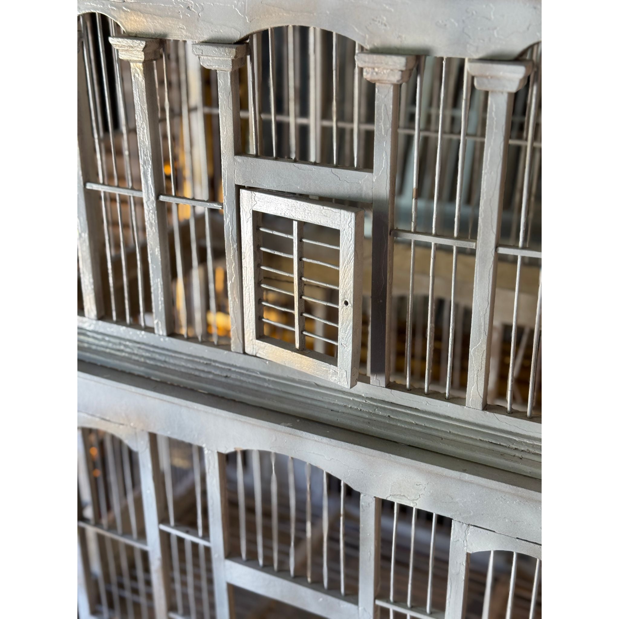 A striking vintage timber birdcage with architectural form, handcrafted with tiered domes and arched panels reminiscent of a grand pavilion or conservatory. The soft grey-painted finish adds a timeless patina, giving it a decorative and sculptural presence.