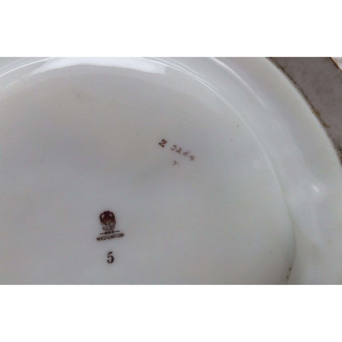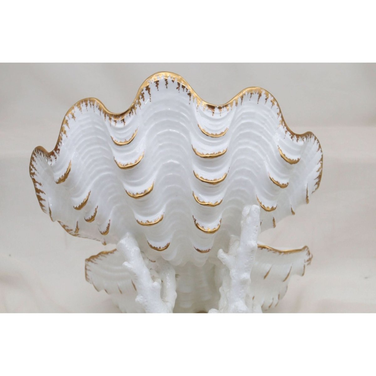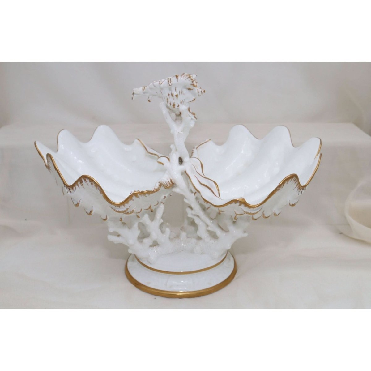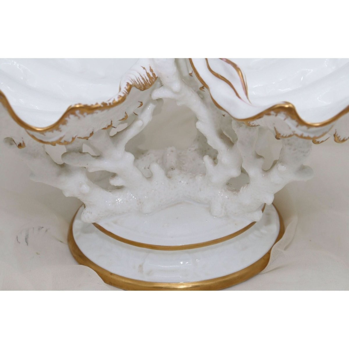 This eyecatching Wedgwood gilt bone china centrepiece is formed by two half clam shells supported on antler coral, which then rests on a round base. Rising up between the shells is more coral, on top of which sits a murex shell. The only decoration to the piece is the very delicate moulding together with the gilding to the rim and the high points of the clam shells as well as the high points of the murex shell, with the hand gilding contrasting nicely against the white bone china. The base shows the shape number Z 2264. The Z series was first issued in 1879 and the items produced were described as gilt bone china "fancies", or ornamental pieces. Centrepieces sat on a dining table or a sideboard to hold flowers, sweetmeats or pastilles or just to be decorative. This one measures 405 mm (16 inches) wide, 280 mm (11 inches) deep and stands 300 mm (12 inches) high. There is a very small firing crack to the inside edge of one of the clam shells, otherwise it is in very good condition. It dates from the period 1879-1890.