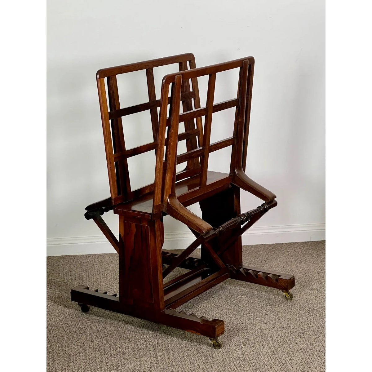 Both sections of the frame are adjustable via brass hinges and a double ratchet mechanism. The squared latice like frames can be arranged horizontally to form a flat surface or vertically so as to hold maps, prints, paintings or documents etc.