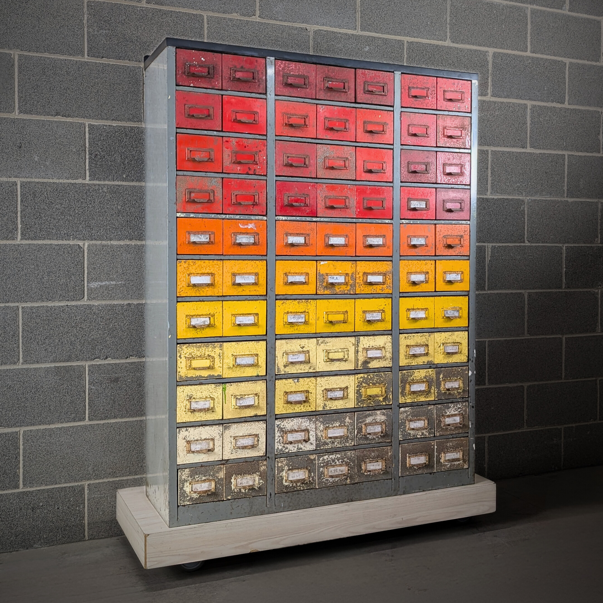 An early century industrial survivor with real weight and provenance, this 72 drawer steel cabinet from Tracy Office Systems carries the kind of lived in colour and graded patina only decades of use can produce, reds falling through ochres and yellows, original hardware intact, every drawer still working the way it was built to.