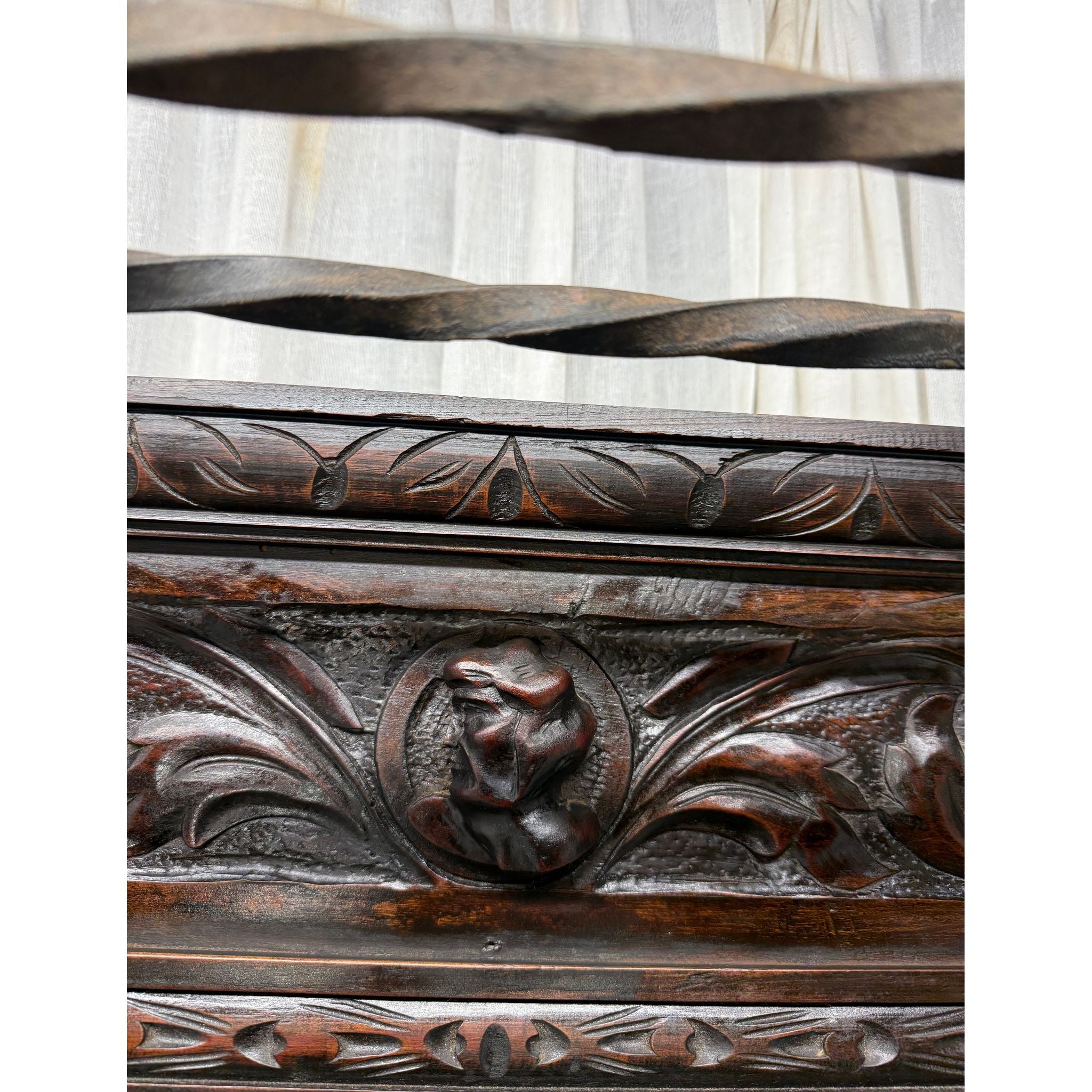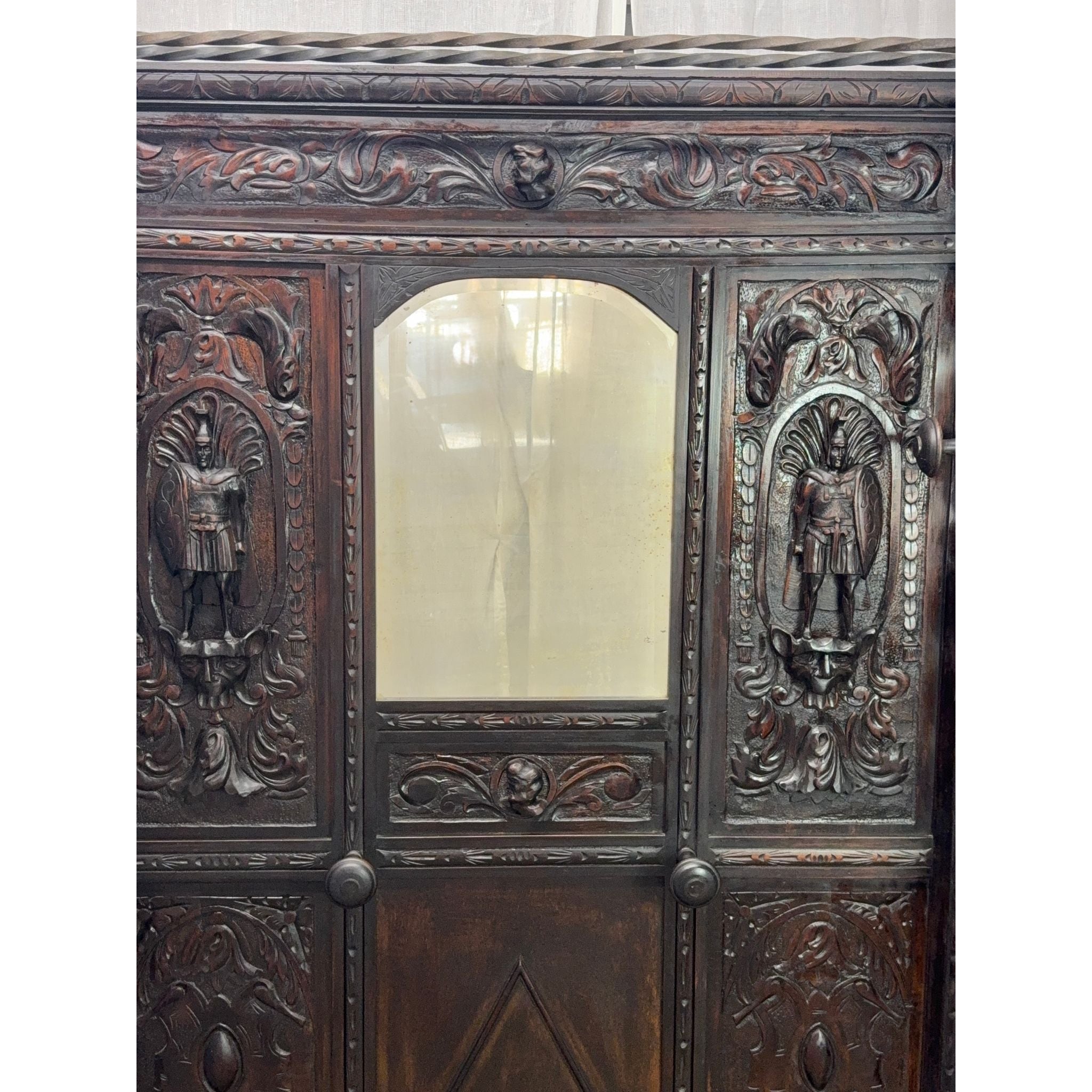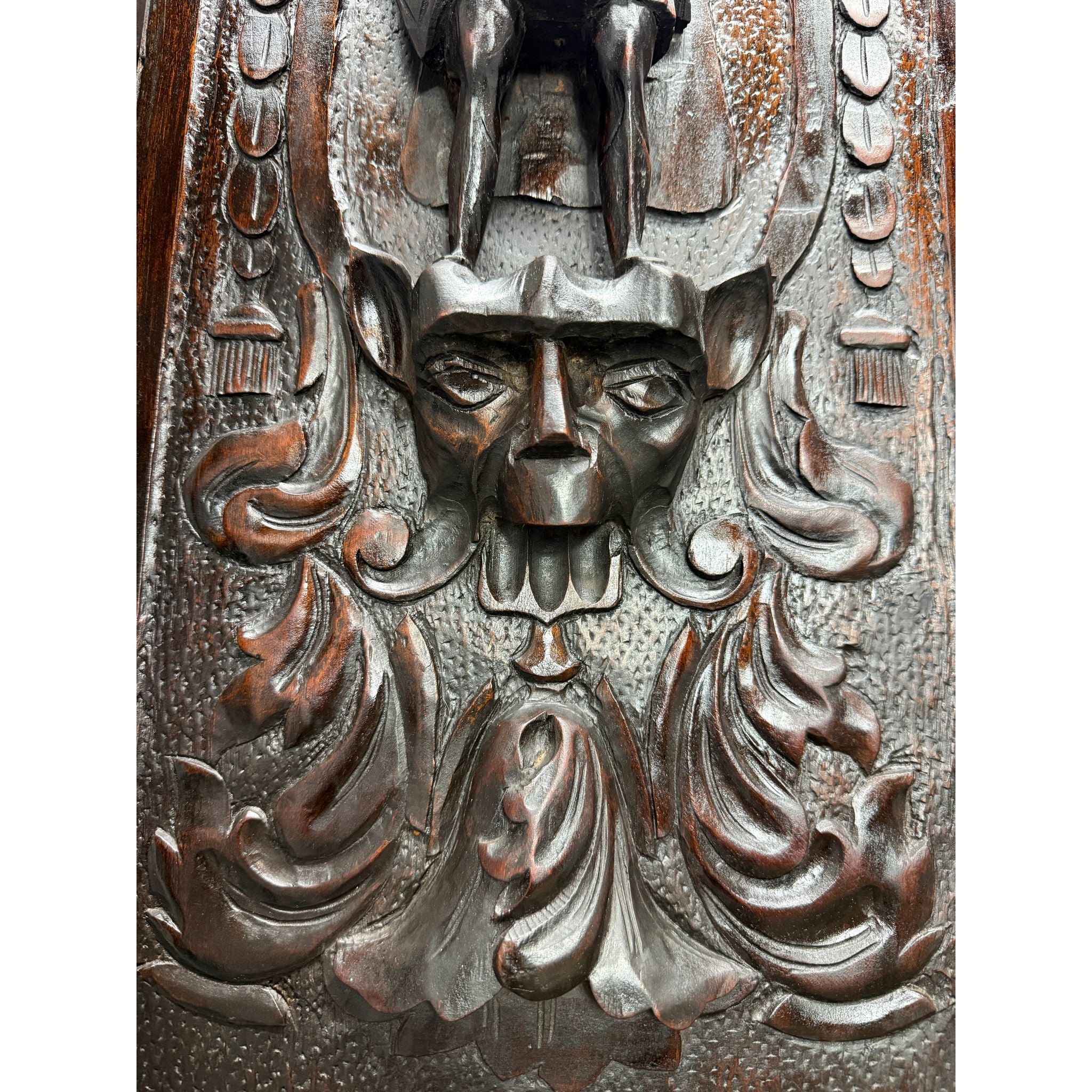 Featuring a mix of classical and mythical carved motifs throughout this is truly an unusual piece. It is carved from oak, still has its original mirror and has two twisted cast iron rods running horizontally across the top.