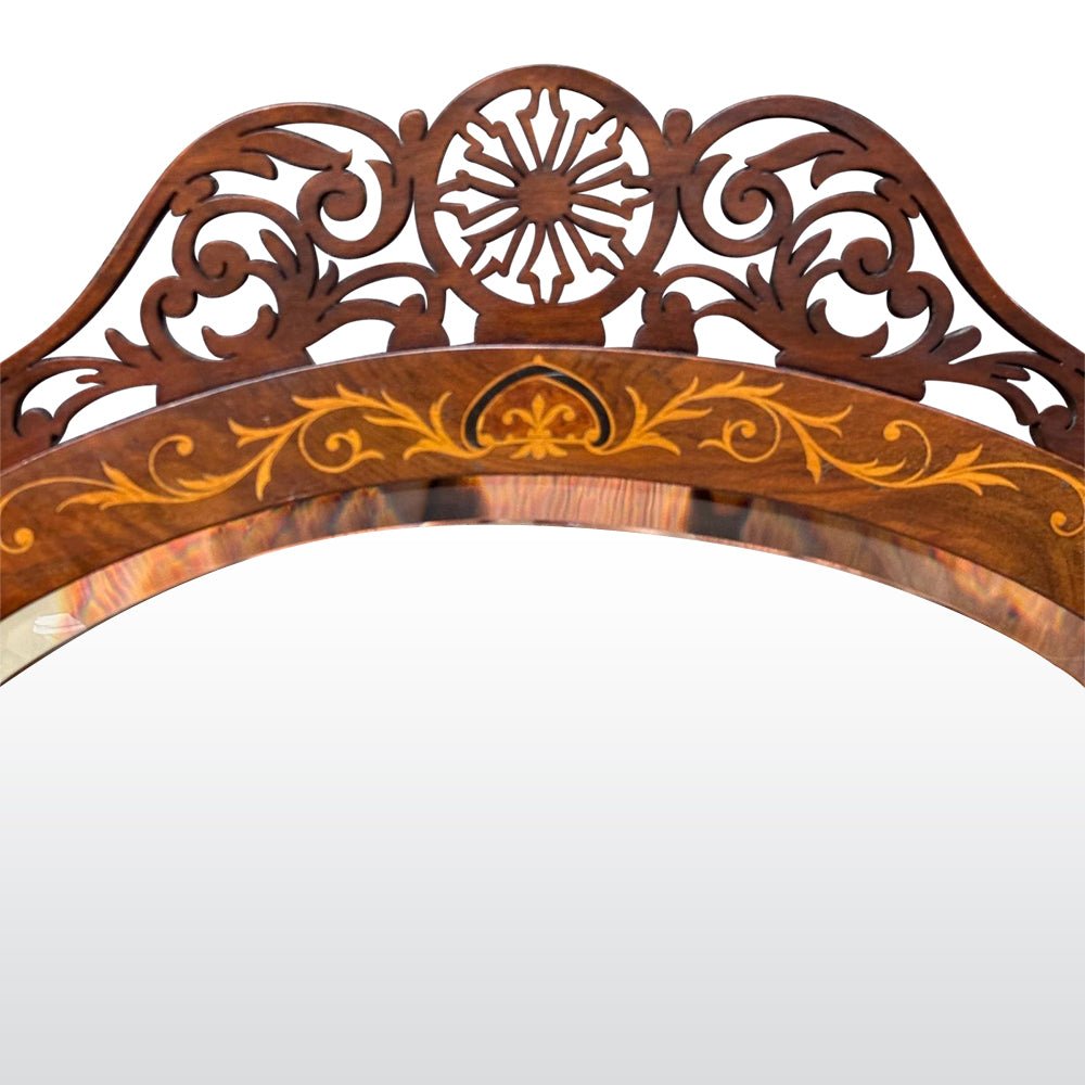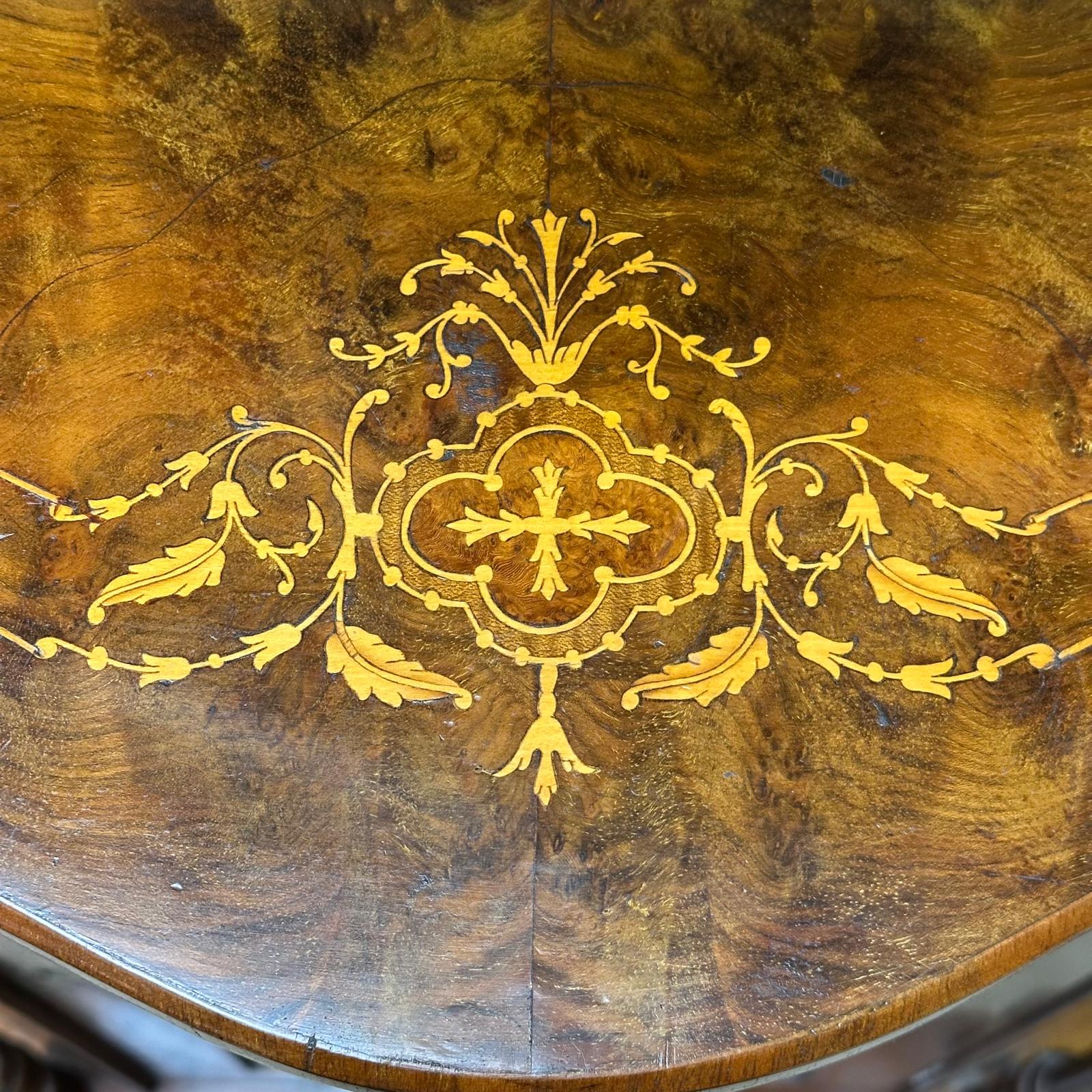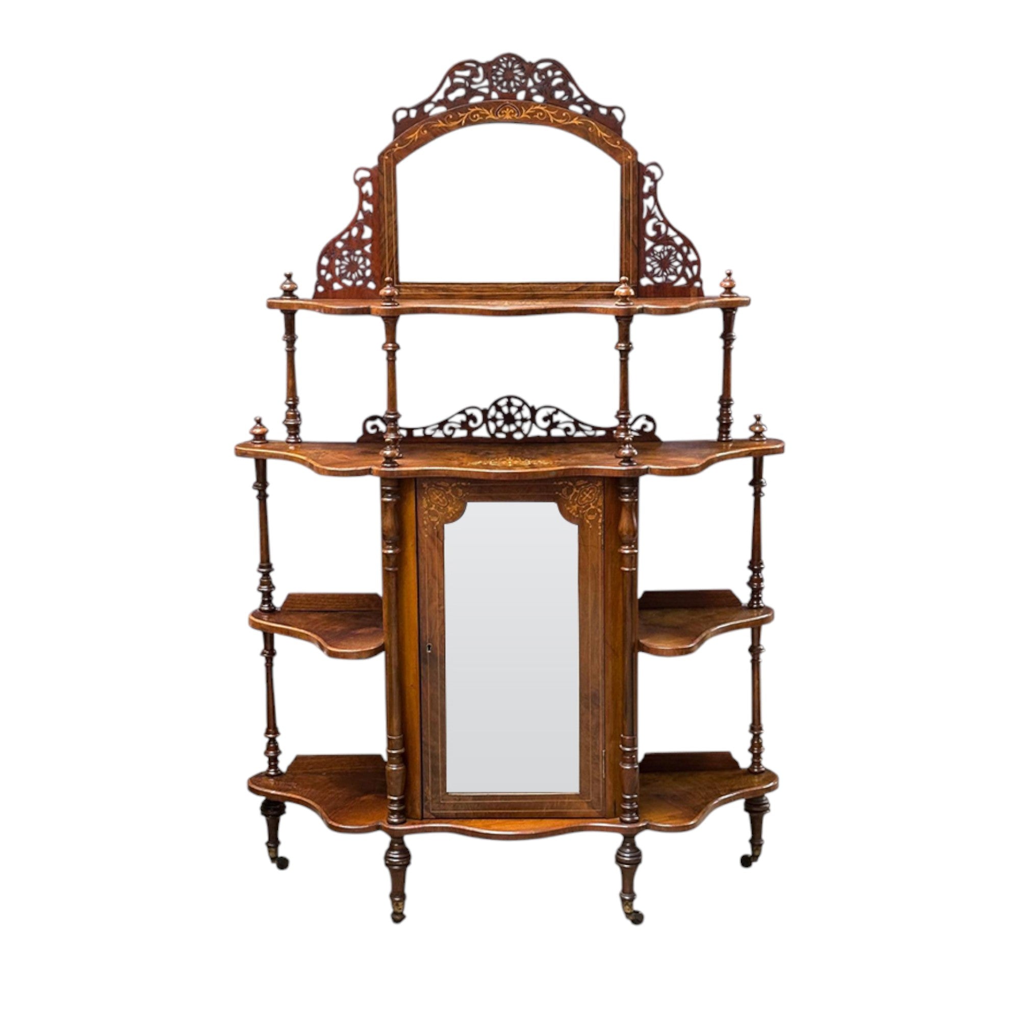 Made from glorious burr walnut, this what-not features 2 full width upper shelves, and extra corner shelving to the sides. It has an upper mirror, flanked by decorative woodwork details. the lower section has a mirror fronted cupboard, perfect for storing treasured items. The shelves are beautifully inlaid with satinwood designs which add luxury to the piece.