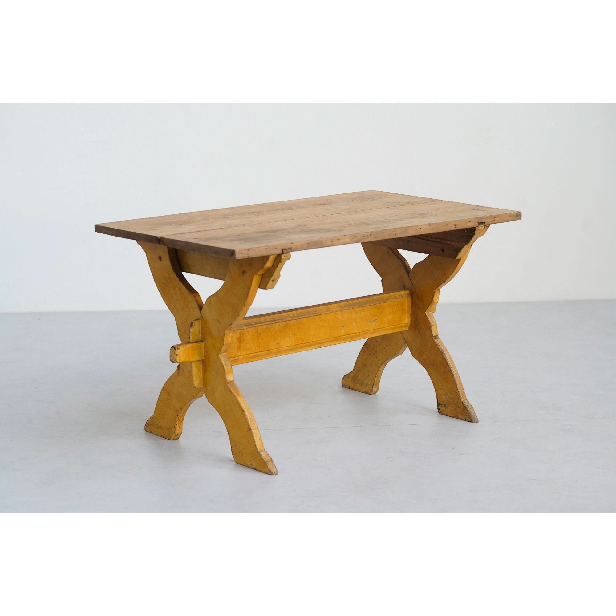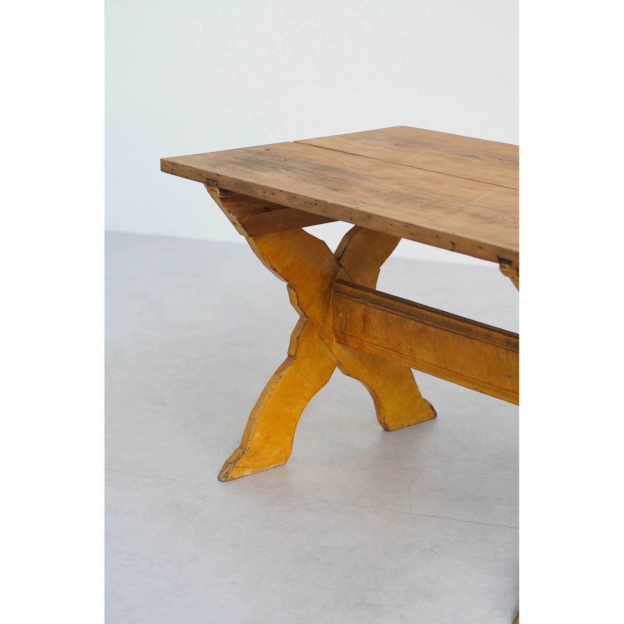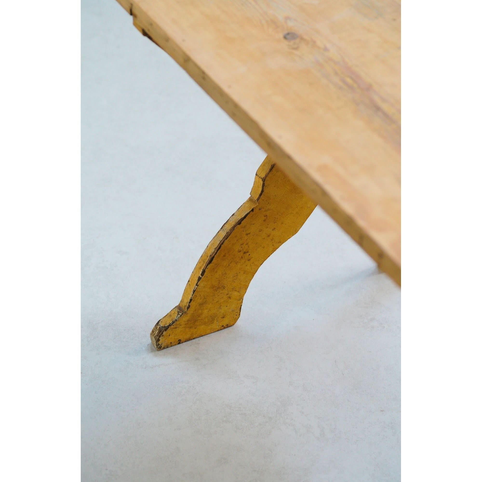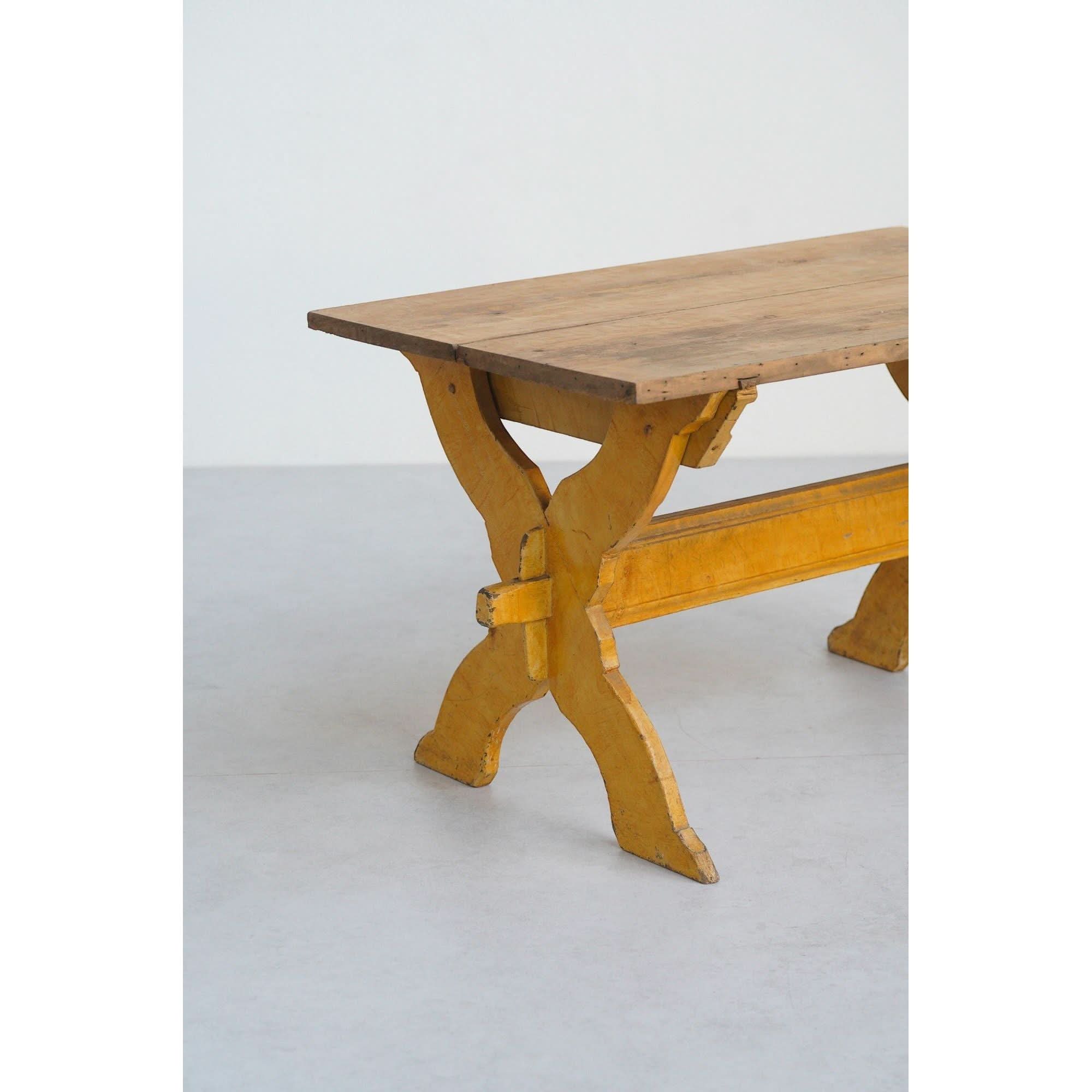 The table's most striking characteristic is its whimsical bow-legged trestle base, a playful design element that feels remarkably contemporary despite its 200-year heritage. The original yellow paint has developed a beautiful patina over time, with natural wear creating an authentic rustic charm that speaks to generations of use in Swedish country homes.