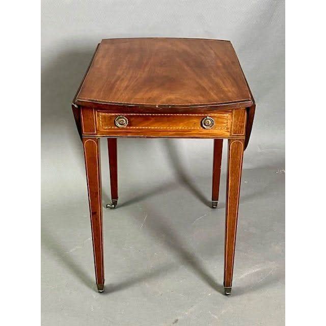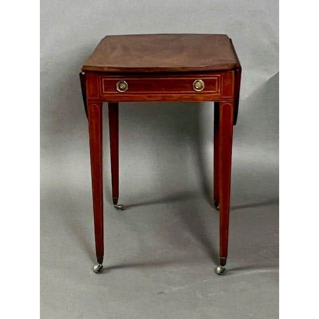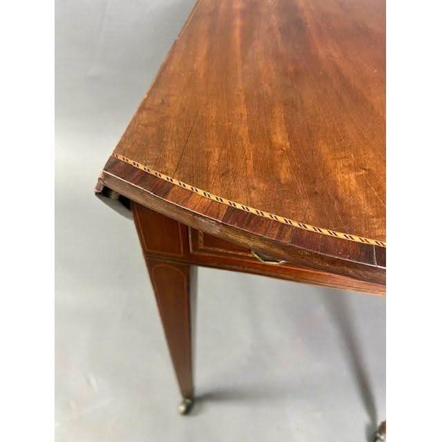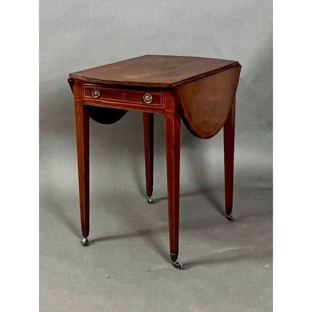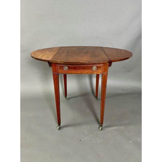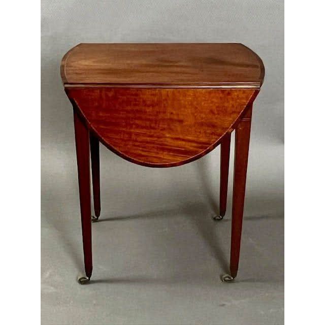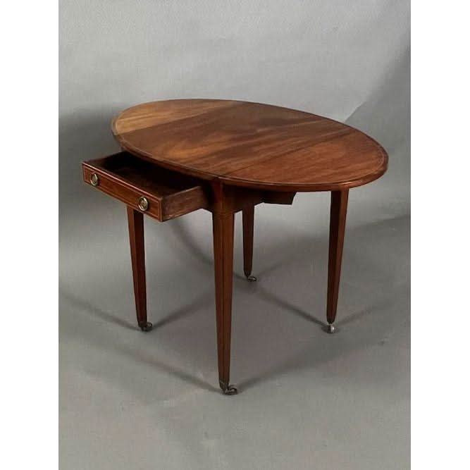 This is a charming genuine antique English George III oval drop side Pembroke Table made from well figured imported Central American Mahogany. The top is embellished with a Rosewood cross banding with line inlay between the Mahogany and the Rosewood. The semi circular drop sides rest vertically if not required and if raised rest on hinged and shaped loafers.