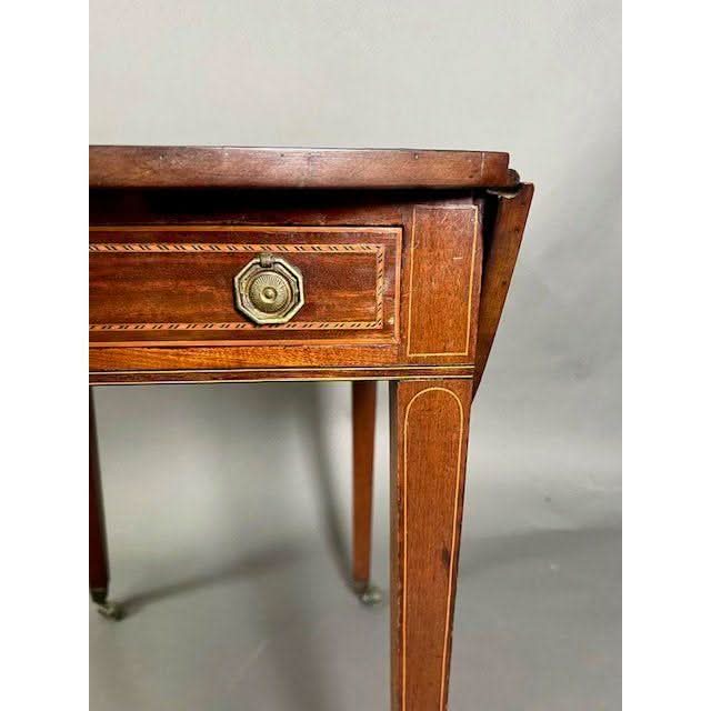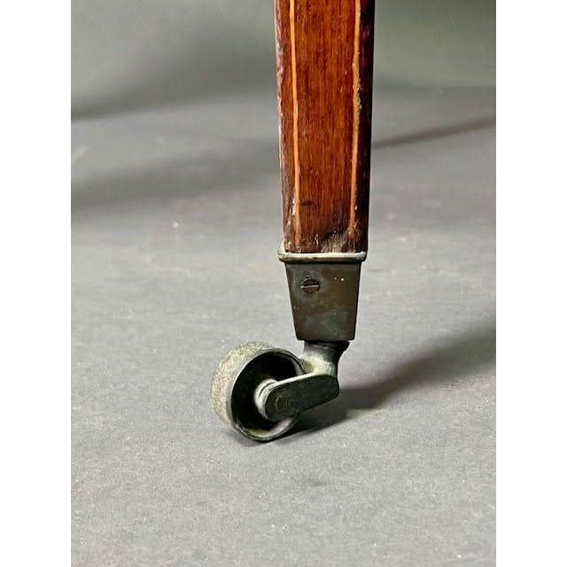 The frieze section has a full width flush mounted oak lined drawer at one end and a complimentary “faux” drawer at the other end. Both have a pair of brass drawer pull handles and are inlaid to compliment the table top. Either side of the drawers is line inlay forming a panel and this is also featured full height on the square tapered legs which terminate in original all brass castor assemblies.