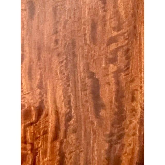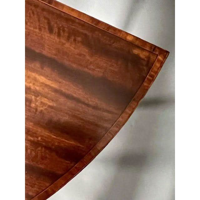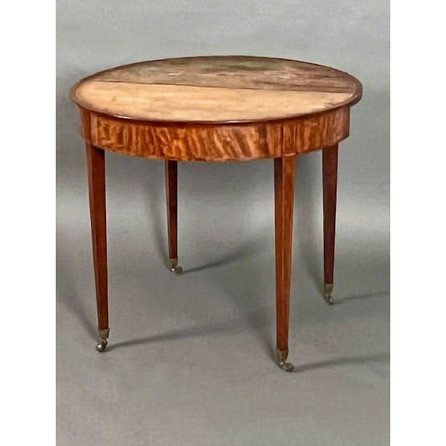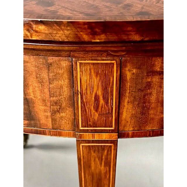 Finished in the finest ‘satin’ Mahogany and embellished with a Rosewood perimeter cross banding on the top surface with a Satinwood / Fruitwood line inlay between the Mahogany and the Rosewood. The elegant square tapered legs in the Sheraton manner also have full height fine complimentary line inlays and terminate in original all brass square bucket castor assemblies.