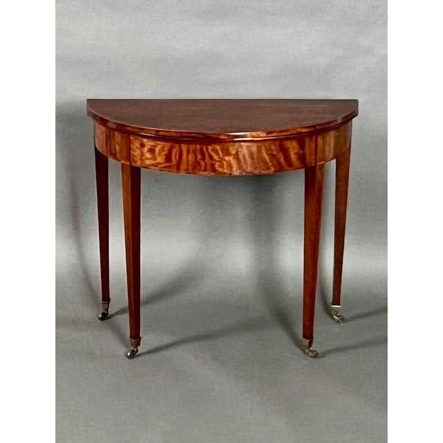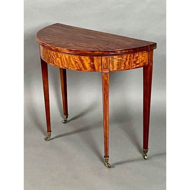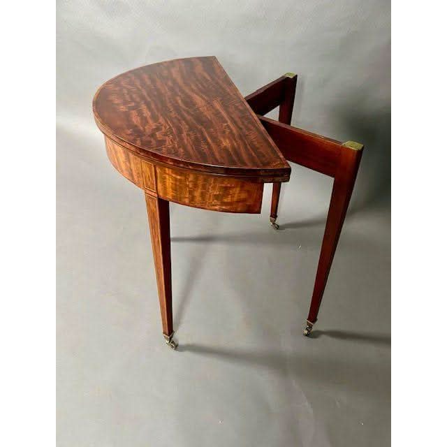 This is a a very attractive ‘classic’ genuine antique English later 1700s George III Demi lune shaped card table with a fold over top and double rear gate legs.