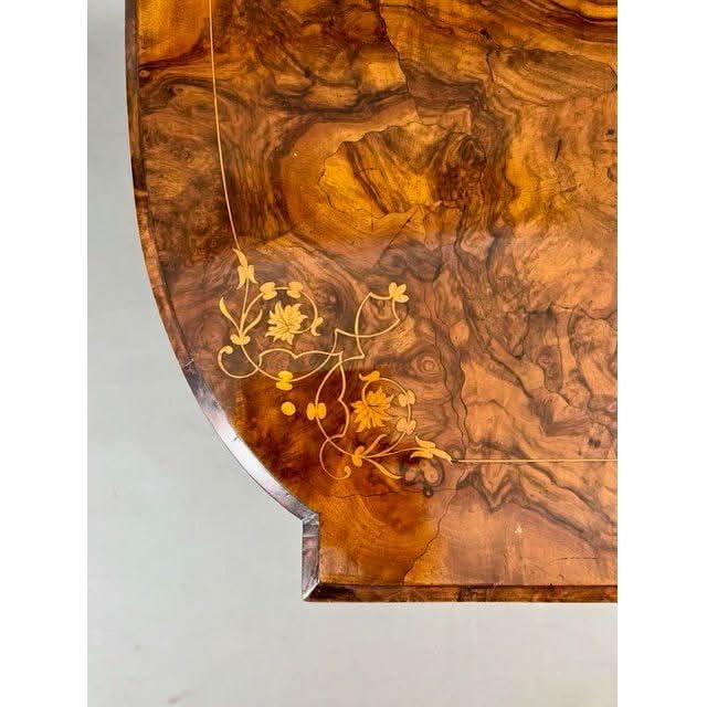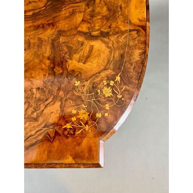 The rectangular shaped top has nicely curved ends and the whole table top is finished in selected superb highly figured and warm honey coloured Walnut which is ‘ book leaf matched’ and is further embellished with corner positioned stylised floral and leaf ‘Satinwood’ inlays which are connected by fine line inlays.