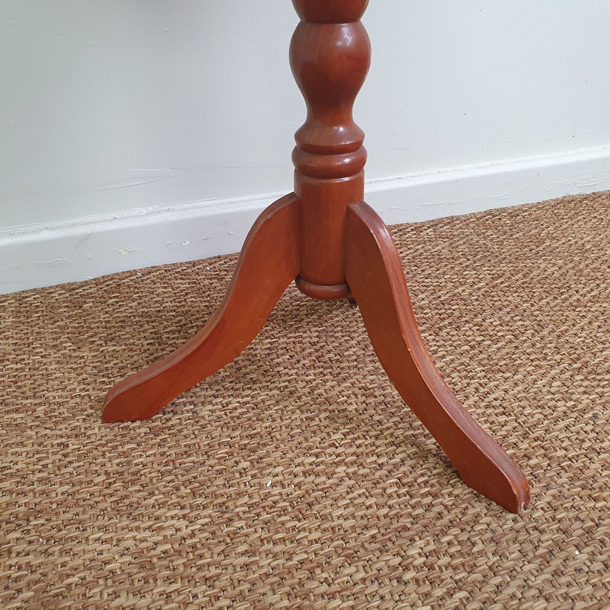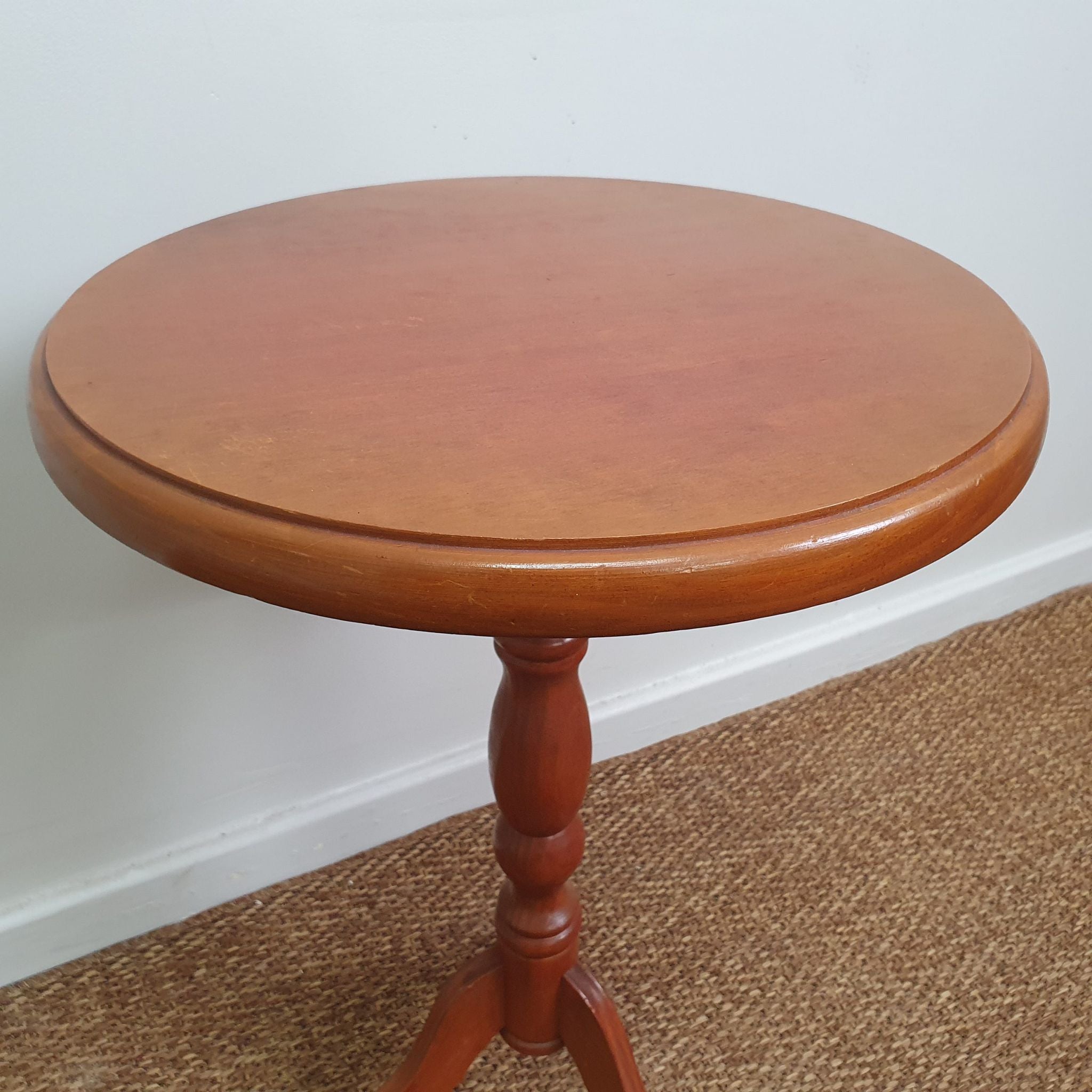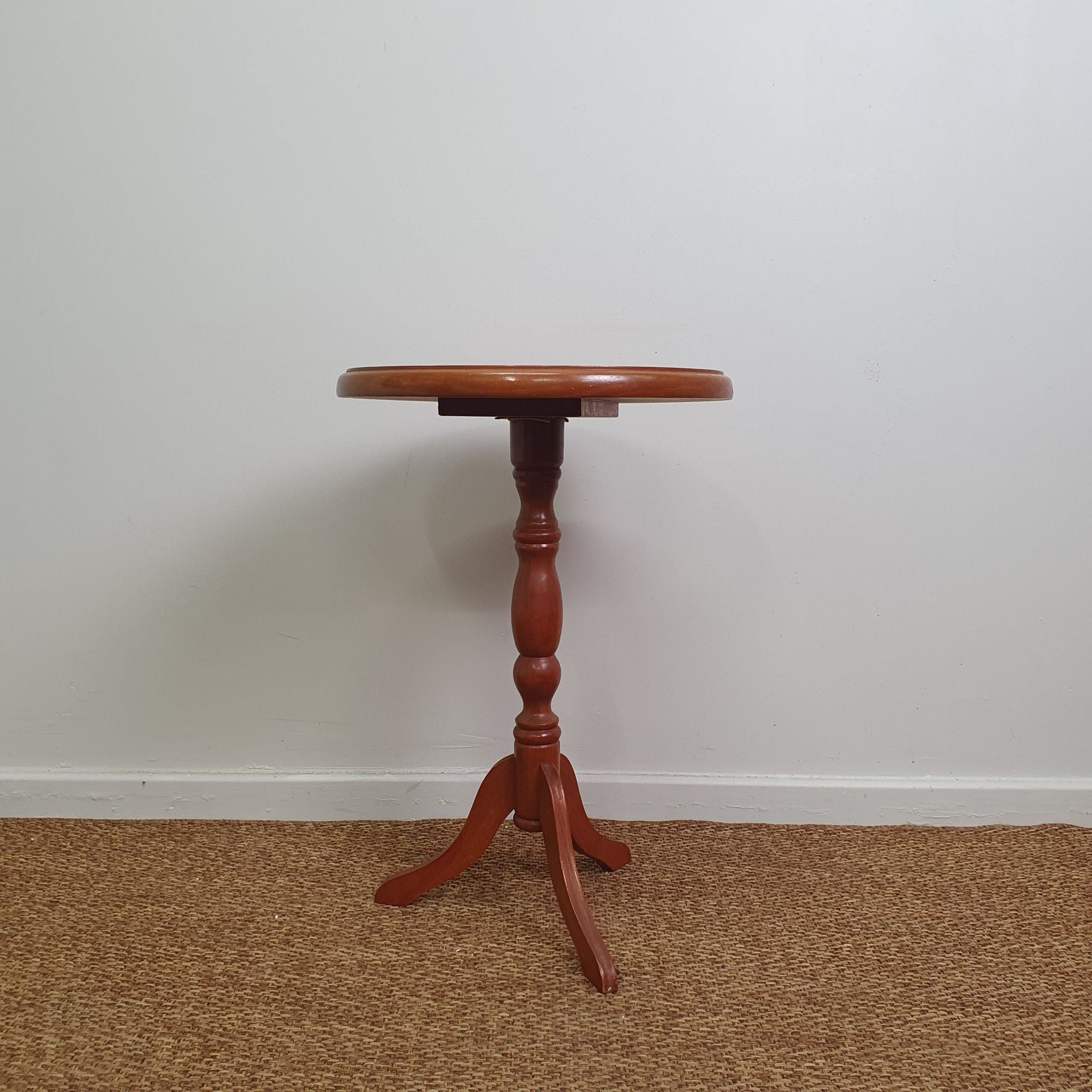 This vintage timber wine table features a simple, classic design crafted from warm timber. Its compact size and understated style make it a versatile piece as a side table or for displaying decorative items. A charming addition to any living or dining space.