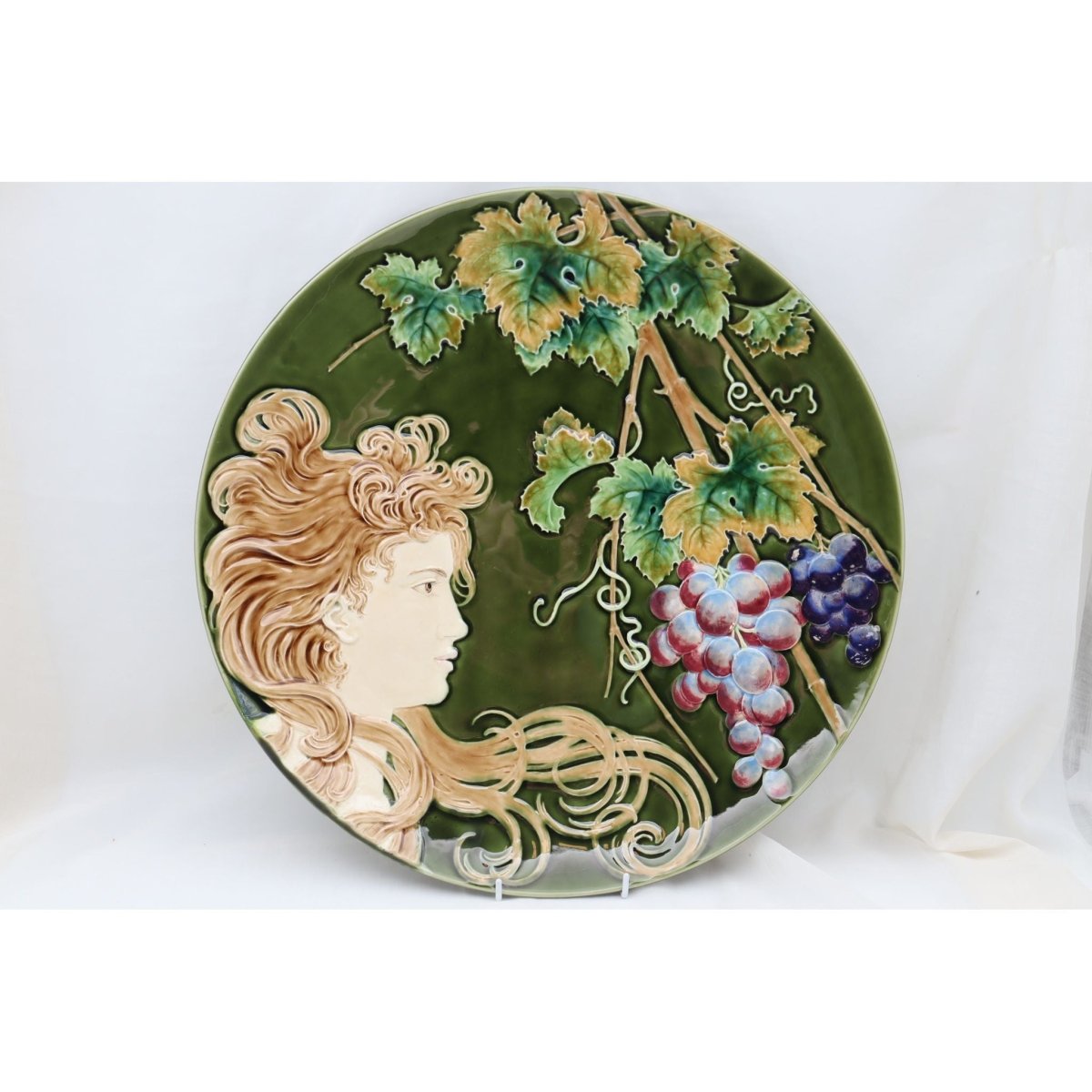 This large wall plaque is decorated with majolica glazes to enhance the typical Art Nouveau pattern of the young girl and her long flowing tresses. The raised moulded design has been coloured by hand, and then using the sgraffito technique, small areas of colour on the grapes have been removed to reveal the earthenware body and create highlights, mainly on the dark blue grapes. It was made by the Schutz works near the town of Blansko, in what was then Moravia, but is now in the Czech Republic. The company ran from 1854 till 1917, when the Schutz brothers retired. The diameter is 436 mm (17.25 inches) and it stands 48 mm (2 inches) high. It is in very good condition, with only a couple of light scratches and some faint crazing to detract from it. It dates from around 1905.
