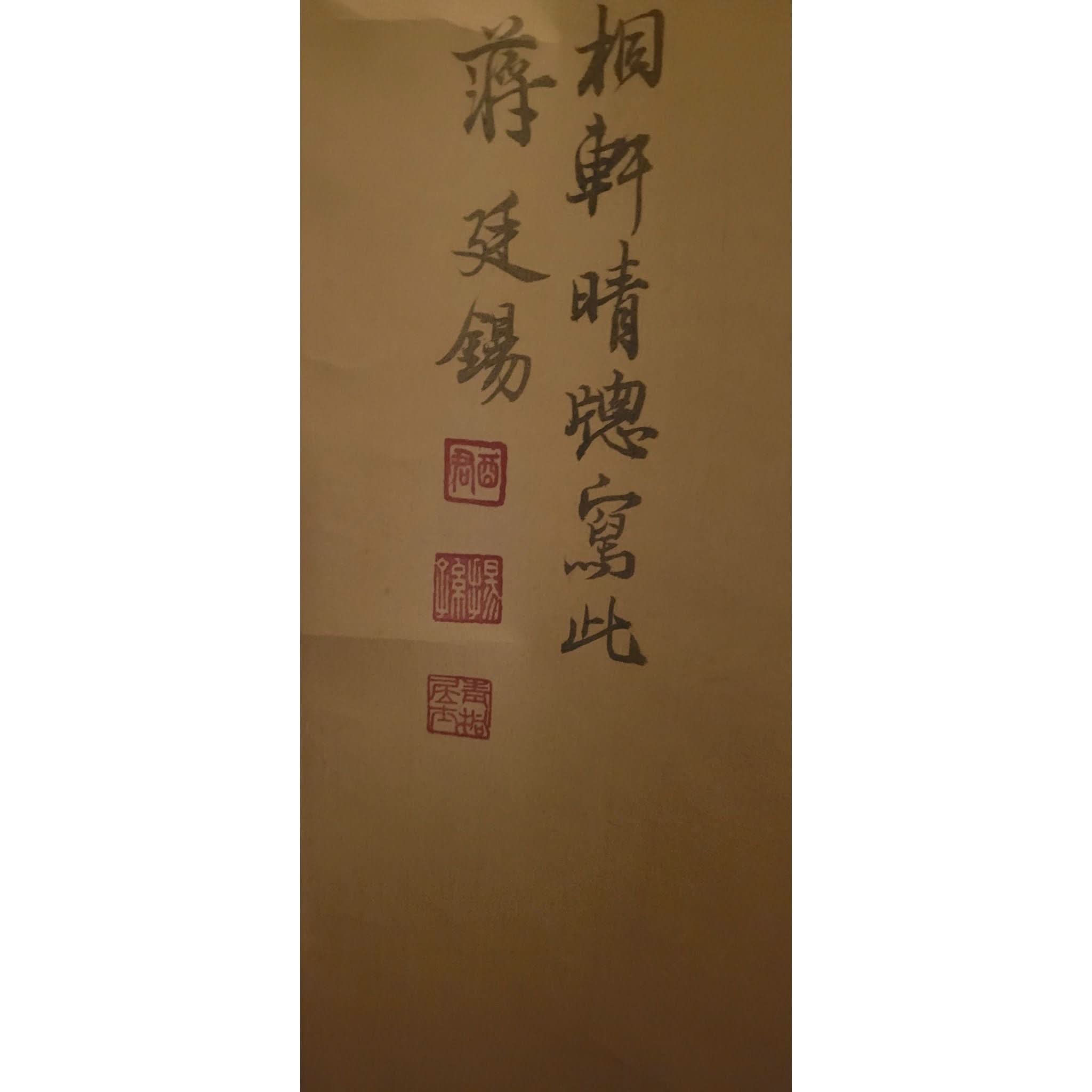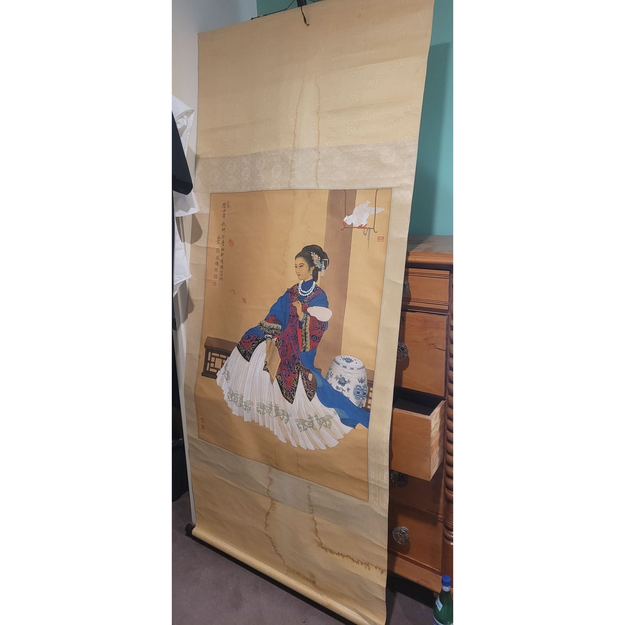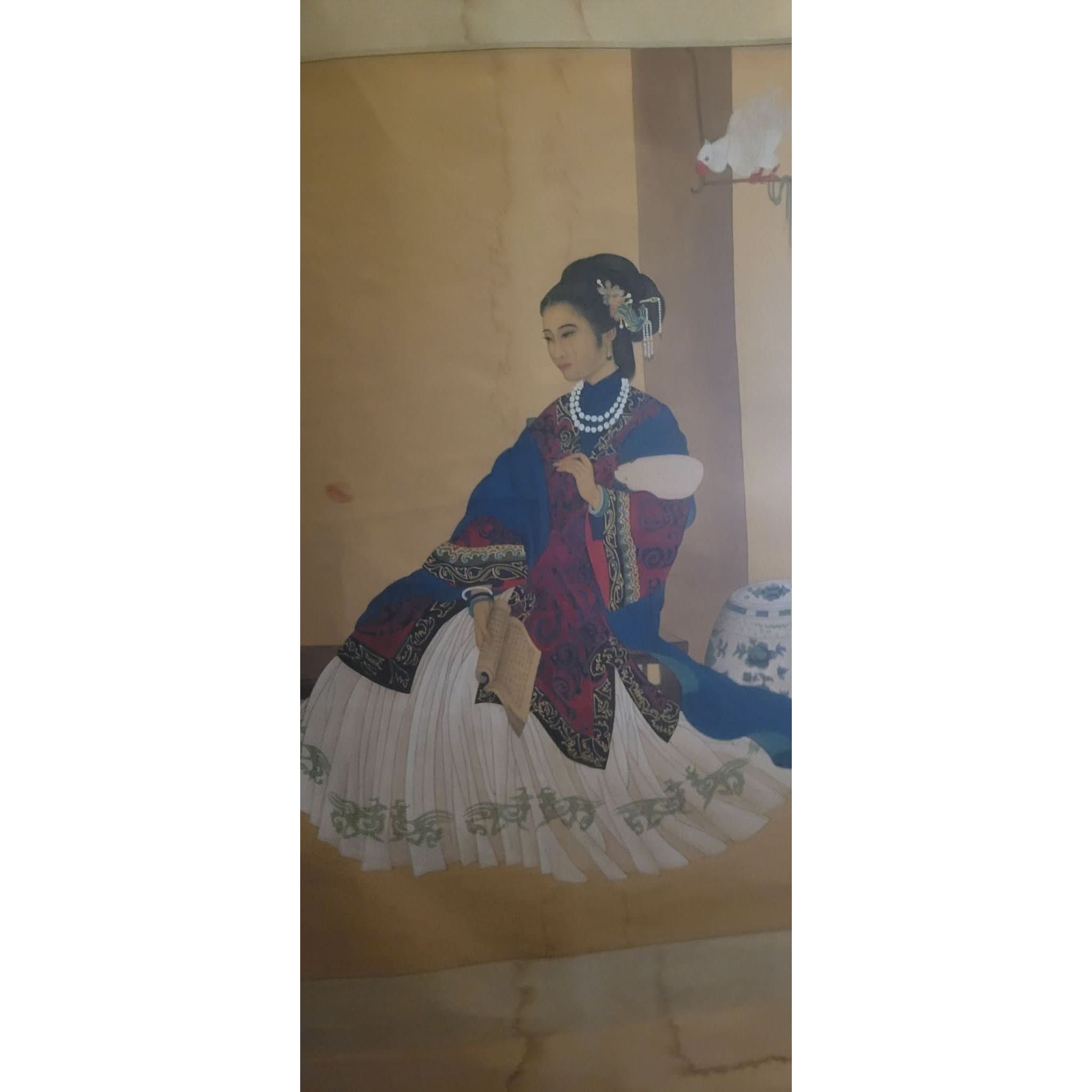 Large Chinese Qing Dynasty scroll painting on embossed silk . Painting of a beautiful woman in traditional dress sitting with a book & fan