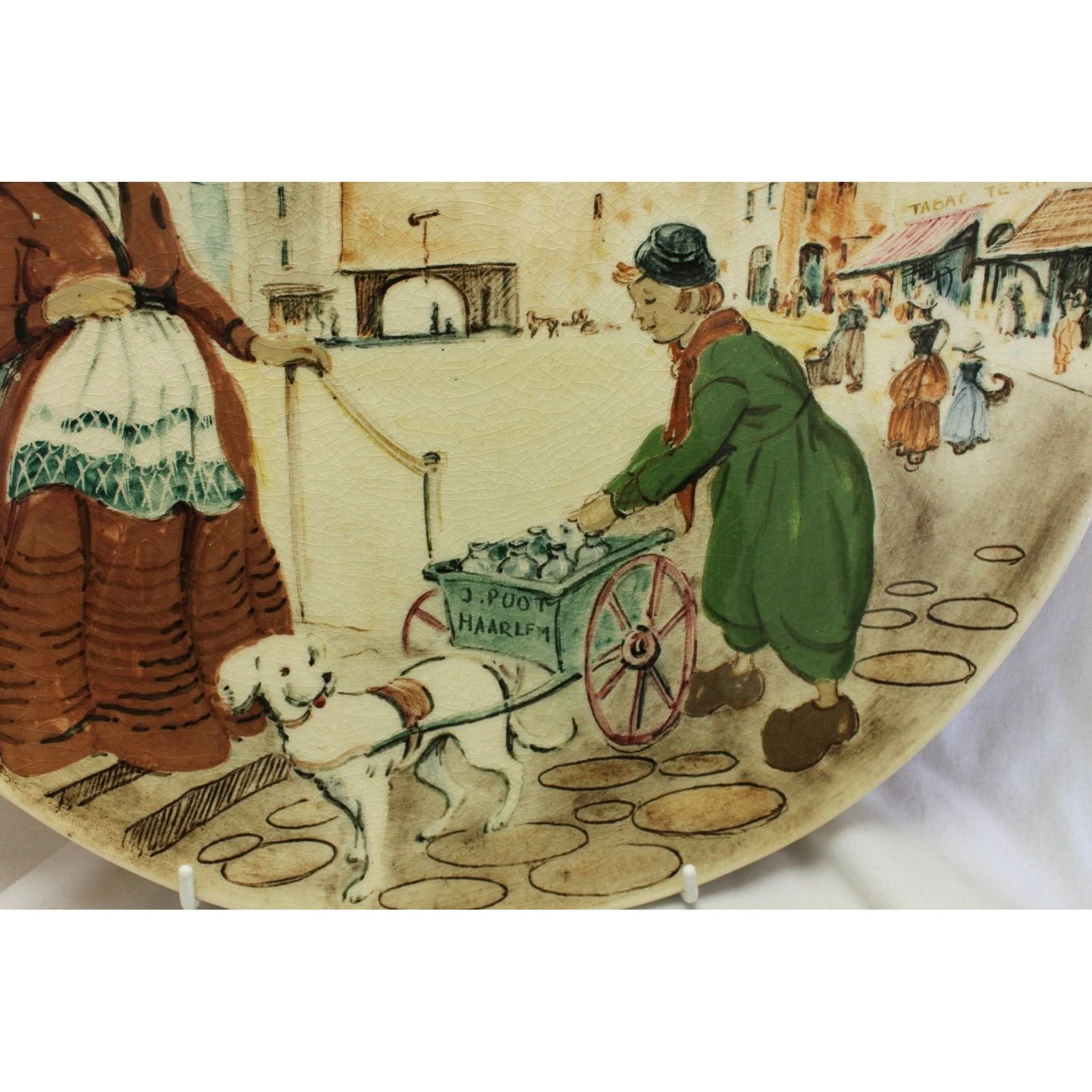 Dated 1950, this large Martin Boyd wall plaque is decorated with a hand painted scene of a town square in Holland. This is one of the largest of the Martin Boyd wall plaques, measuring 390 mm in diameter. It has retained its original hanging loops and wire, but it would look equally as good on a stand.