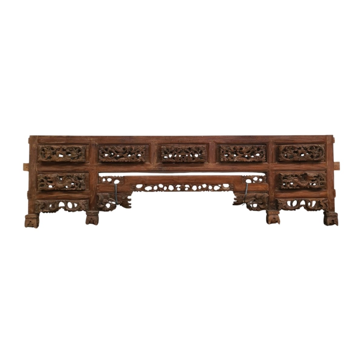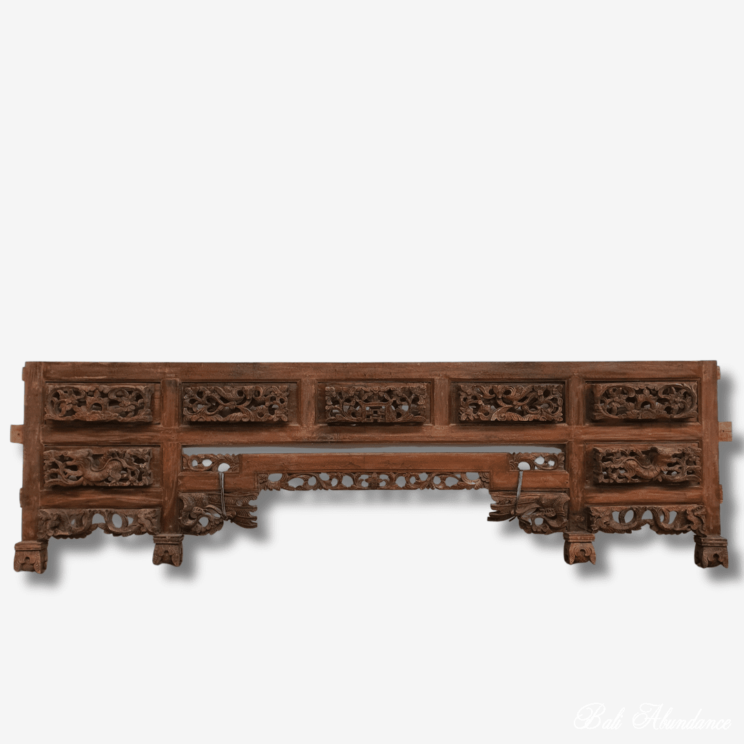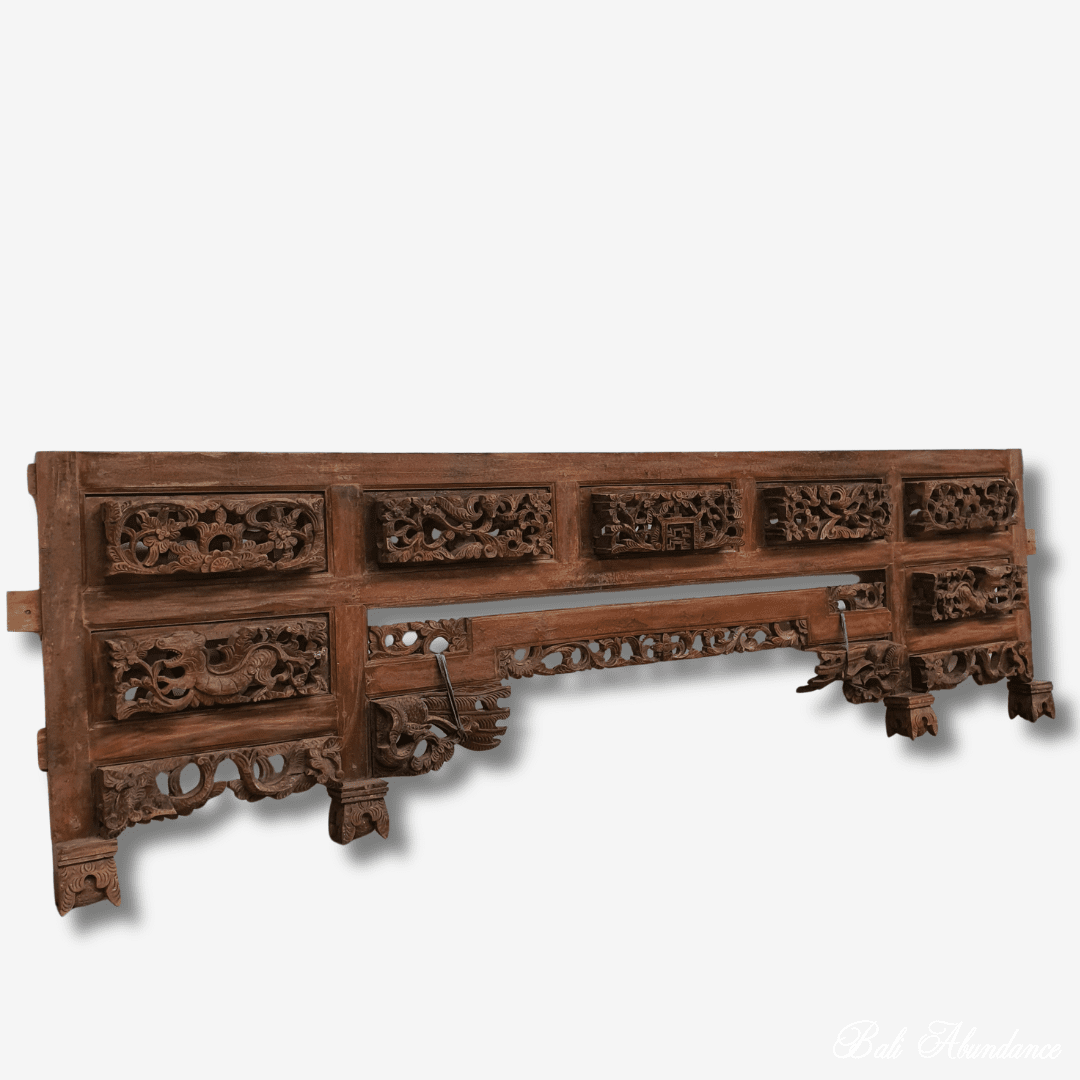 Add character to your home with this exceptional, hand-carved teak wall panel—a genuine vintage treasure from Bali. Each piece showcases intricate original Balinese craftsmanship, featuring detailed carved motifs that reflect the artistry of a bygone era. Carefully refurbished to preserve its authentic patina and heritage, this rare find brings warmth and cultural richness to any interior space. Perfect as a striking bedhead feature or statement wall installation, the natural teak wood develops a beautiful aged character over time. The organic grain patterns and hand-worked details tell the story of its origins, making it a conversation piece that connects your home to Balinese tradition. Whether you're curating a bohemian sanctuary or adding vintage sophistication to modern décor, this timeless panel infuses your space with genuine artisanal charm and enduring elegance.