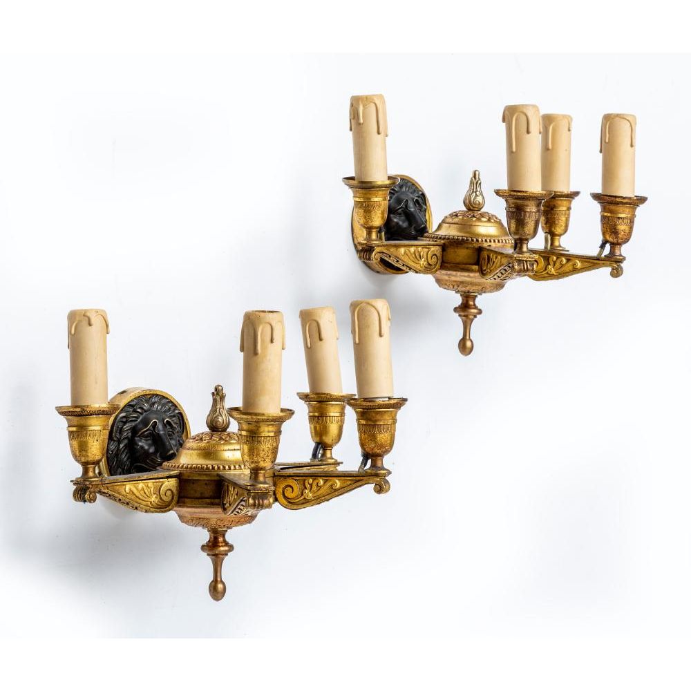 A fine quality pair of Lions head design, four branch gilt bronze Empire wall lights, French early 19th Century