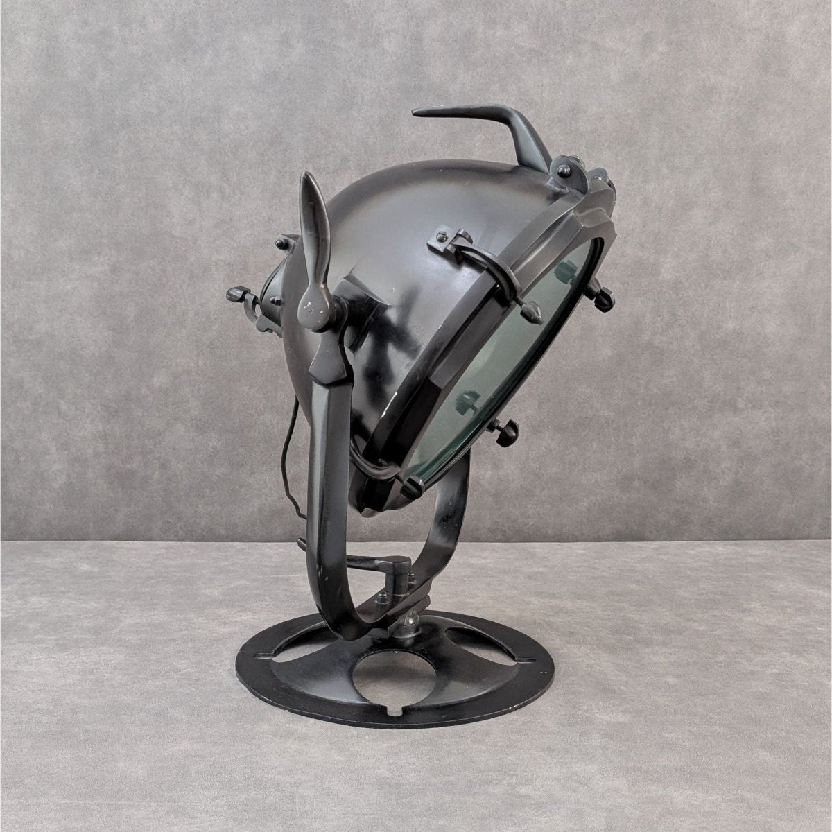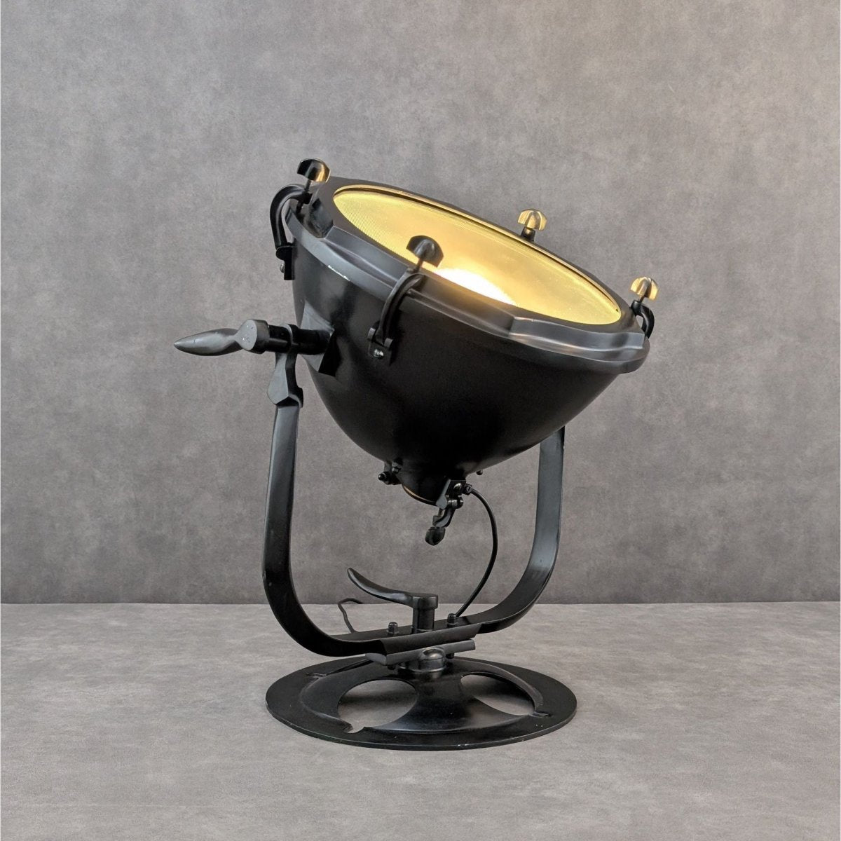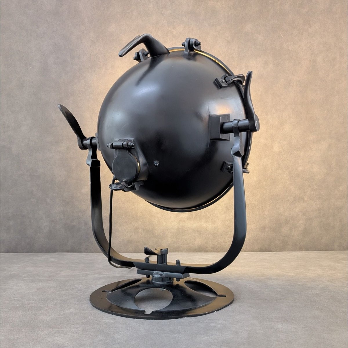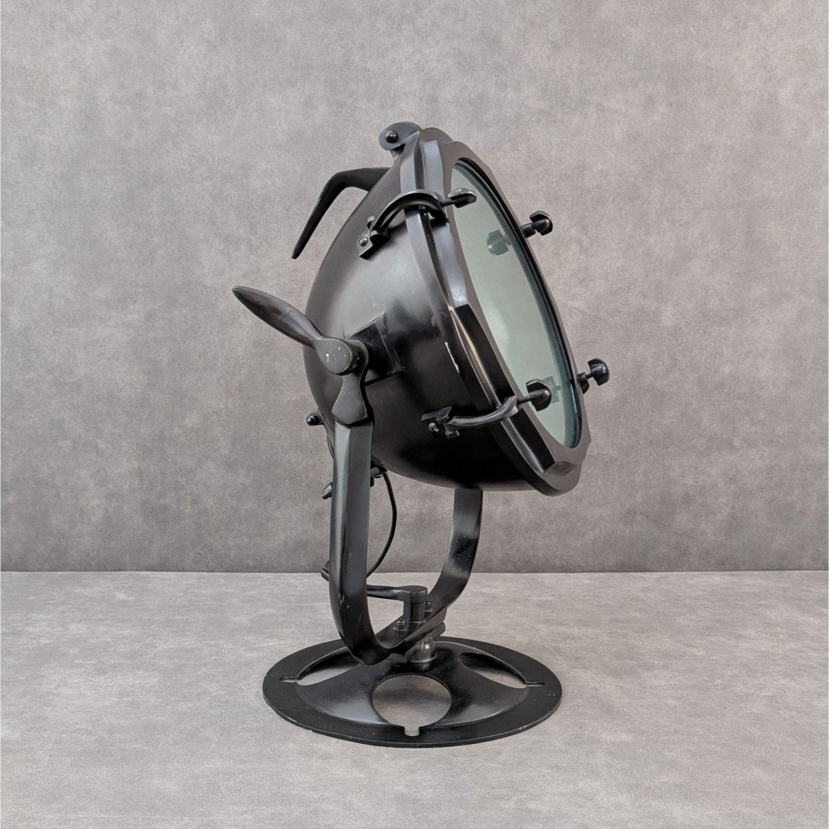 A piece of studio character that brings a grounded, atmospheric presence into any space. Created by THESIS, an interior design studio based in Cyprus, this searchlight style lamp carries the influence of maritime equipment reinterpreted for contemporary interiors. Formed in blackened cast metal with propeller like tilt arms, a circular base and a deep set housing, it recalls the functional language of shipboard lighting adapted for editorial, studio and residential environments. The frosted glass diffuser softens the throw, producing a warm ambient glow that works across desks, consoles and display areas. Rarely seen in Australia, it retains the substance and intent of its international provenance.