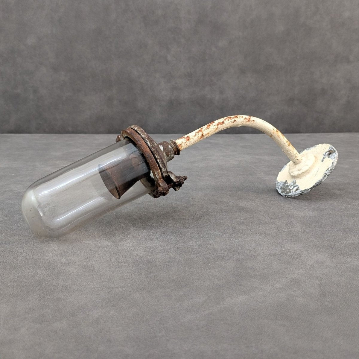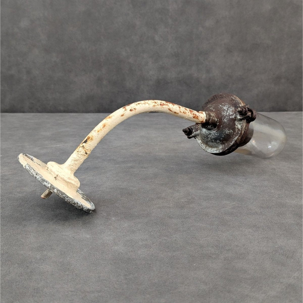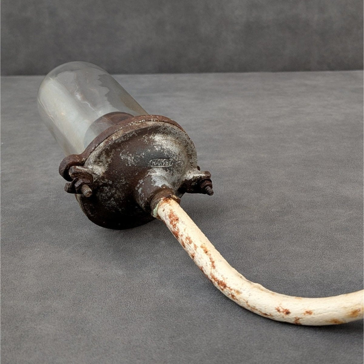 A relic of labour, carrying the quiet gravity of its working past. Built in the early twentieth century for heavy industry, this Harvey stamped fixture was engineered for resilience, its cast metal body and thick glass cover protecting the bulb in demanding environments. Used across marine, mining and factory settings, the design balanced practicality with durability, allowing crews to work with assurance in low light. Time has marked the surface, yet the structure remains compelling, an object shaped by use and endurance, steady in its presence.