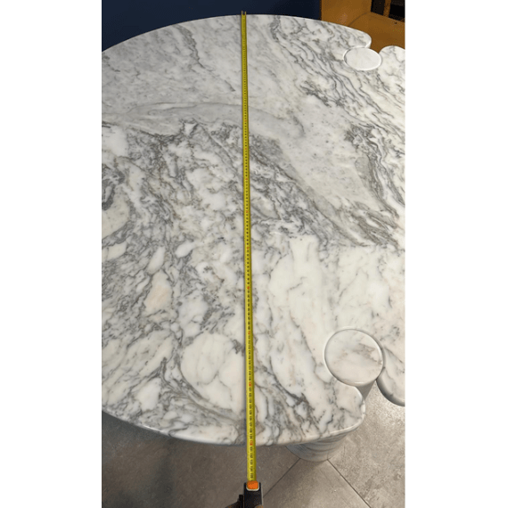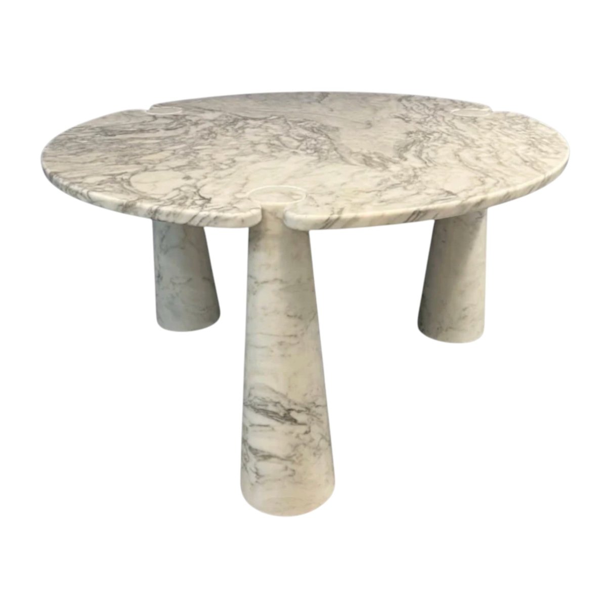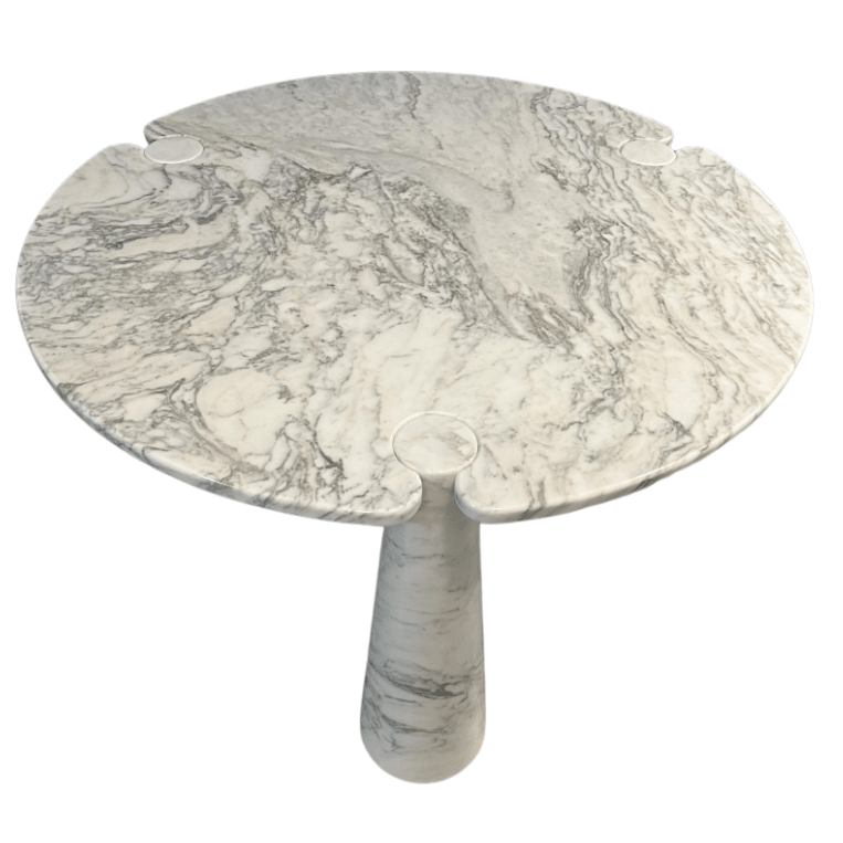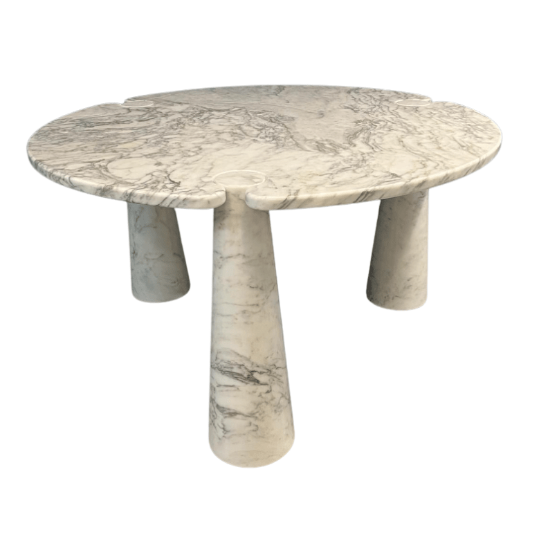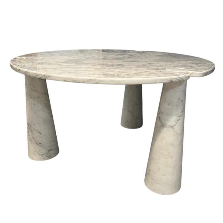 Designed by Angelo Mangiarotti, this iconic ‘Eros’ table features a white Carrara marble top supported by three interlocking conical bases. Its soft curves, subtle veining, and modernist elegance make it a timeless centrepiece, ideal for dining or lounge spaces.
