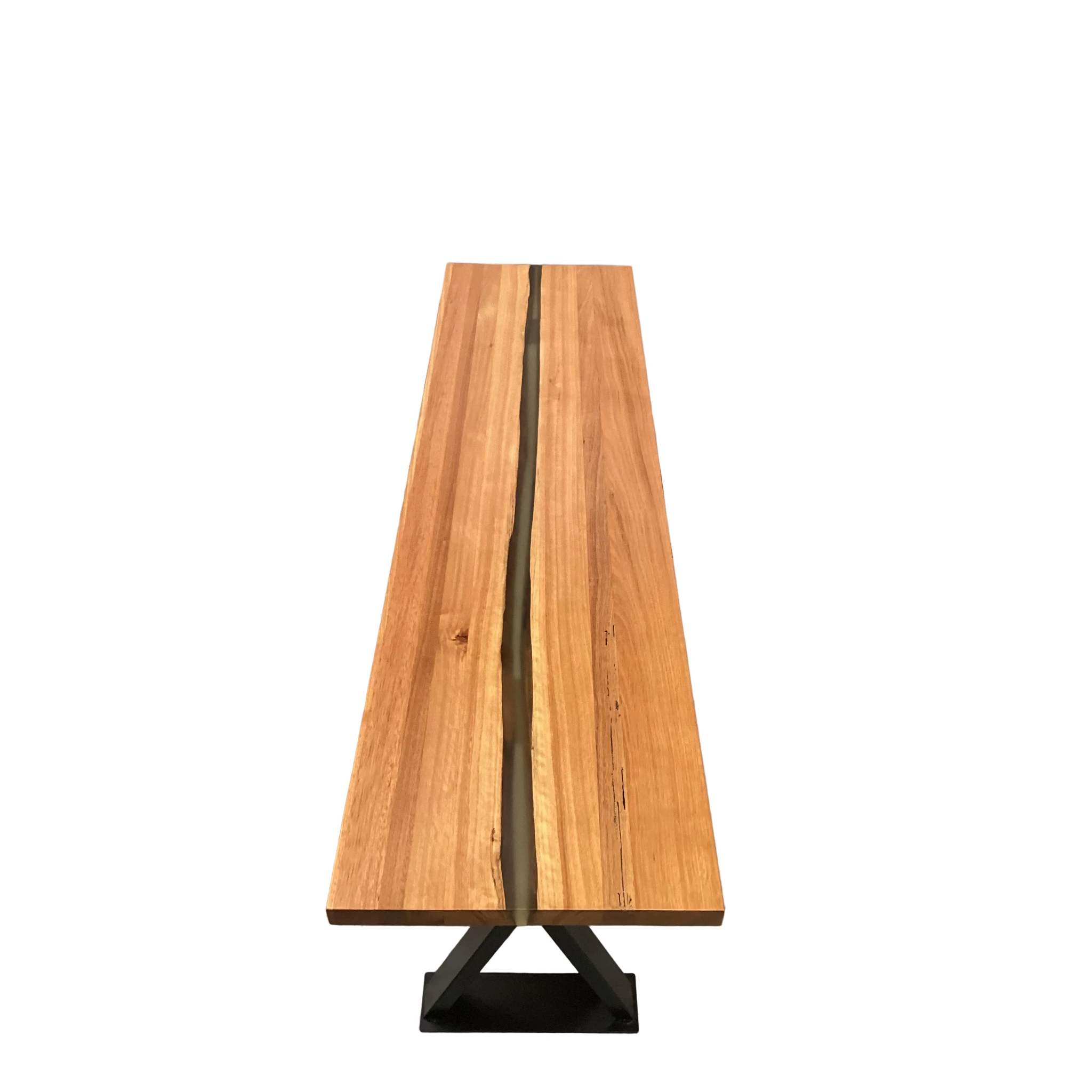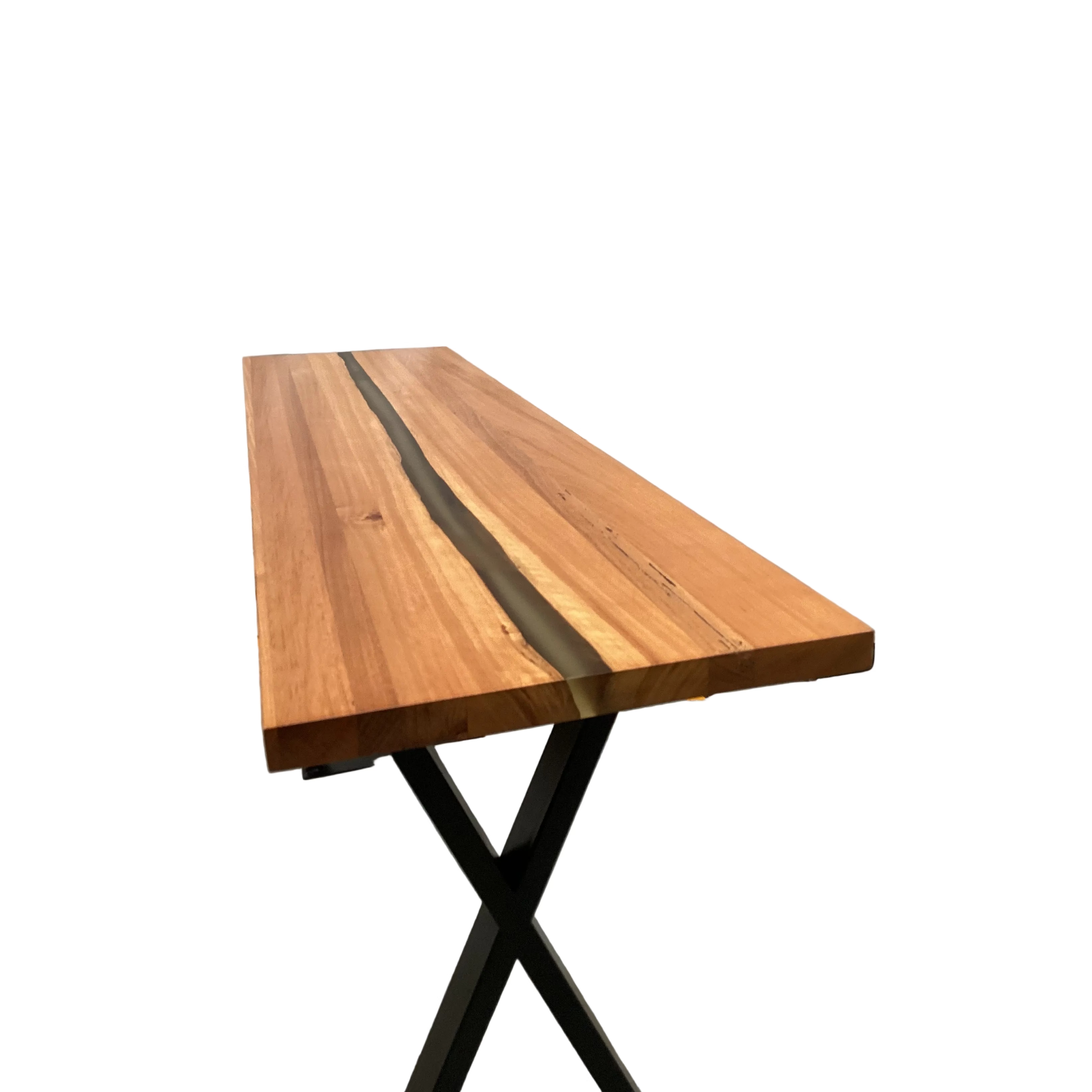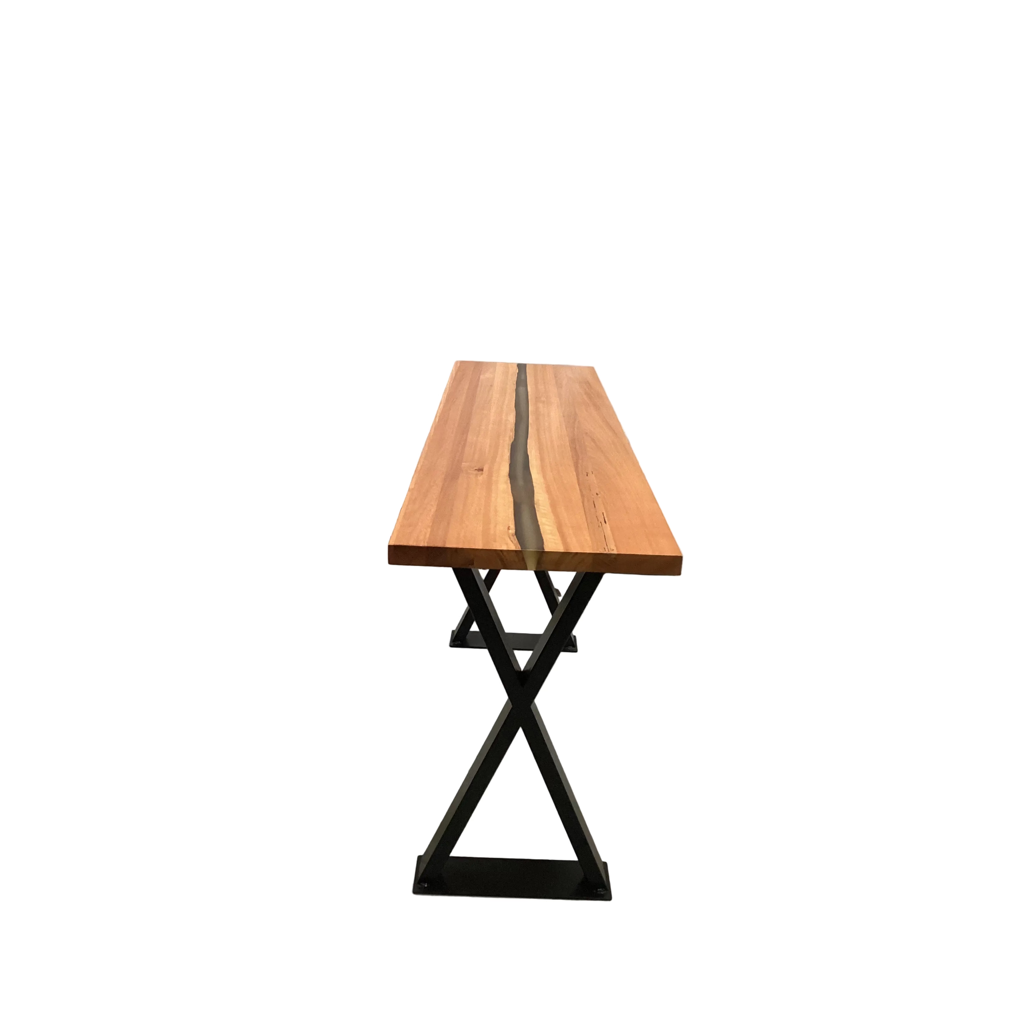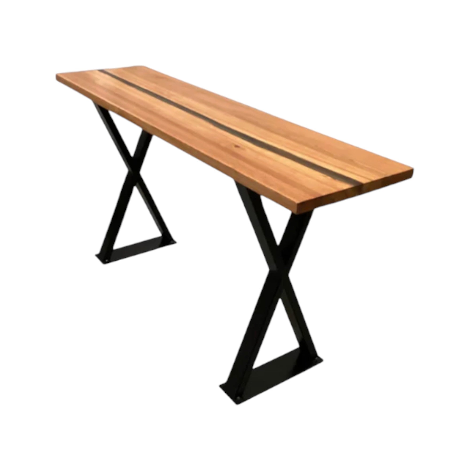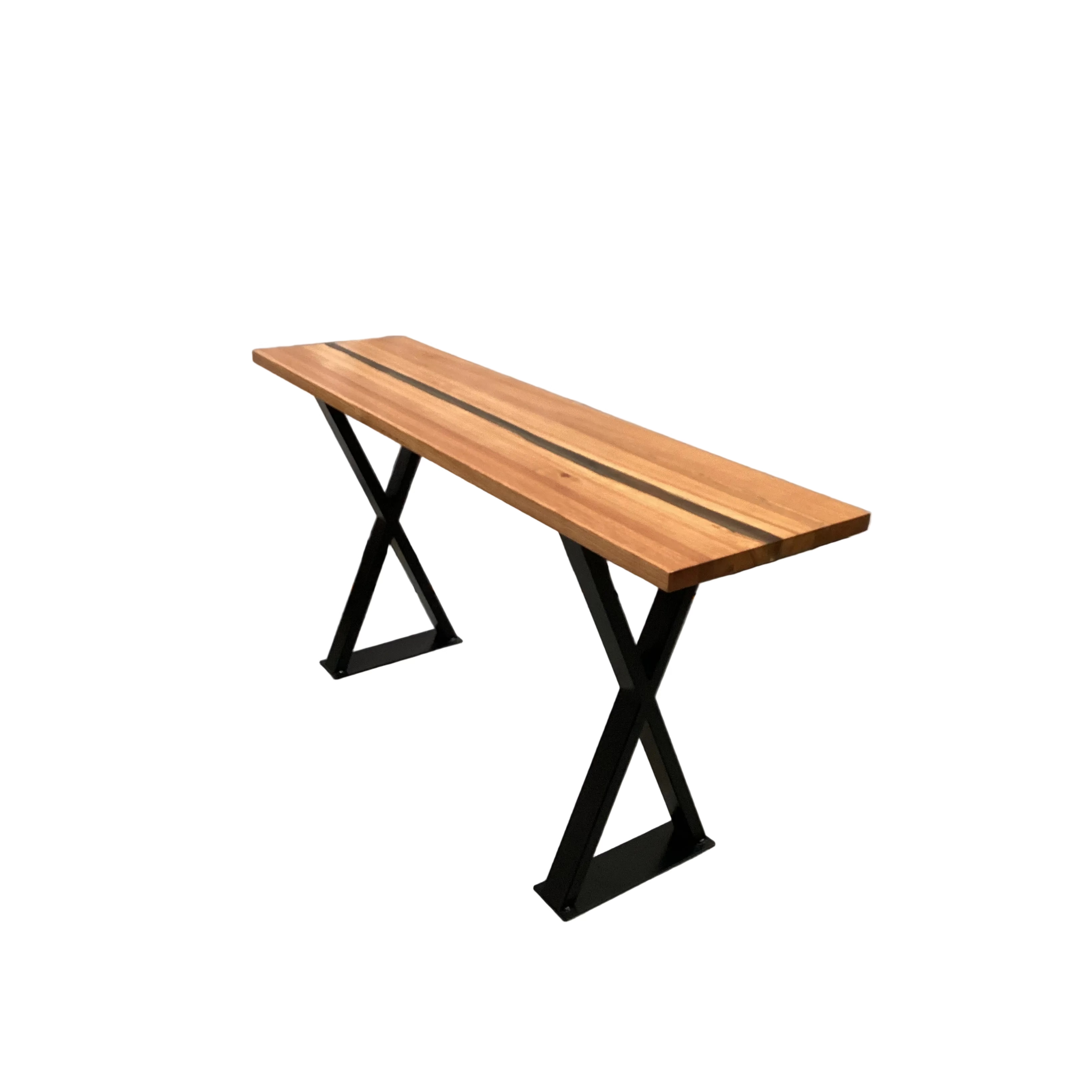 Elevate your entryway with this sophisticated hall table, where premium American oak meets contemporary artistry. The tabletop features an elegant resin inlay that adds depth and visual intrigue to the natural wood surface. Anchored by distinctive black cross-frame legs, this piece delivers both structural integrity and modern aesthetic appeal. A masterfully crafted statement piece that balances functionality with design excellence.