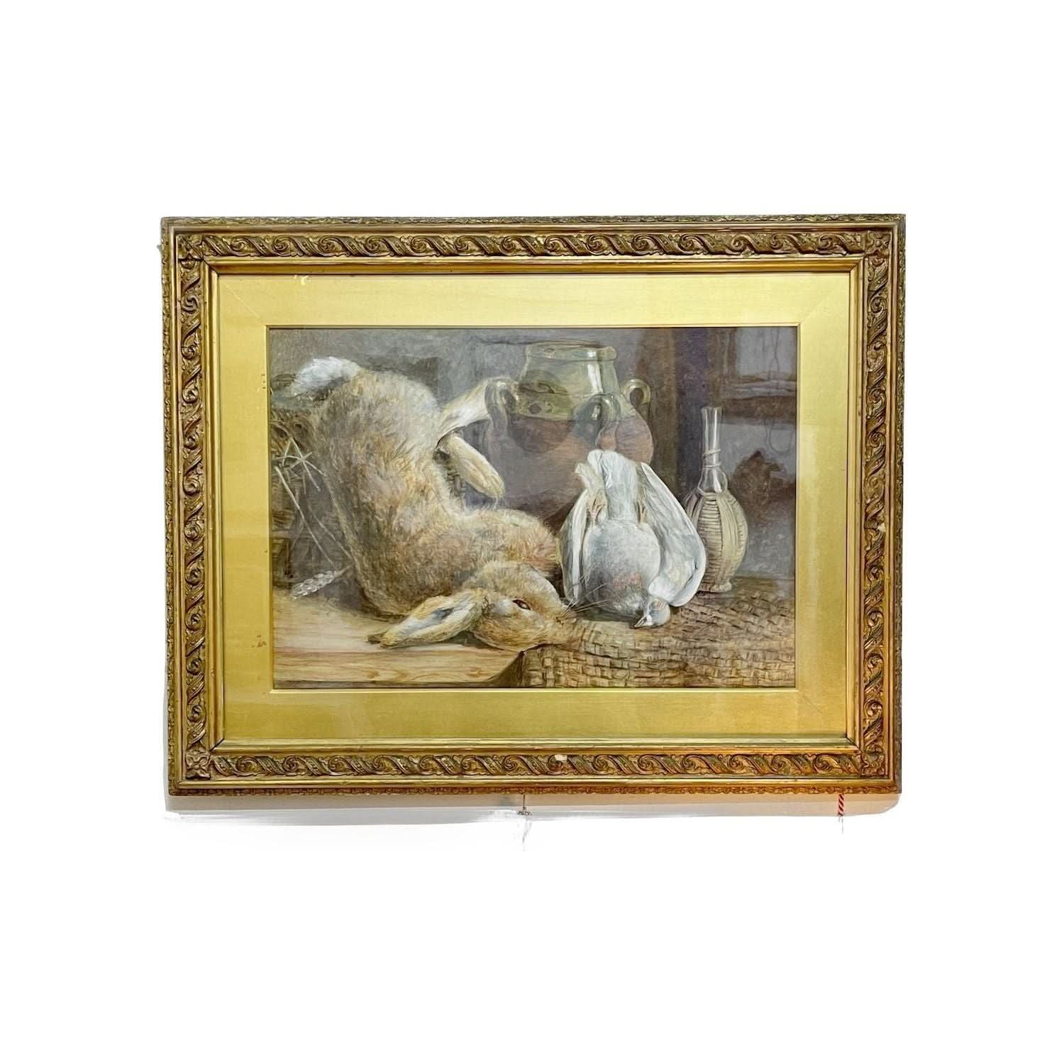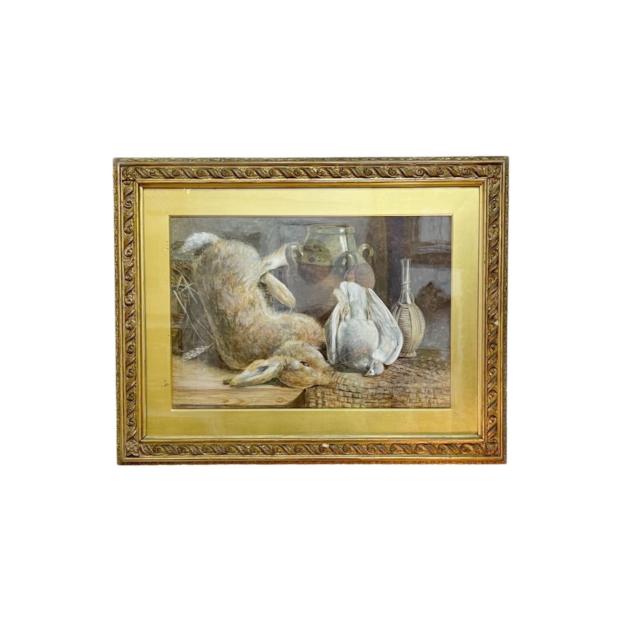 A nicely painted 19thc English watercolour still life momento mori with rabbit and bird housed in its original antique watergilded frame and slip. size: 55cm h x 70cm w