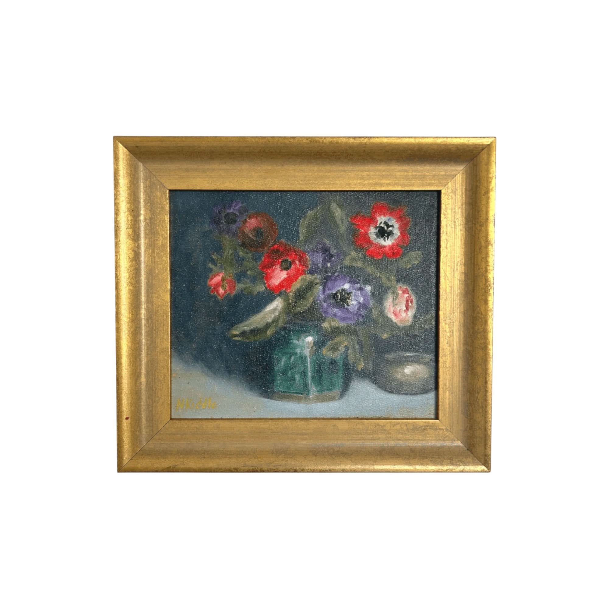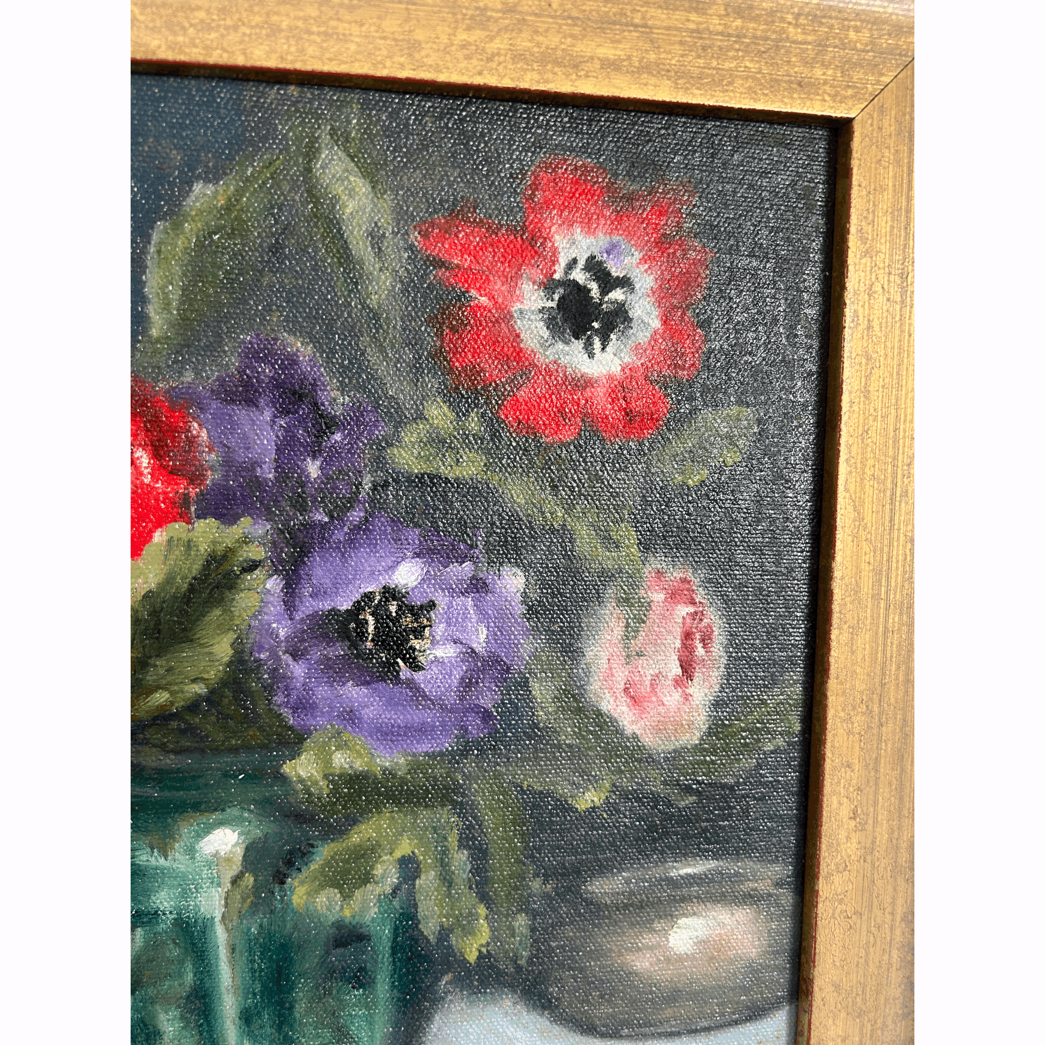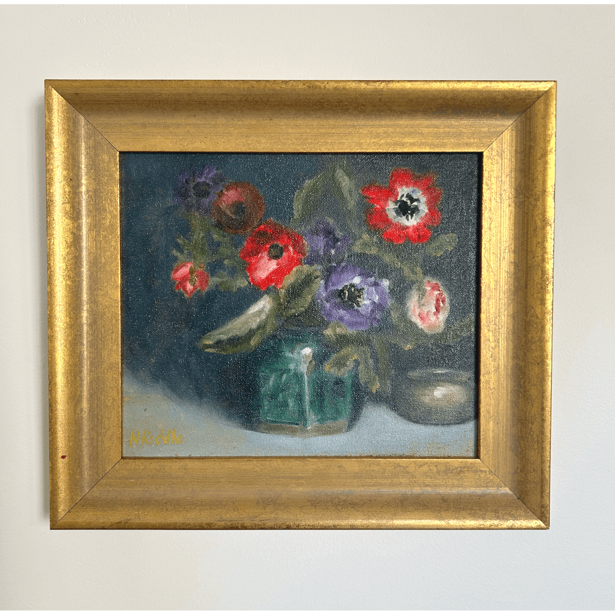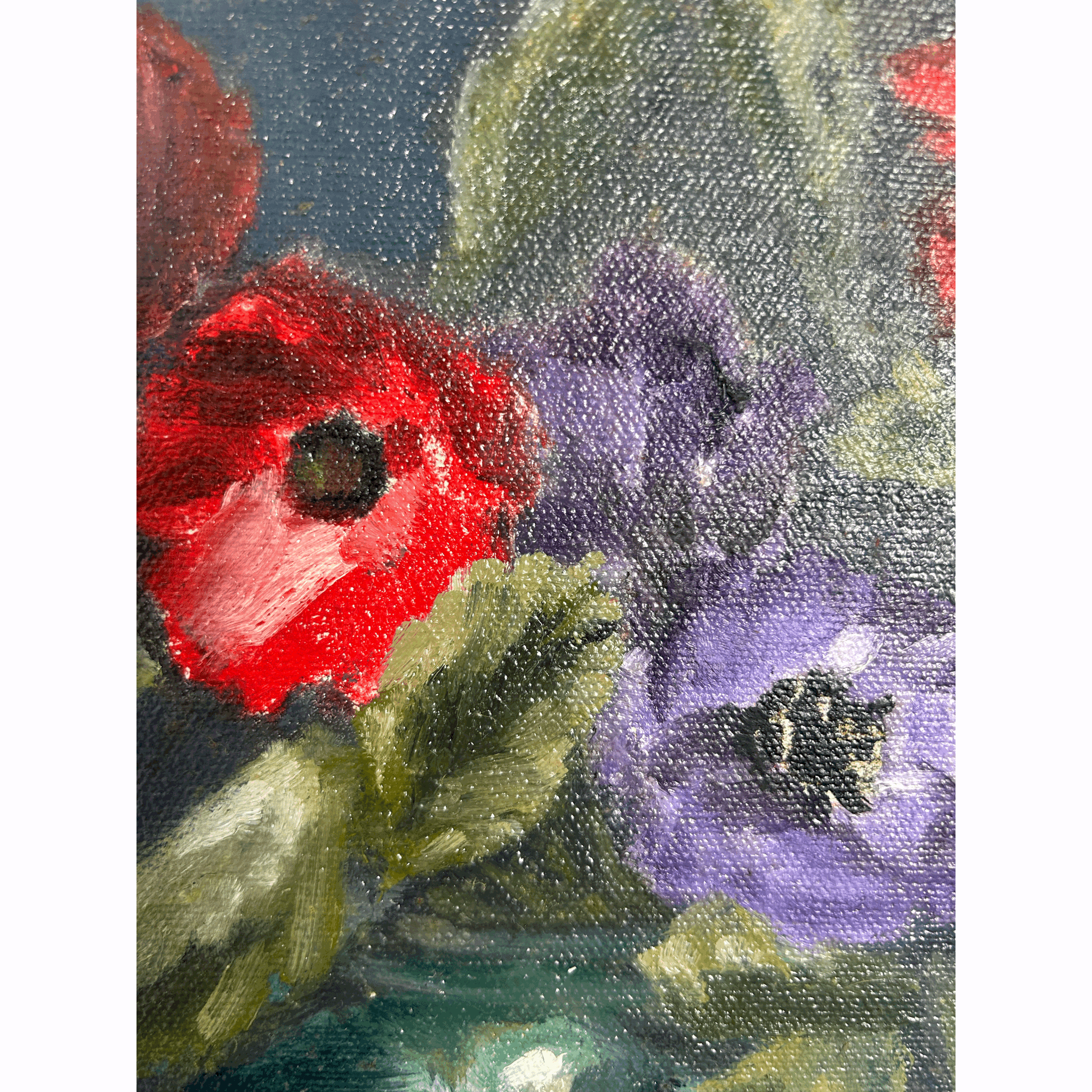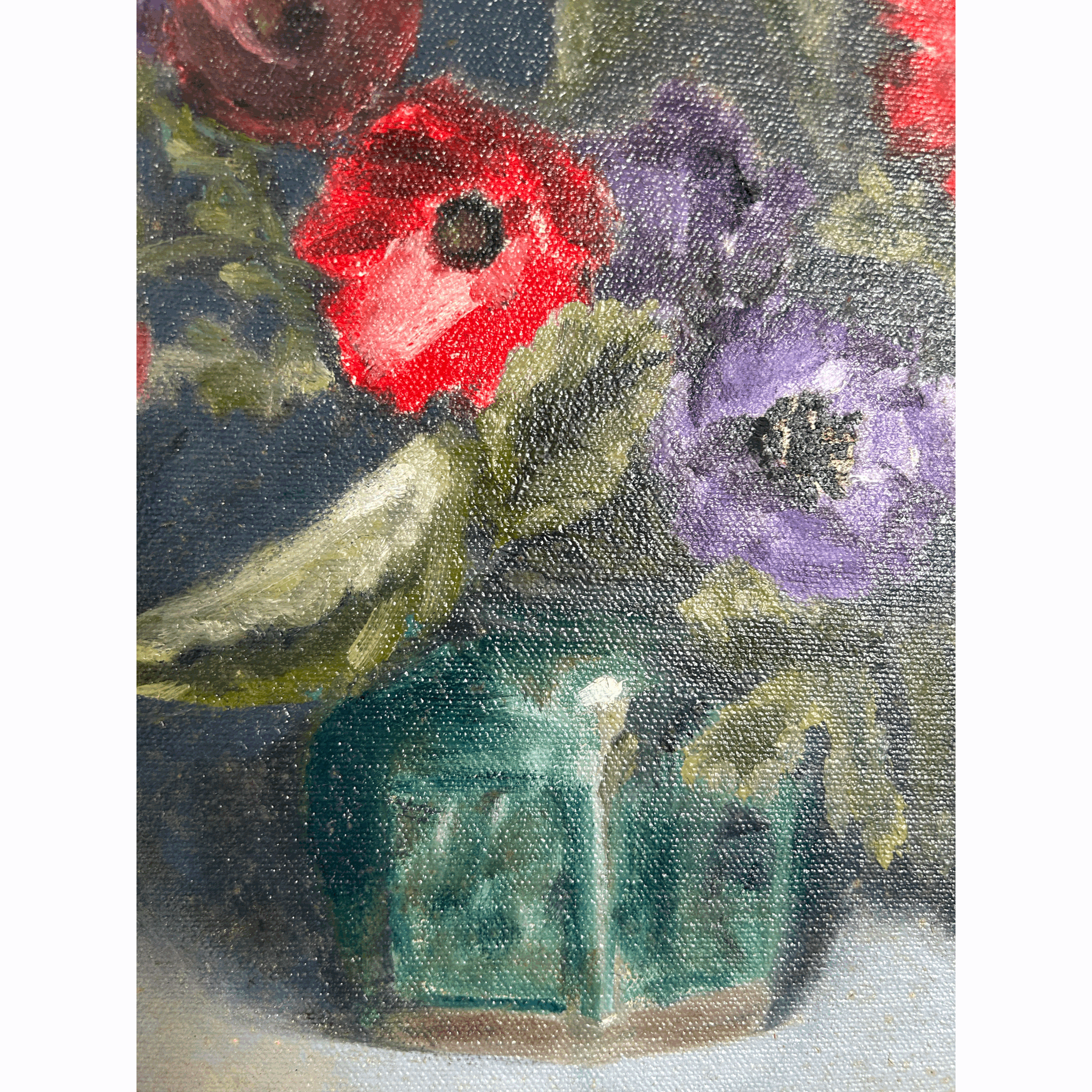 A charming still life by Natasha Kiddl, this original oil painting captures the fleeting beauty of anemones in bloom. Vivid reds, purples and soft pinks emerge from a darkened background, anchored by a delicate green glass ginger jar that reflects the artist’s sensitivity to light and form.
