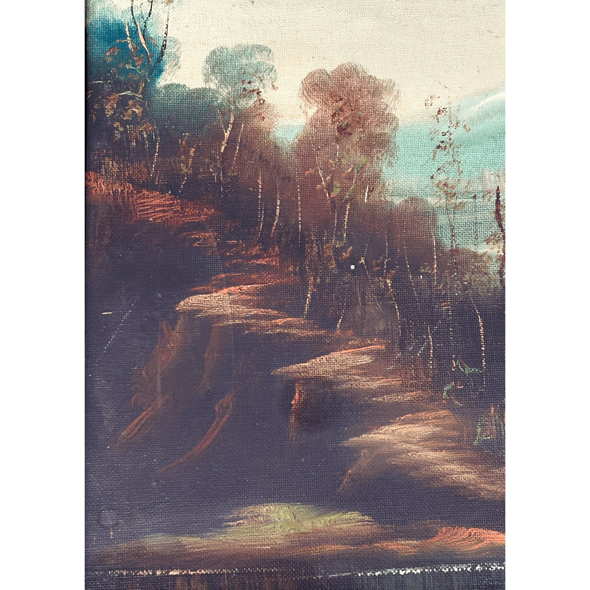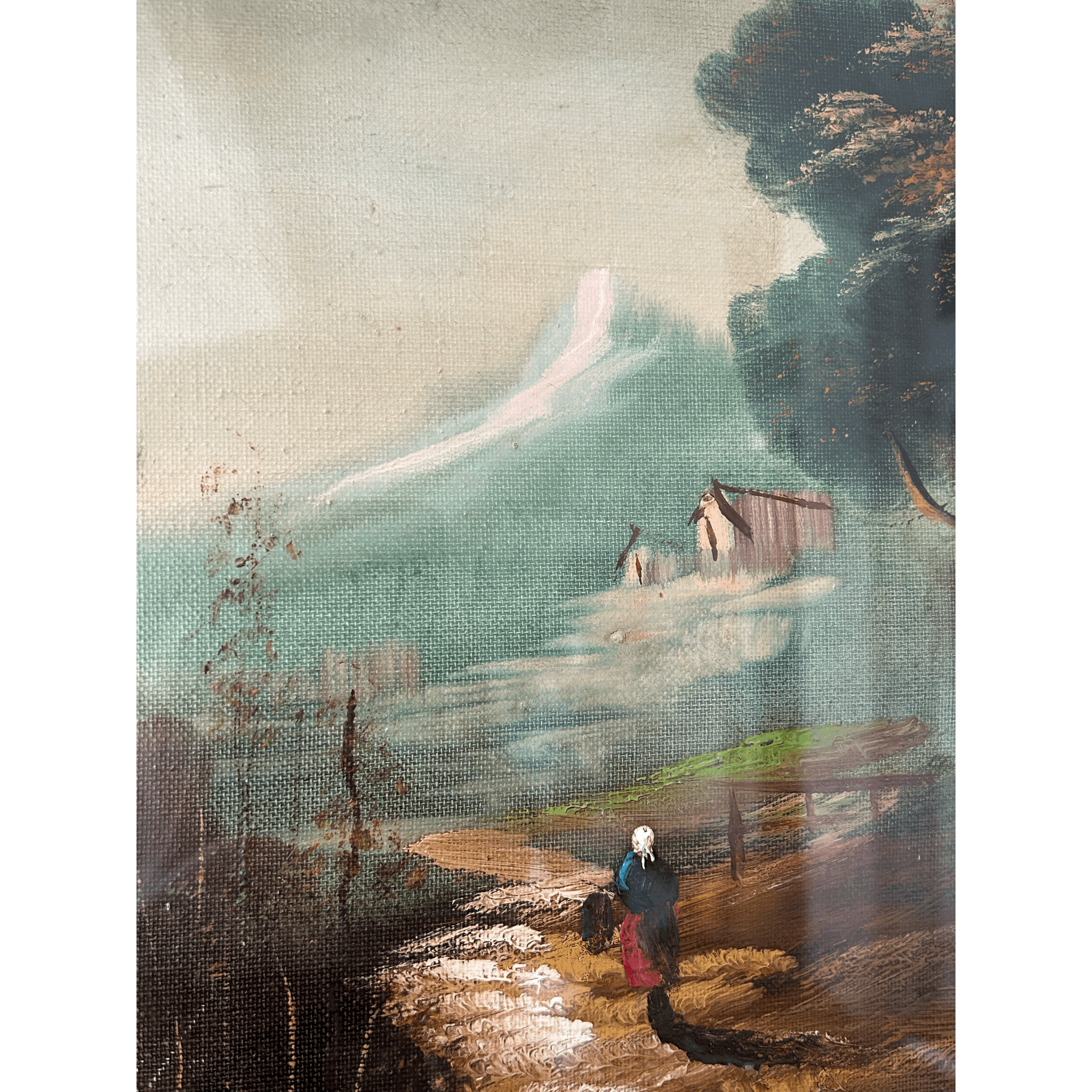 A beautifully rendered 20th-century landscape painting, capturing the timeless charm of a lone figure walking a winding country path beneath towering trees. The composition leads the viewer through layers of moody greenery toward a misty, snowcapped mountain—offering a sense of movement and quiet solitude.