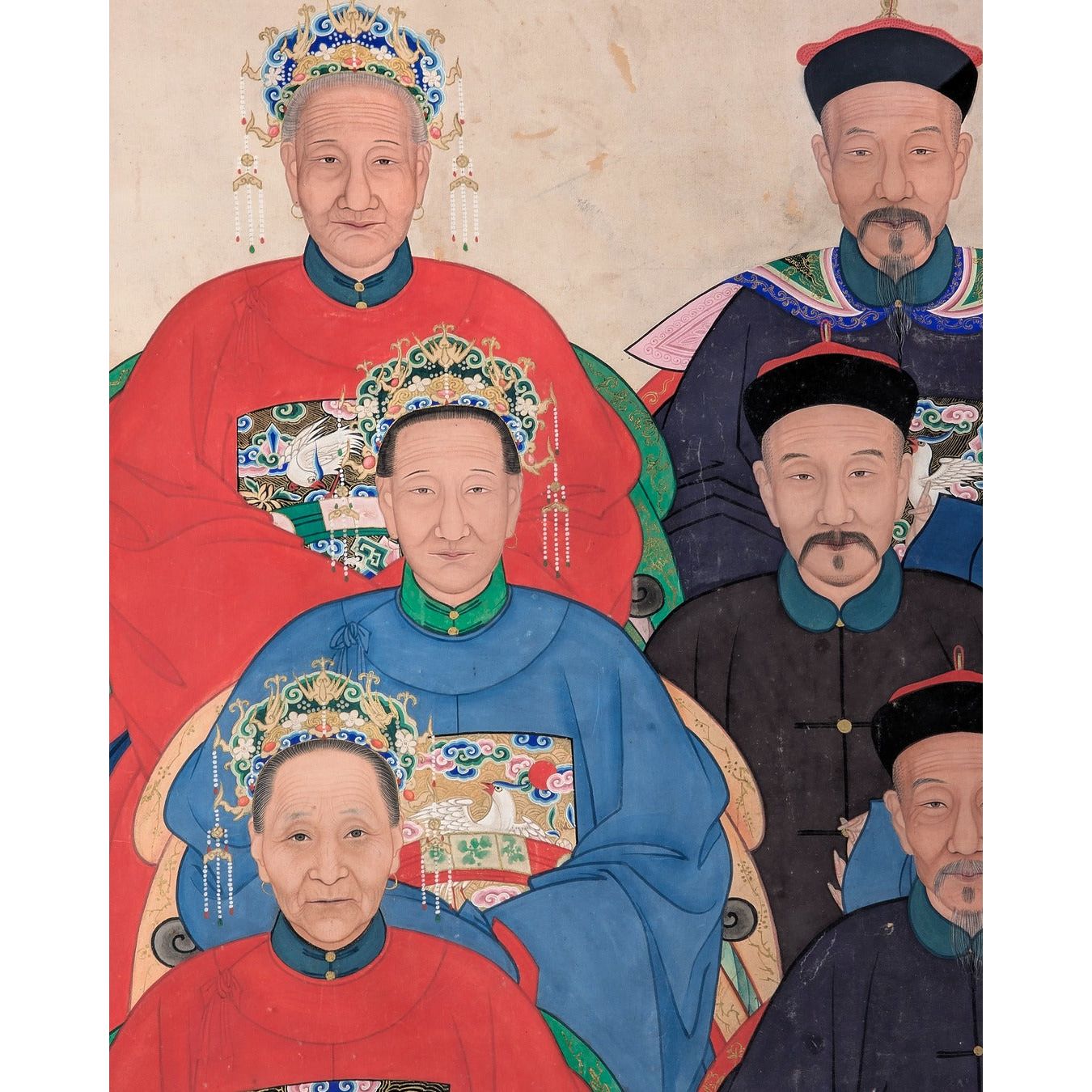 This exceptional 19th-century Chinese ancestral watercolour portrait captures three generations or couples of a noble family from the Qing court. Rendered in watercolour and gouache on paper, the artwork portrays its subjects with serene dignity, dressed in the formal, richly-coloured robes that signified their official rank and status.