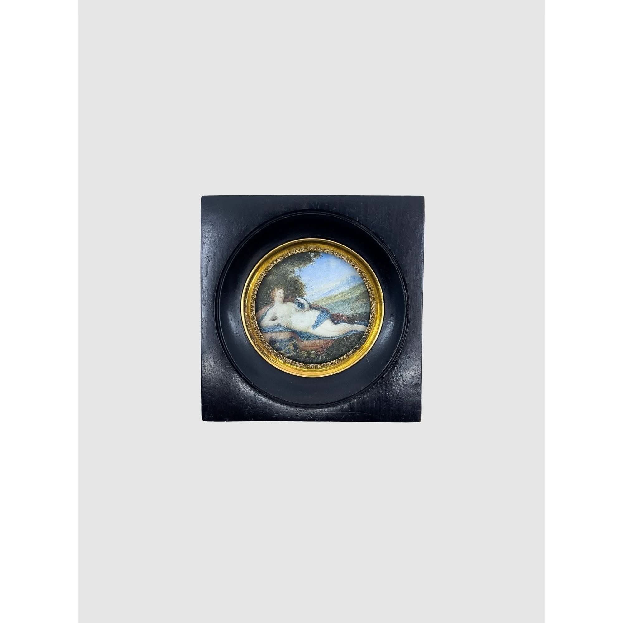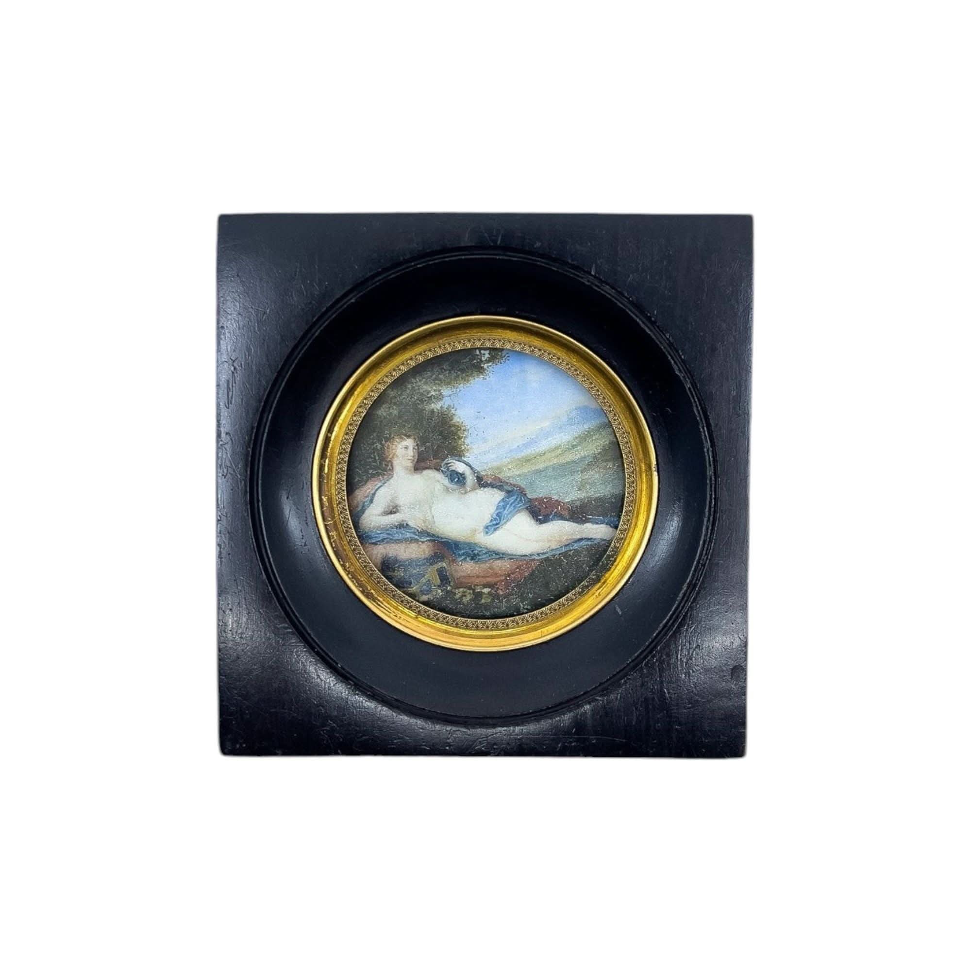 Antique miniature painting on ivory of a reclining nude in black and gilt frame.