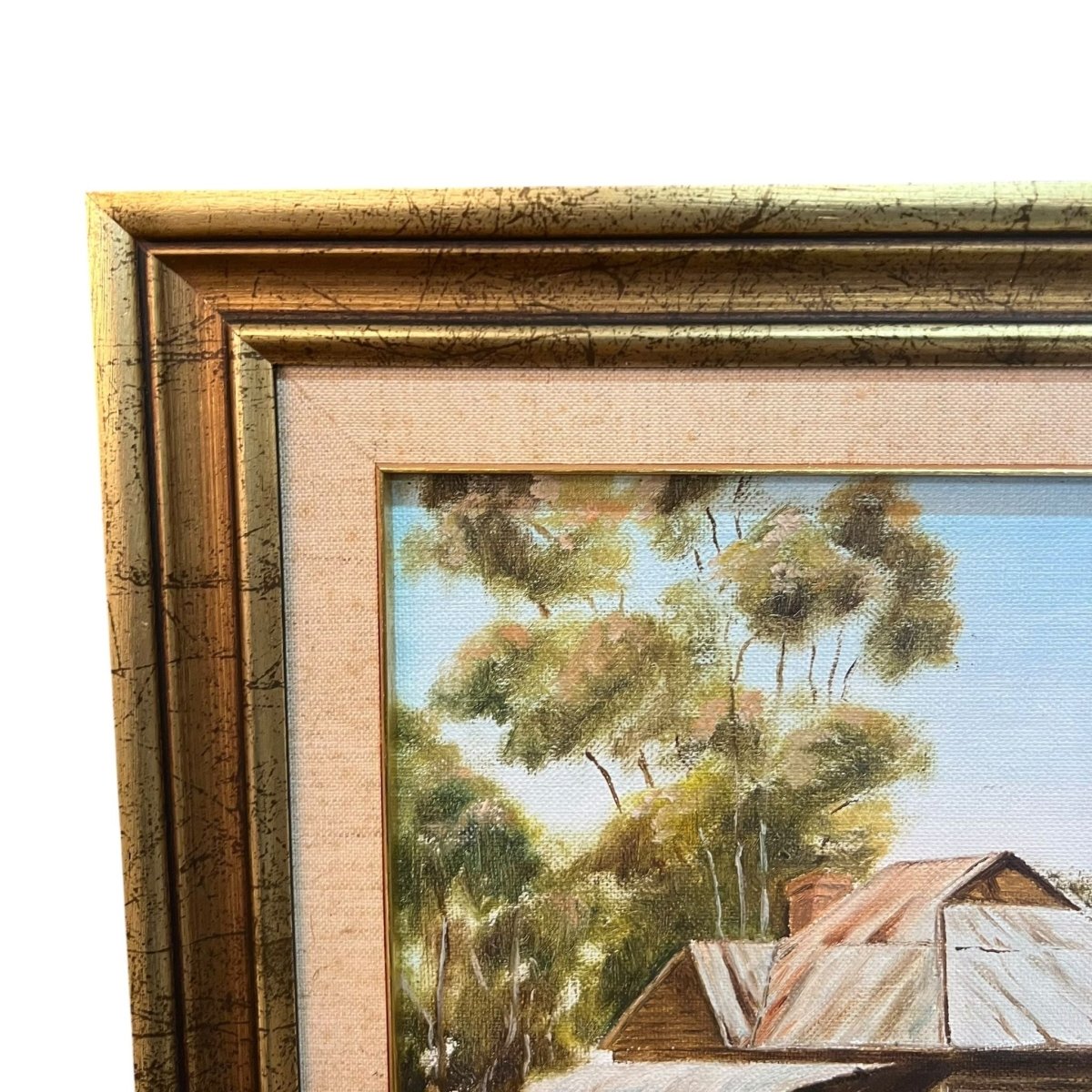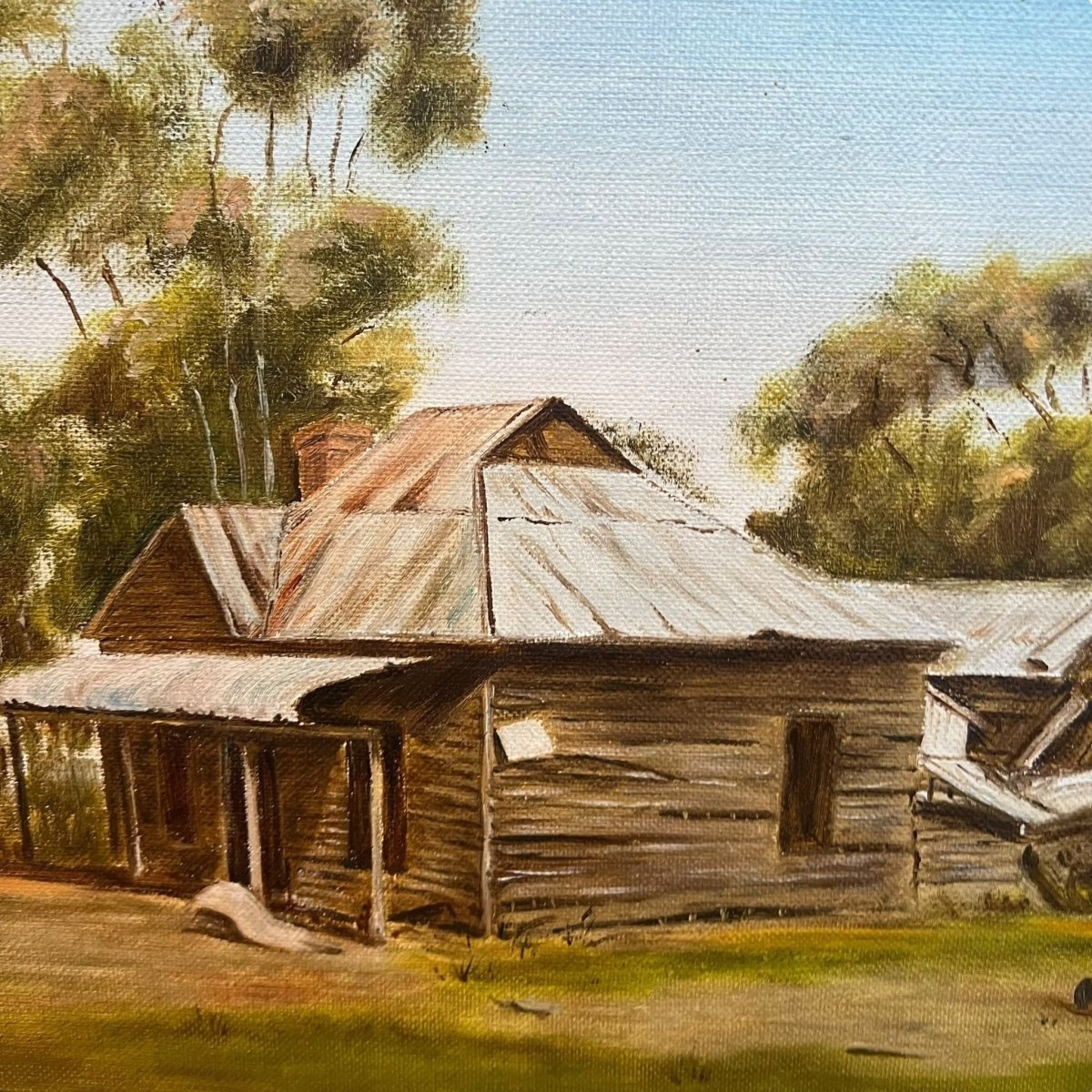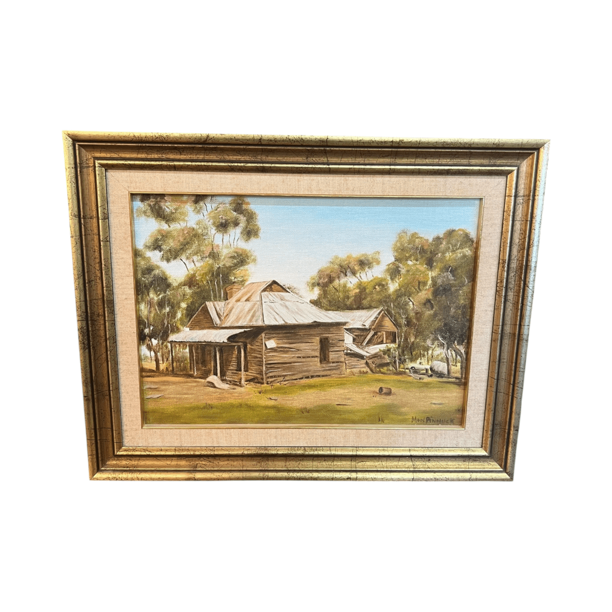 Original oil painting by Australian artist Mon Pendreigh, titled “McMurray’s Old House” – Pine Lodge, southwest of Finley. This beautifully detailed work captures the rustic charm of an old homestead surrounded by eucalyptus trees and relics of rural life. The textured brushwork and warm palette reflect the stillness and nostalgia of country Australia.
