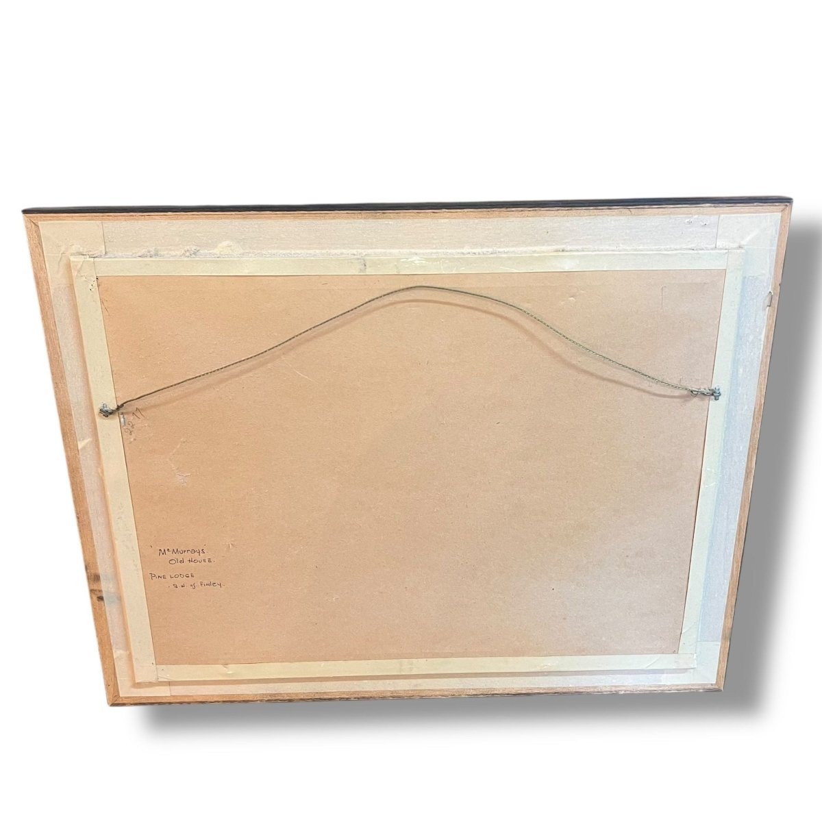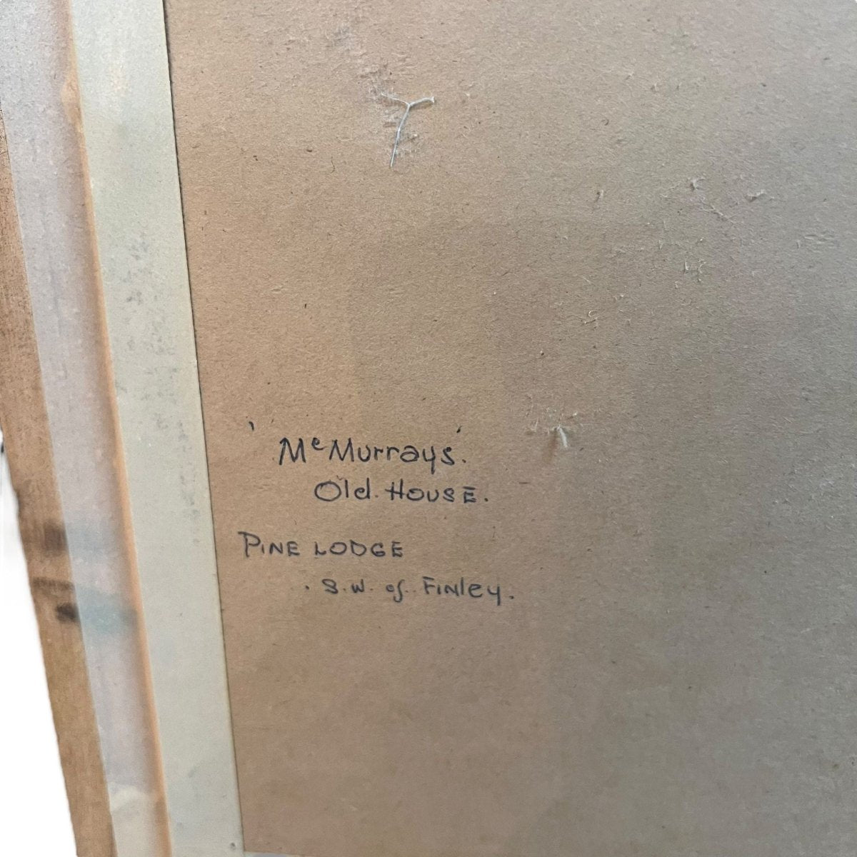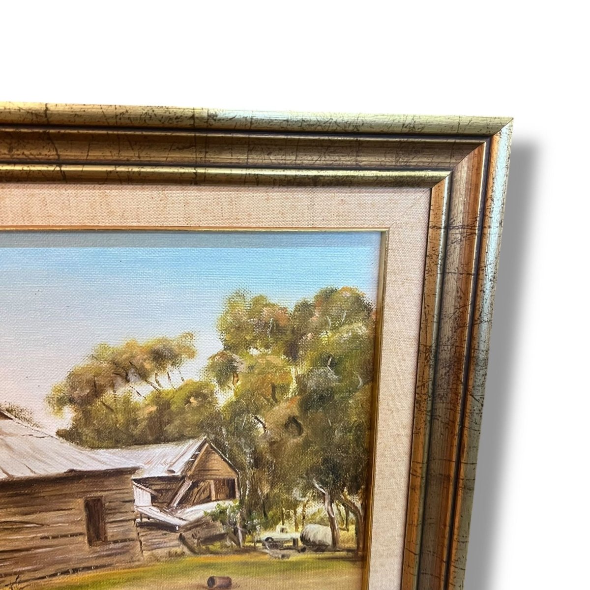 Original oil painting by Australian artist Mon Pendreigh, titled “McMurray’s Old House” – Pine Lodge, southwest of Finley. This beautifully detailed work captures the rustic charm of an old homestead surrounded by eucalyptus trees and relics of rural life. The textured brushwork and warm palette reflect the stillness and nostalgia of country Australia.
