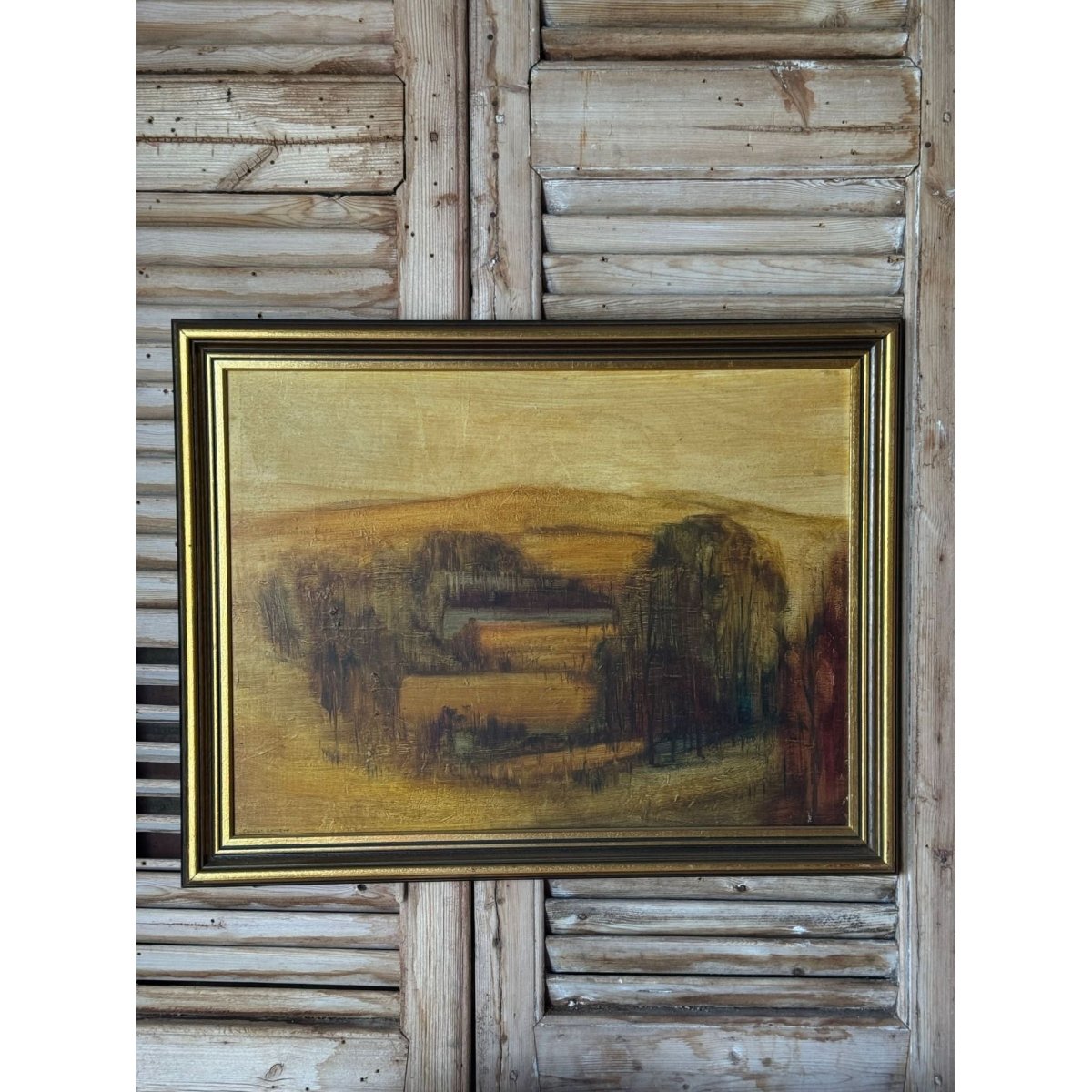The textured surface and warm palette lend the painting a moody, almost abstract quality, evoking both depth and stillness. Presented in its original gilt frame, this work carries a timeless decorative presence — ideal for adding richness and character to a wall or gallery-style interior display.