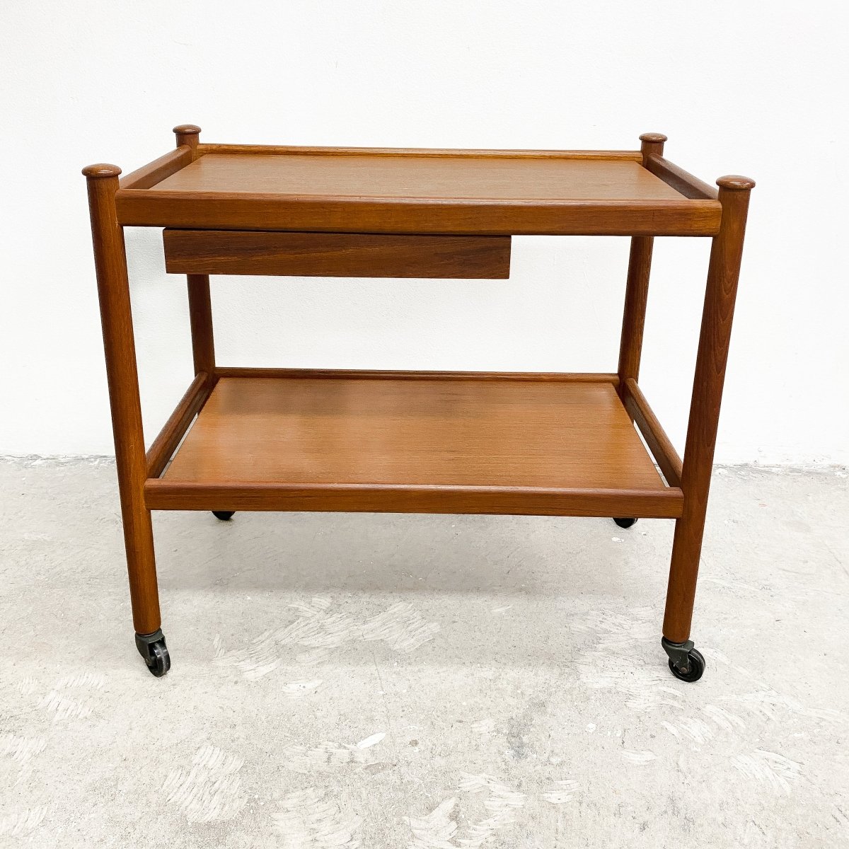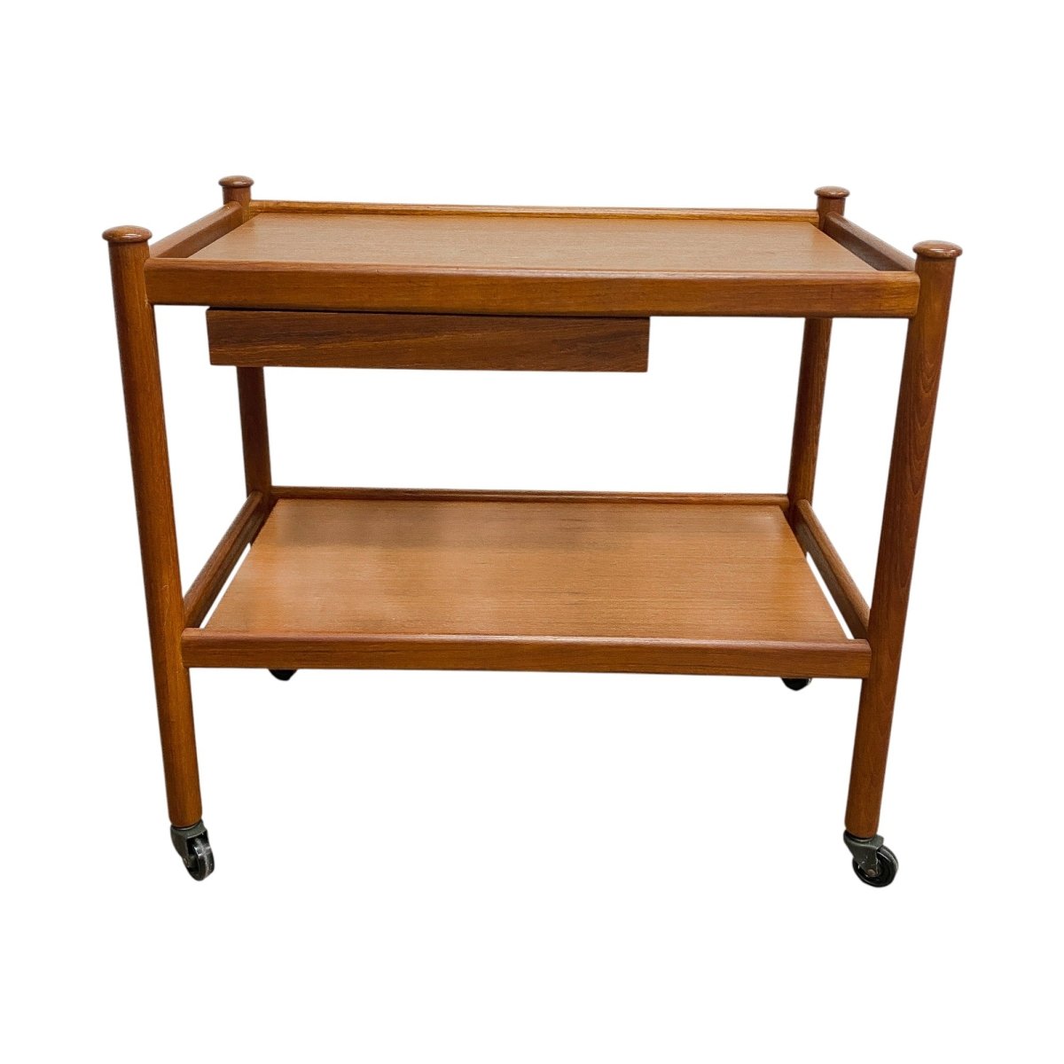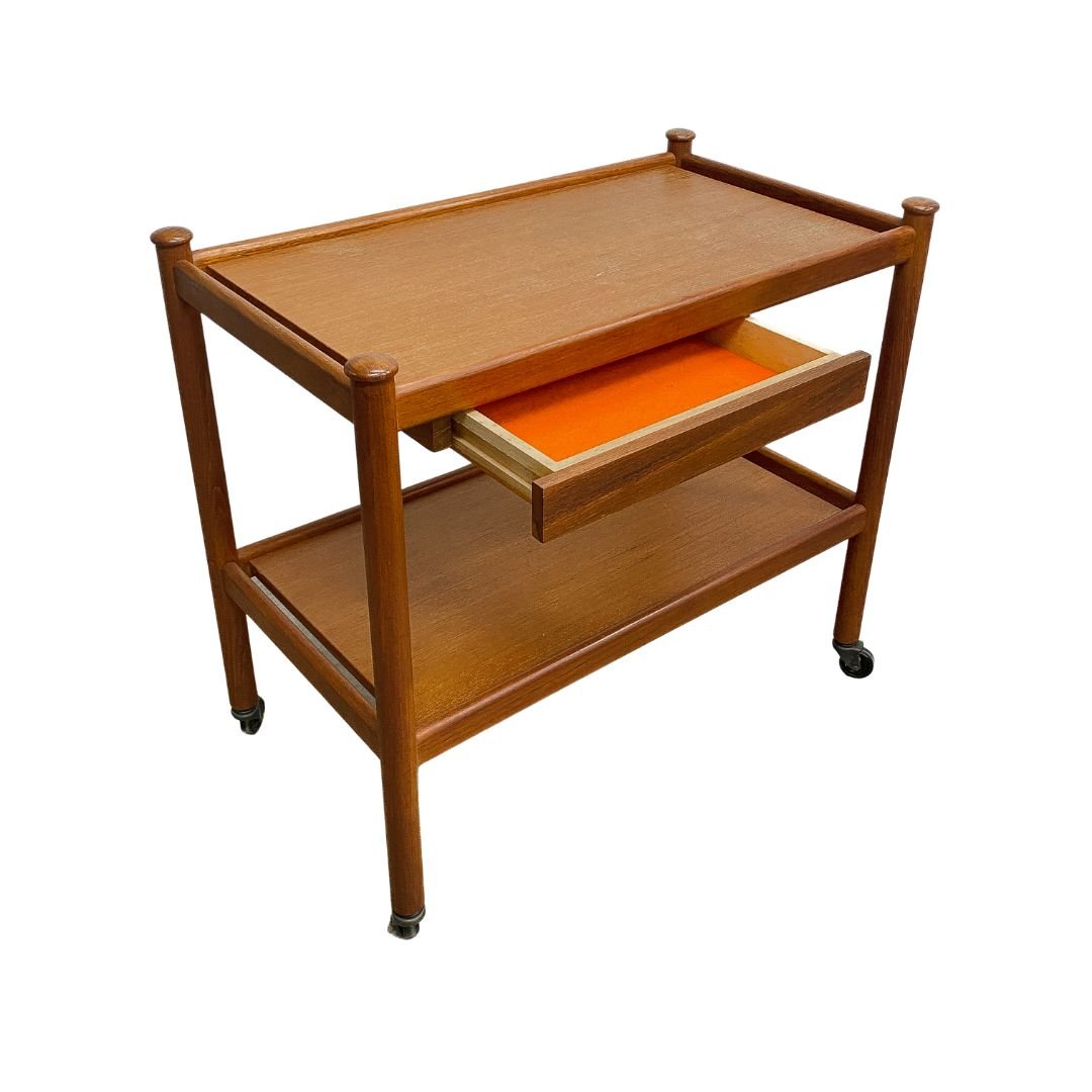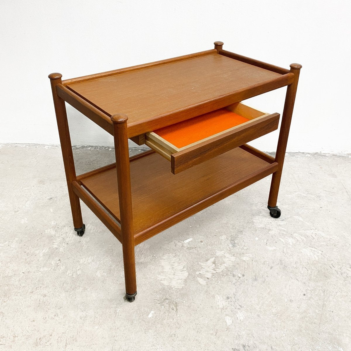 Classic mid century Parker two tier teak drinks trolley, with a orange felt lined drawer. The perfect addition to any living room or bar, and could also easily function as a side table.
