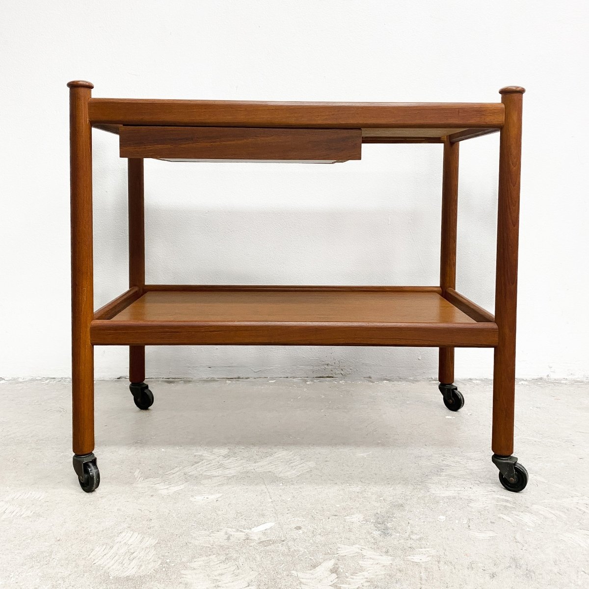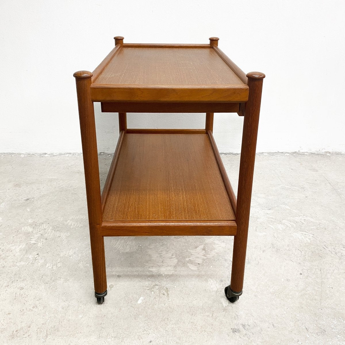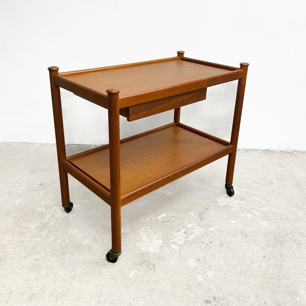 Classic mid century Parker two tier teak drinks trolley, with a orange felt lined drawer. The perfect addition to any living room or bar, and could also easily function as a side table.