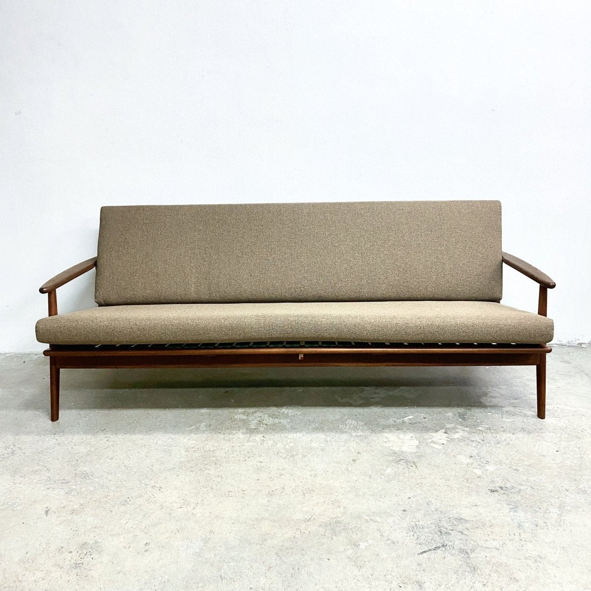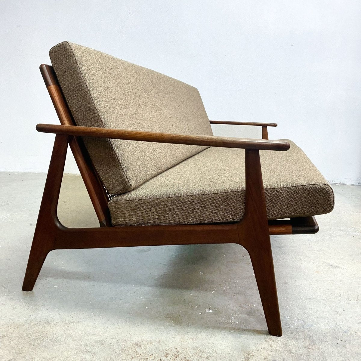 Sofa has new upholstery which includes all new strapping, new foam inserts and new covers. The frame is in excellent condition and has been polished