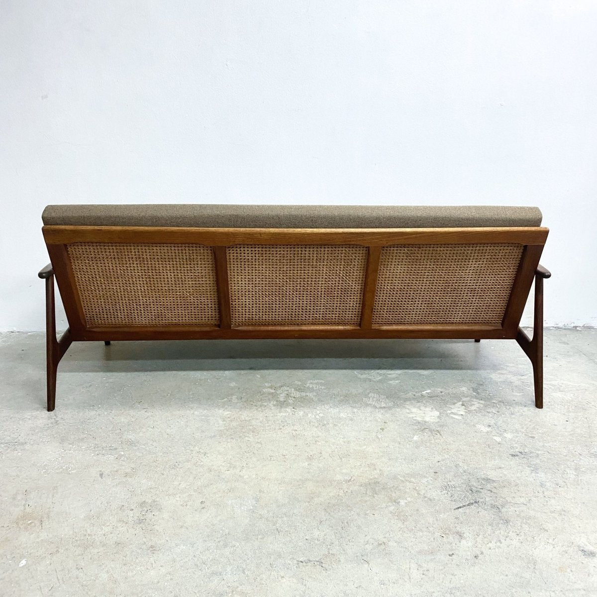 Classic mid century Parker three seater lounge with rattan back.