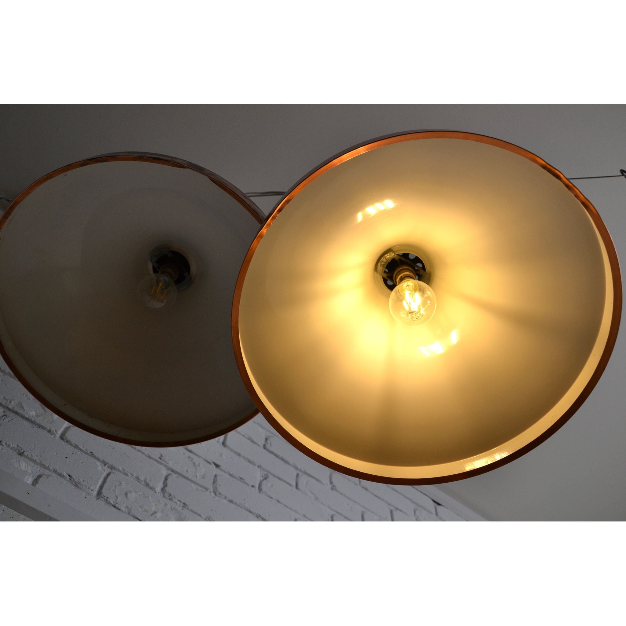 Dimensions- 440 w x 250 mm shade Condition- Full working order. Tested to work only. Light has corrosion/ patina, surface scratches. Each light has small dents to the edge, only on some edges. See pictures.