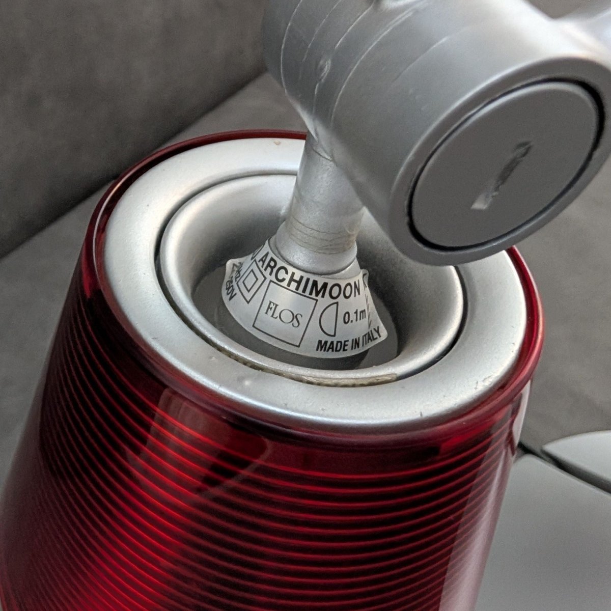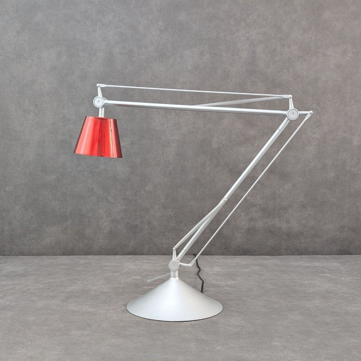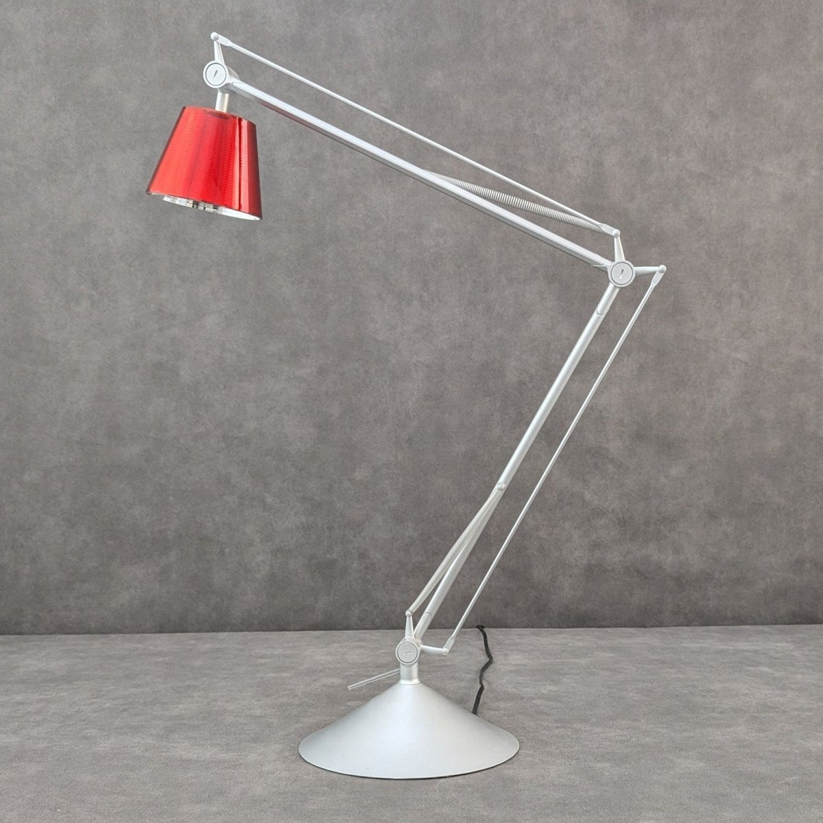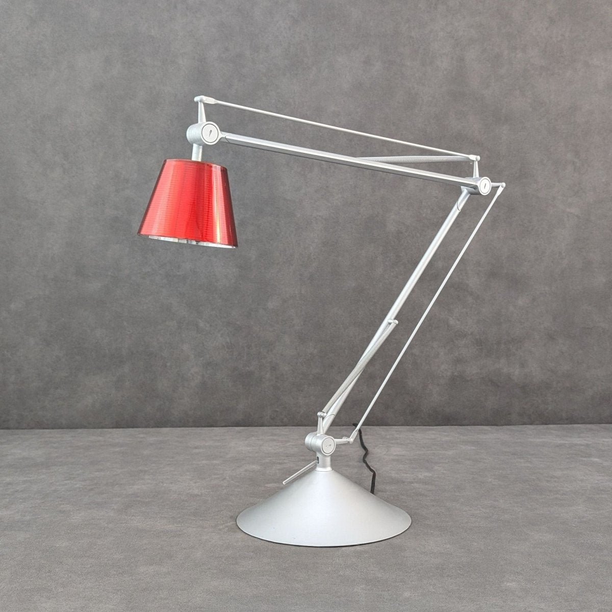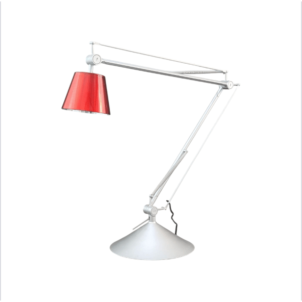 A study in Italian lightcraft that brings a considered, atmospheric presence into any space. Designed by Philippe Starck for Flos, Italy, the Archimoon K emerged from the early 2000s era of engineering driven table lamps, defined by counterbalanced arms, precision joints and calibrated illumination. Its articulated aluminium frame, spring tensioned and finely weighted, was created to move smoothly across desks and reading spaces with an almost mechanical grace. The rare red borosilicate shade, produced in notably smaller numbers than the standard variants, houses a dual diffuser system that produces a warm, focused glow sought after by collectors and Starck enthusiasts alike. A piece of contemporary Italian design that continues to carry the atmosphere of its maker’s intent.
