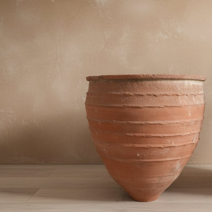 This original, solid and heavy vessel is exactly as shown. Originally used to store olive oil, it’s a one-of-a-kind piece that has weathered uniquely over time. Gathered layers of sediment paint and patina make it a stunning display piece.