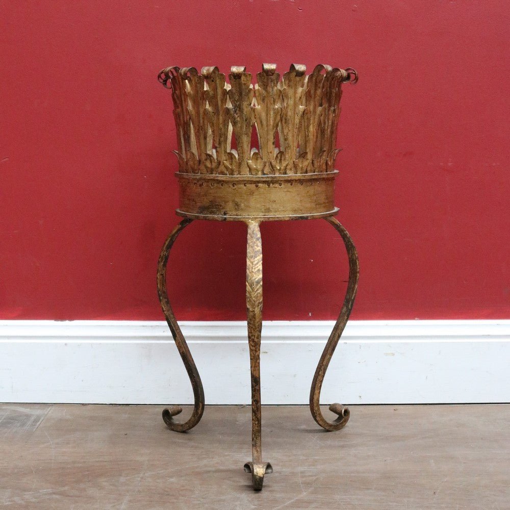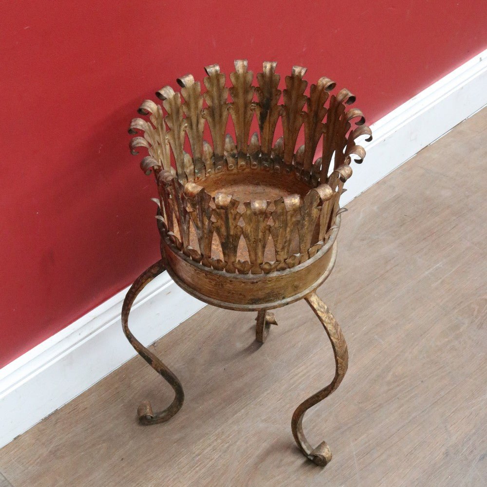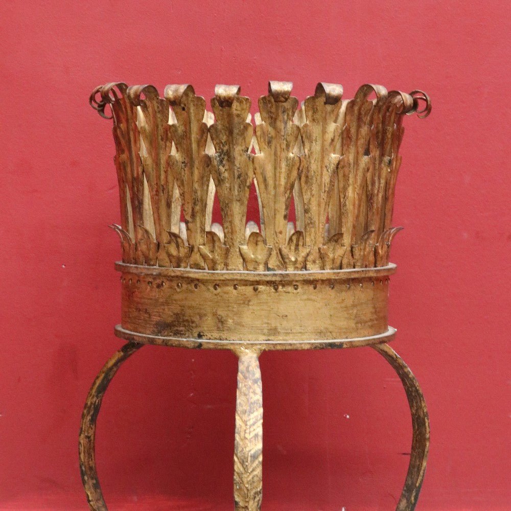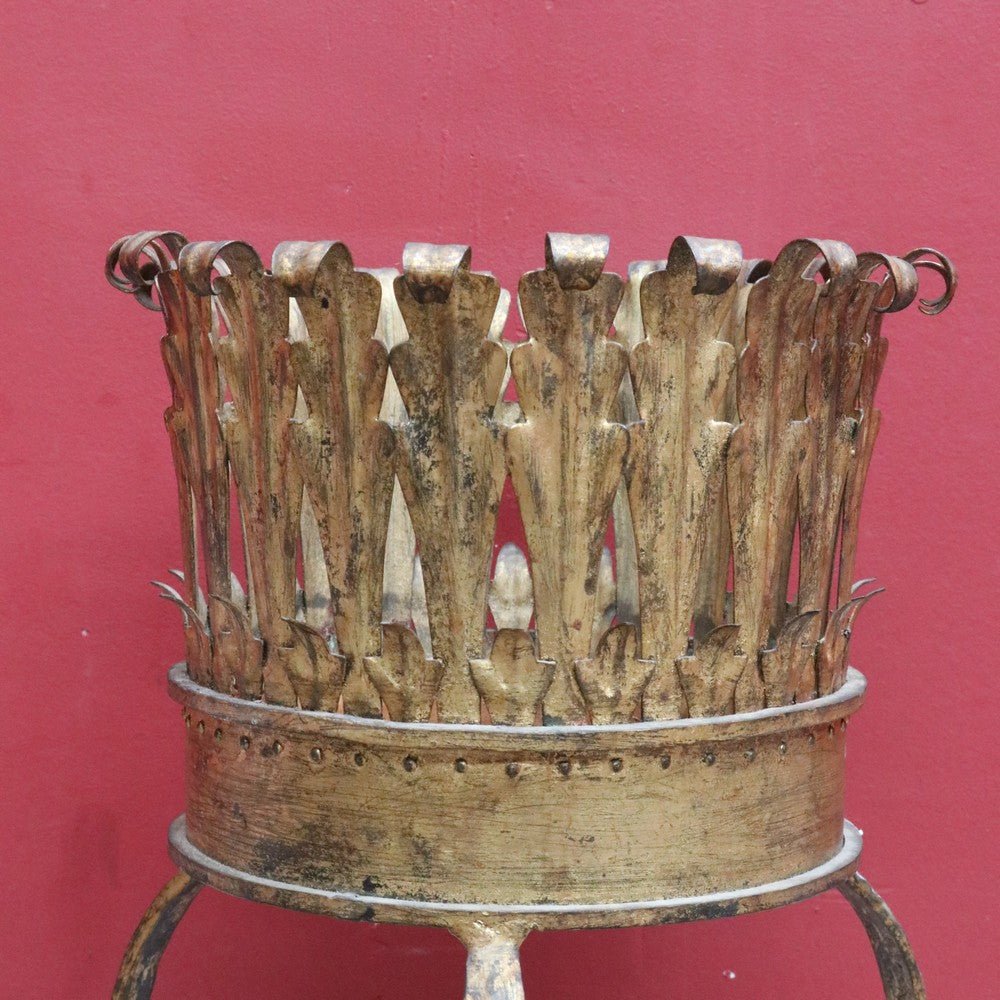 Description: An antique French jardinière holder featuring a hand-hammered gilt metal bowl with a leaf motif rim that curves gently outward at the top. The stand is raised on curved tripod legs with a plait pattern, giving the piece elegance and visual interest.