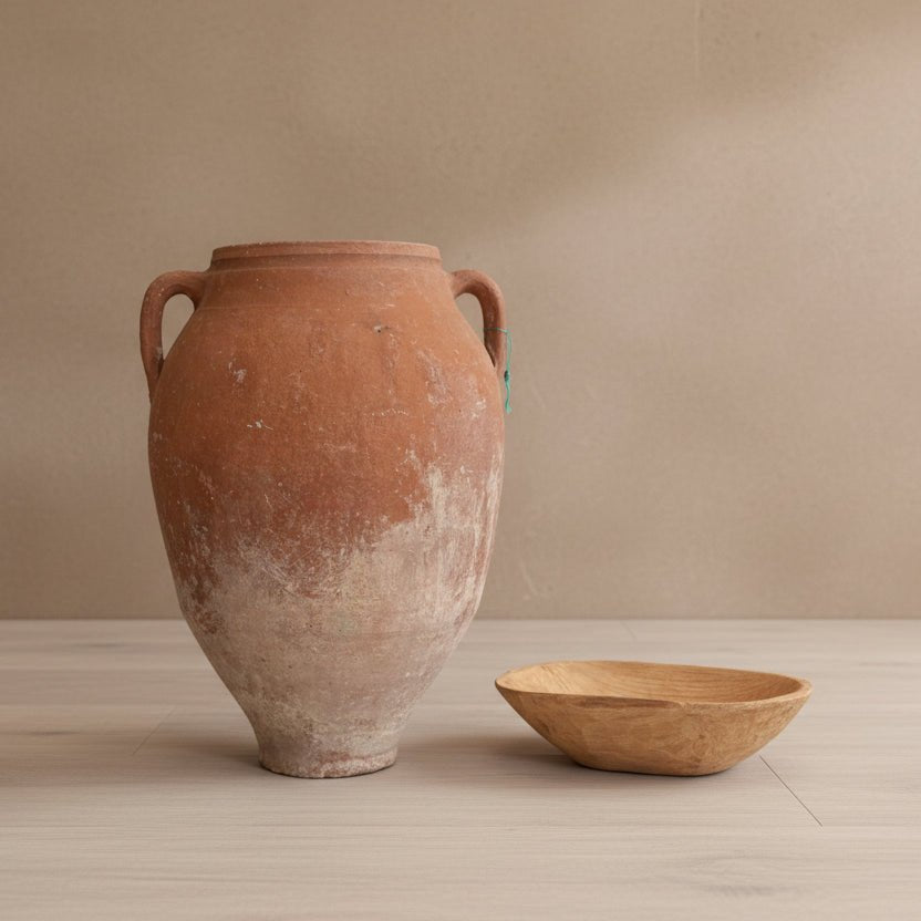 This original, solid and heavy vessel is exactly as shown. Originally used to store olive oil, it’s a one-of-a-kind piece that has weathered uniquely over time. Gathered layers of sediment paint and patina make it a stunning display piece.