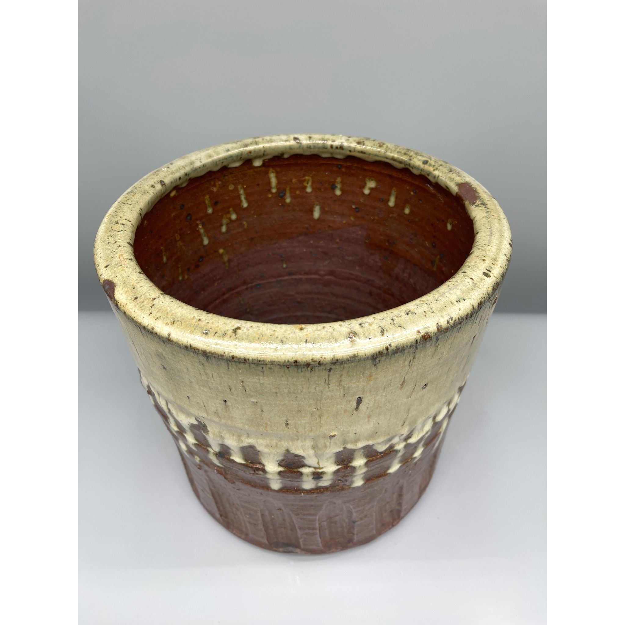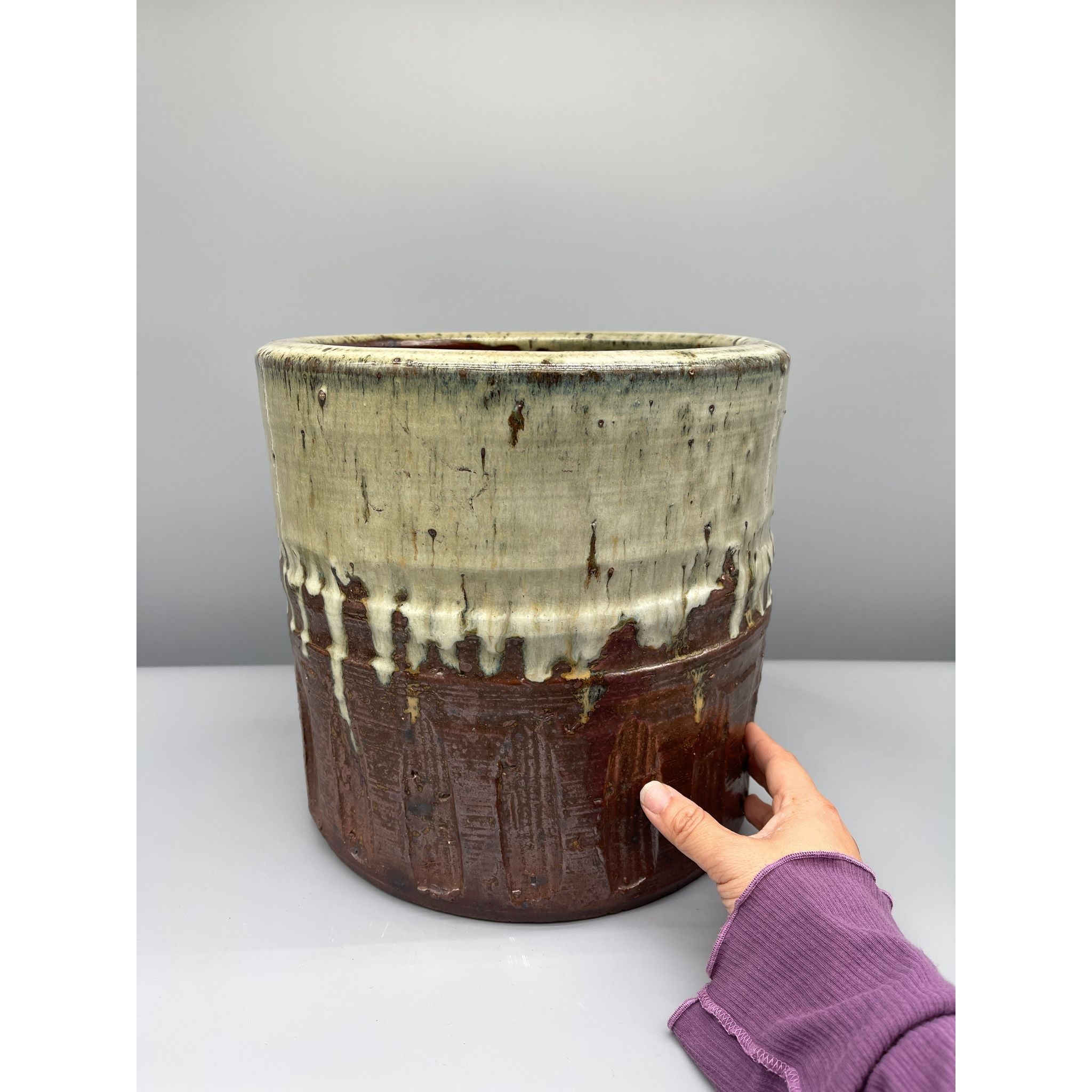 A vintage Japanese porcelain hibachi (charcoal brazier), featuring a two-tone drip glaze of thick brown / cream.