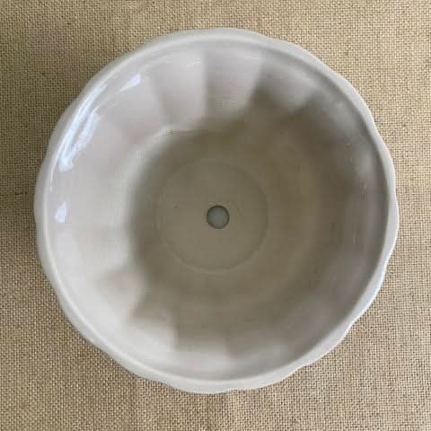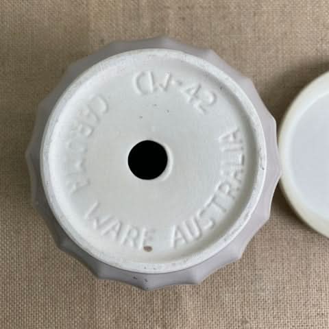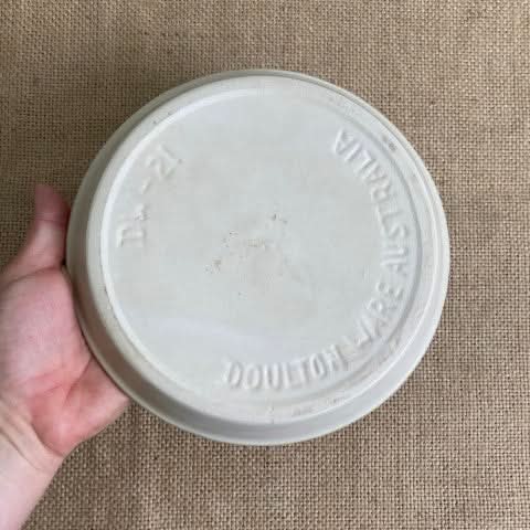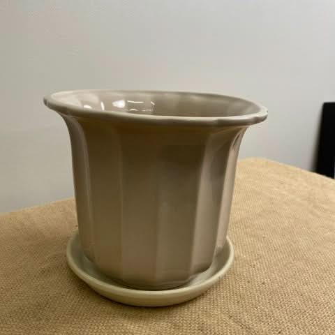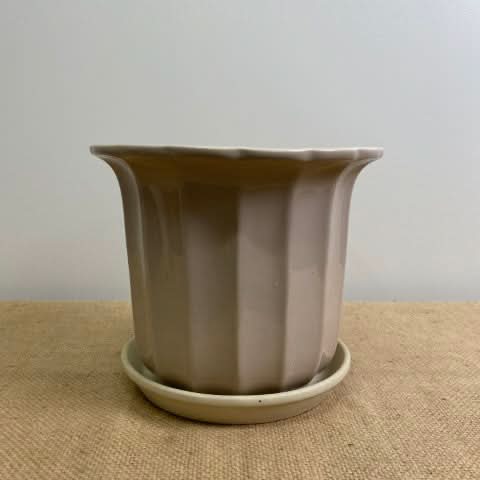 This retro Doultonware ceramic planter comes in a beige colour with a matching saucer. Made in England, it features clean 1970s styling with simple ribbed sides and a classic form—an iconic piece of vintage British pottery.