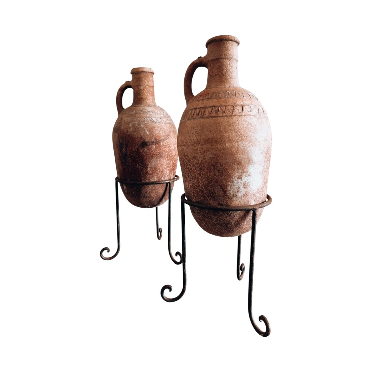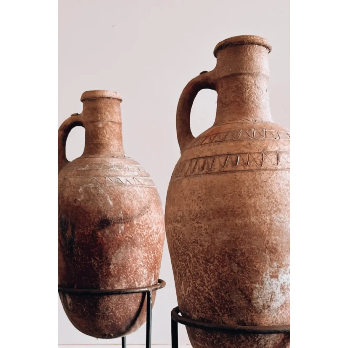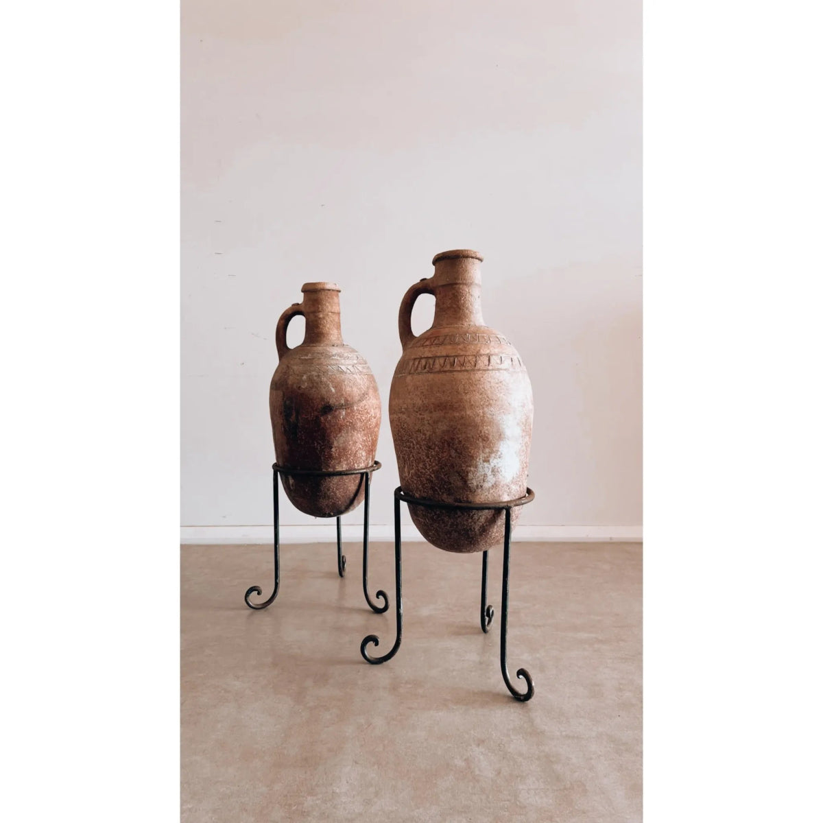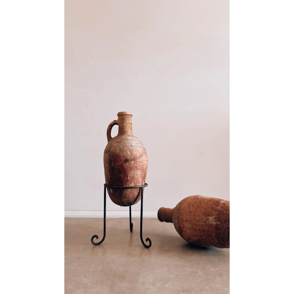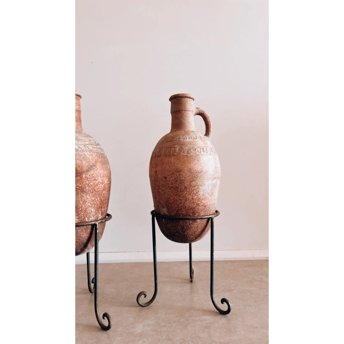 A pair of Moroccan vessels hand-thrown from coarse red clay, once used to store and cool water. Each carries layered mineral traces, firing variation, and faint incised markings reflecting Berber tradition.