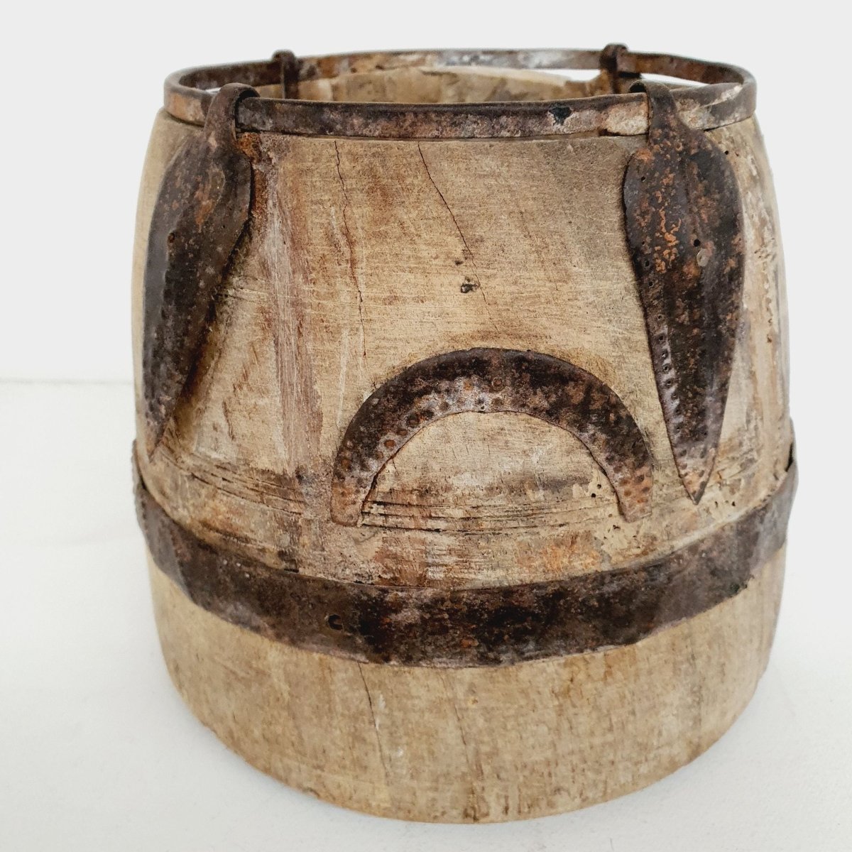 This Vintage Indian Wooden Pot from the Eco Village Collection showcases exquisite pressed metal detailing, reflecting skilled traditional craftsmanship. Crafted from durable wood, it combines functionality with artistic heritage, making it a refined decorative accent for collectors and enthusiasts of authentic cultural artifacts.