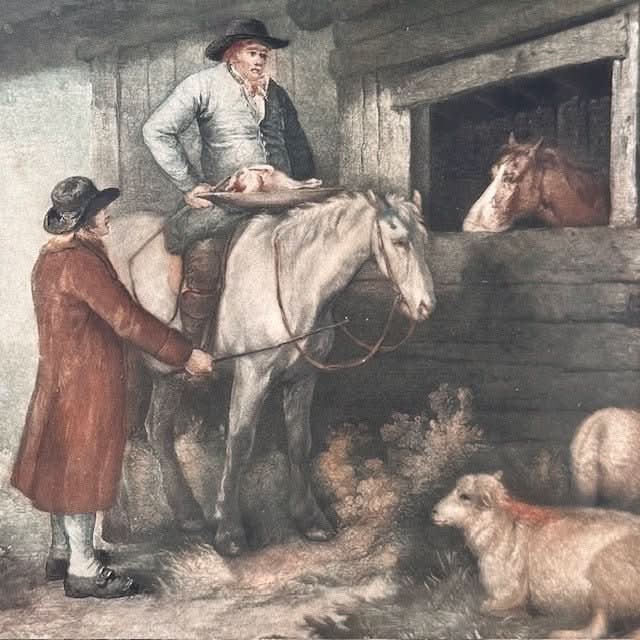A lovely framed antique print of a stable scene. Comes with a glass front.